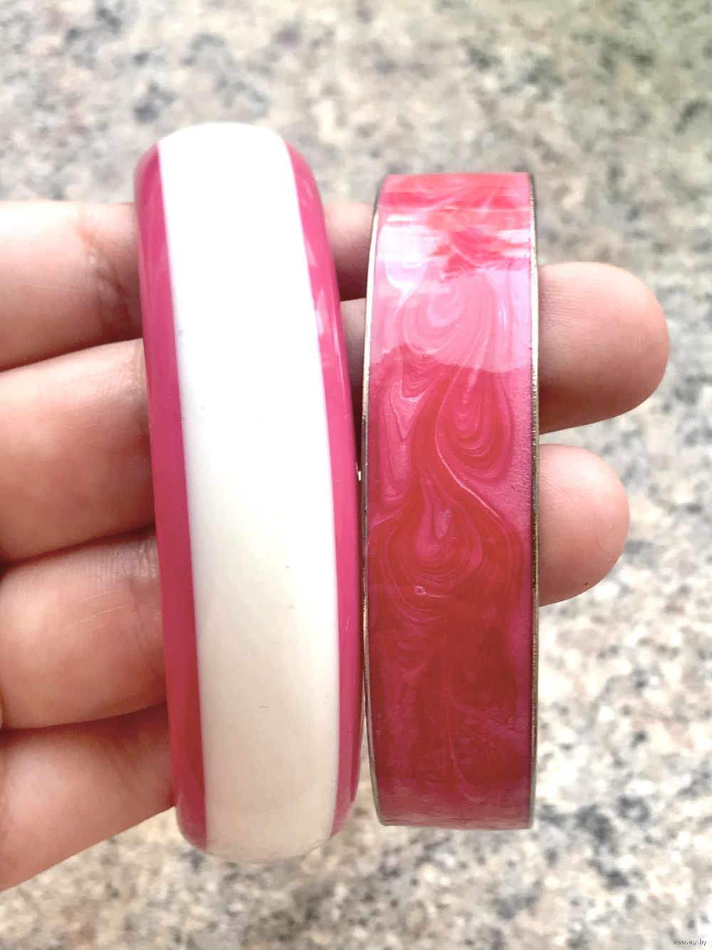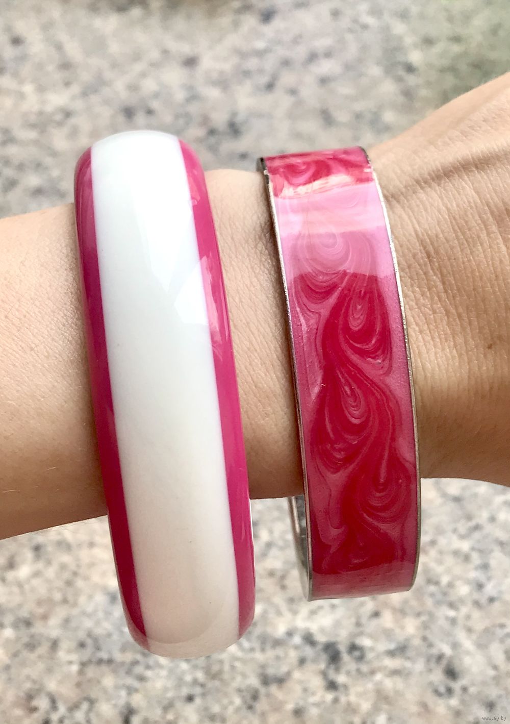 Браслеты, дополняющие друг друга. Браслет из пластика розового и белого цветов высотой 1,8см., диаметр 6,5см. Браслет с основой из металла и эмалью на лицевой стороне, высота 1,5см., диаметр 7см. Состояние хорошее.