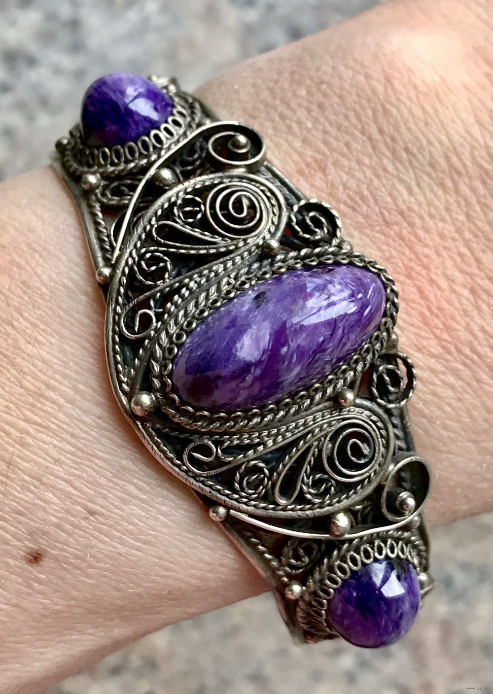 Браслет из мельхиора со вставками из чароита. Ширина центральной части 2,4см., размер центральной вставки 1,8х0,8см., диаметр боковых 1см. Размер регулируется. Состояние хорошее.