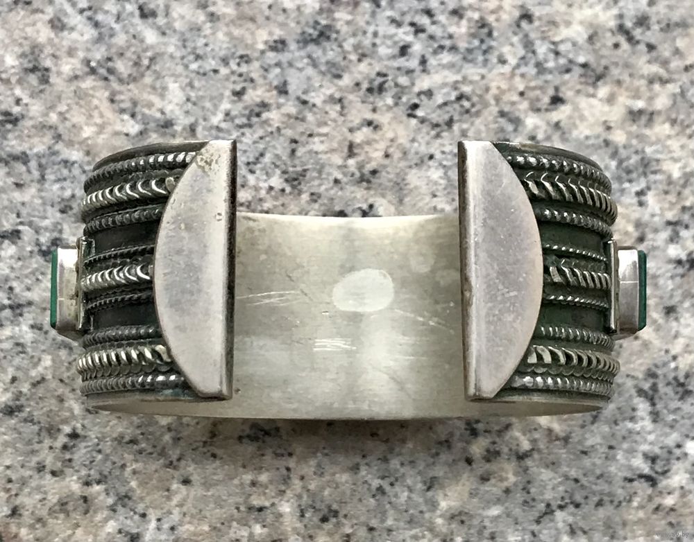 Крупный эффектный браслет-манжета из мельхиора со вставками малахита. Авторская работа. Высота браслета 2,7см., на одной малахитовой вставке есть трещина, в одном месте немного отпаялся декоративный элемент . Все нюансы учтены в цене.