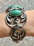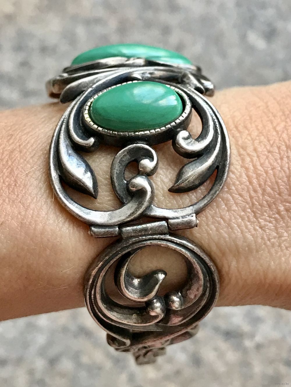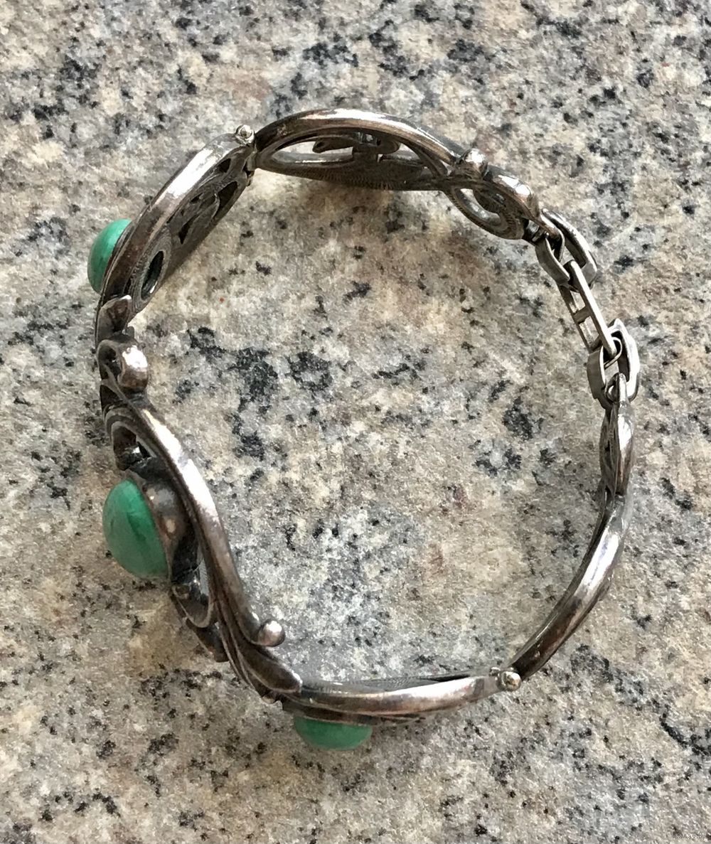 Крупный эффектный браслет с основой из бижутерного сплава с серебряным покрытием и малахитовыми вставками. Jenavi. Браслет разъемный, в закрытом виде имеет овальную форму размером 5,5х5см.(длина браслета 16,5см.), высота центральной части 3см. Не на широкое запястье. Состояние хорошее.