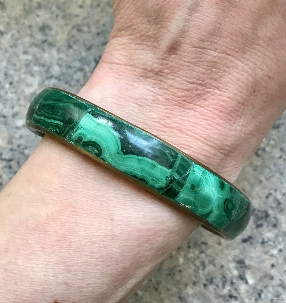 Крупный винтажный браслет с основой из латуни, лицевая сторона украшена пластинами из малахита (на камне имеются неровности естественного происхождения). Высота браслета 1,2см., вн. диаметр 6,5см. Тяжёленький.