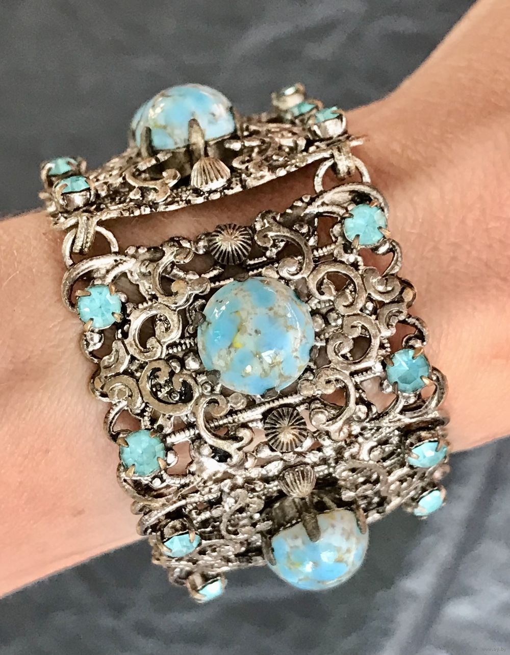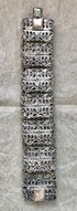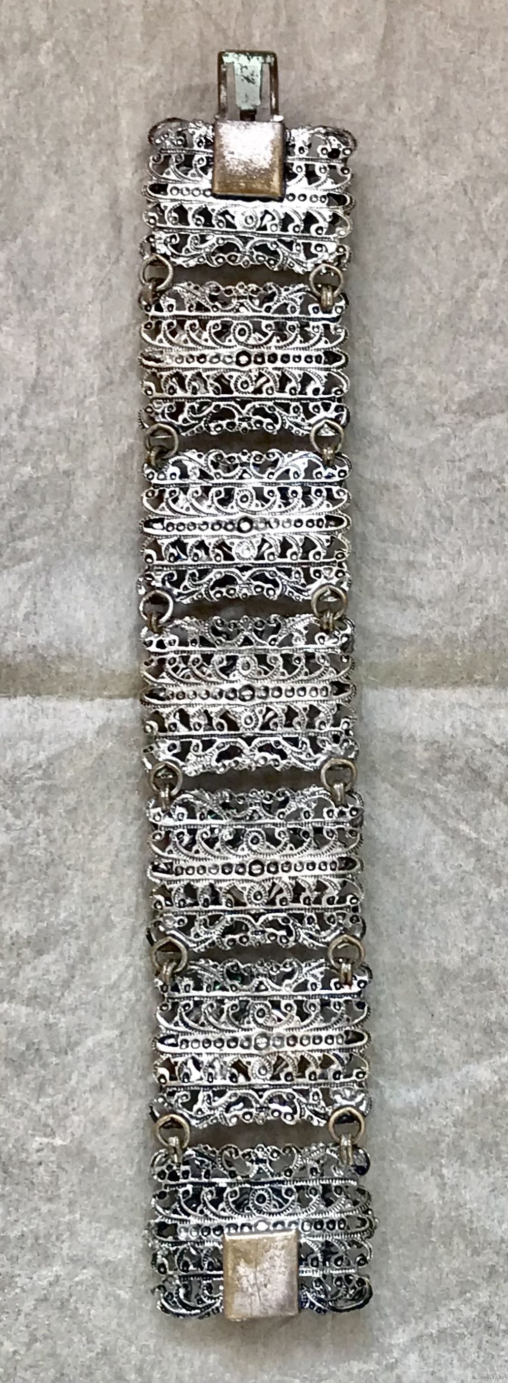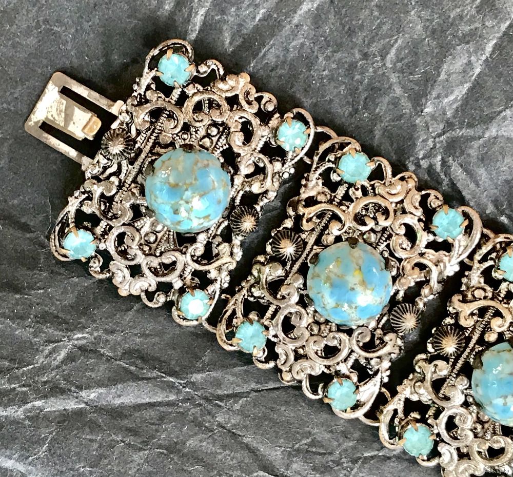 Винтажный браслет (Чехословакия 60-е гг. ) выполнен методом штампования из латуни под филигрань с покрытием под серебро, вставки- художественное стекло и кристаллы. Длина браслета 16см., звено 3х2см., подойдёт на узкое запястье. Состояние хорошее.