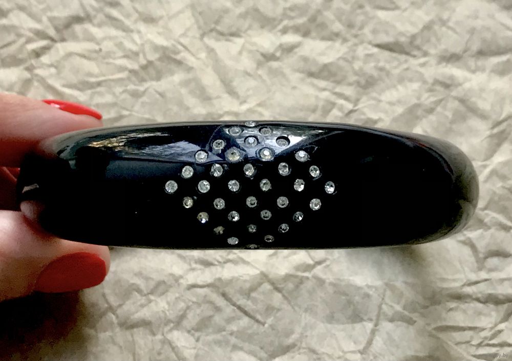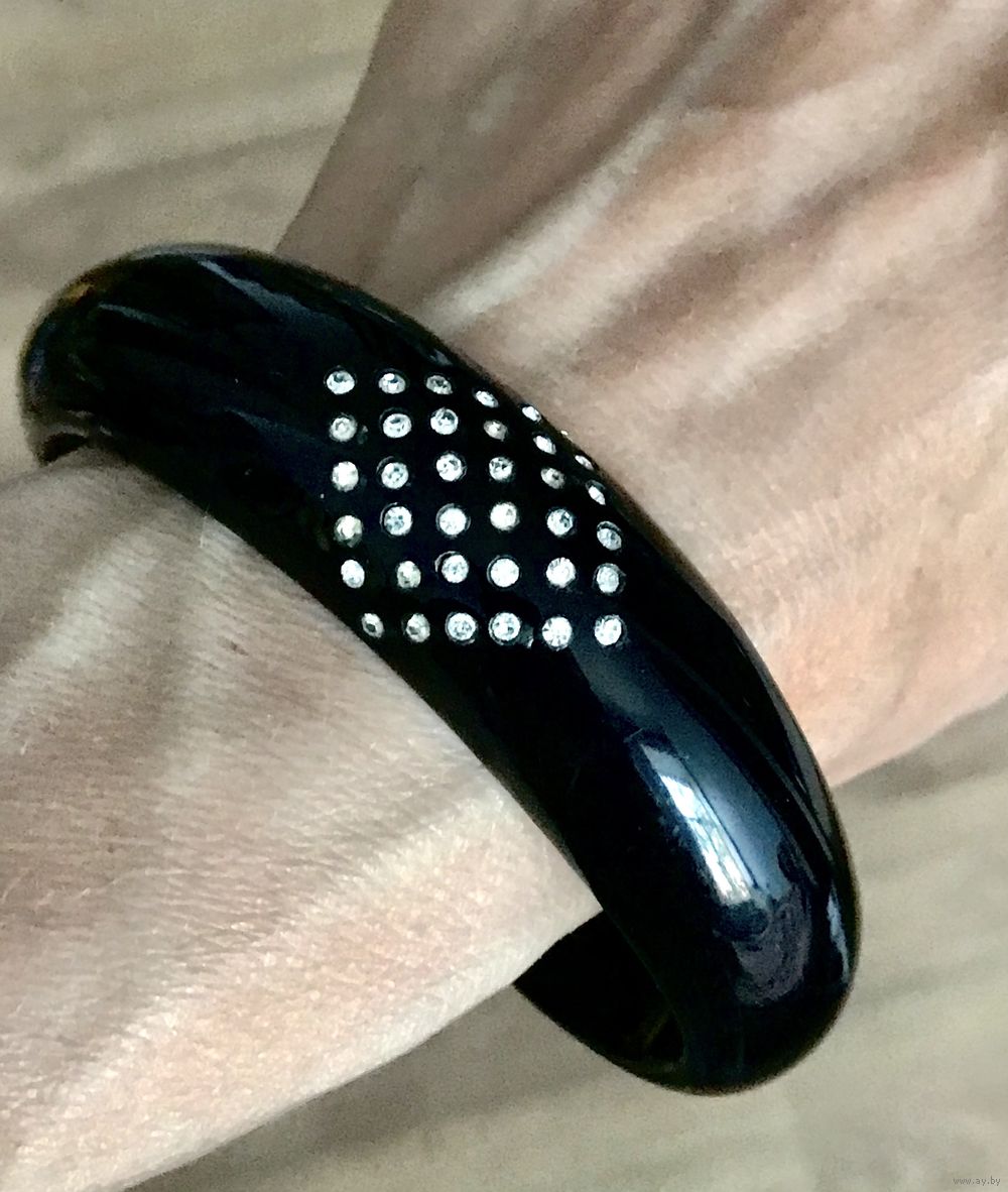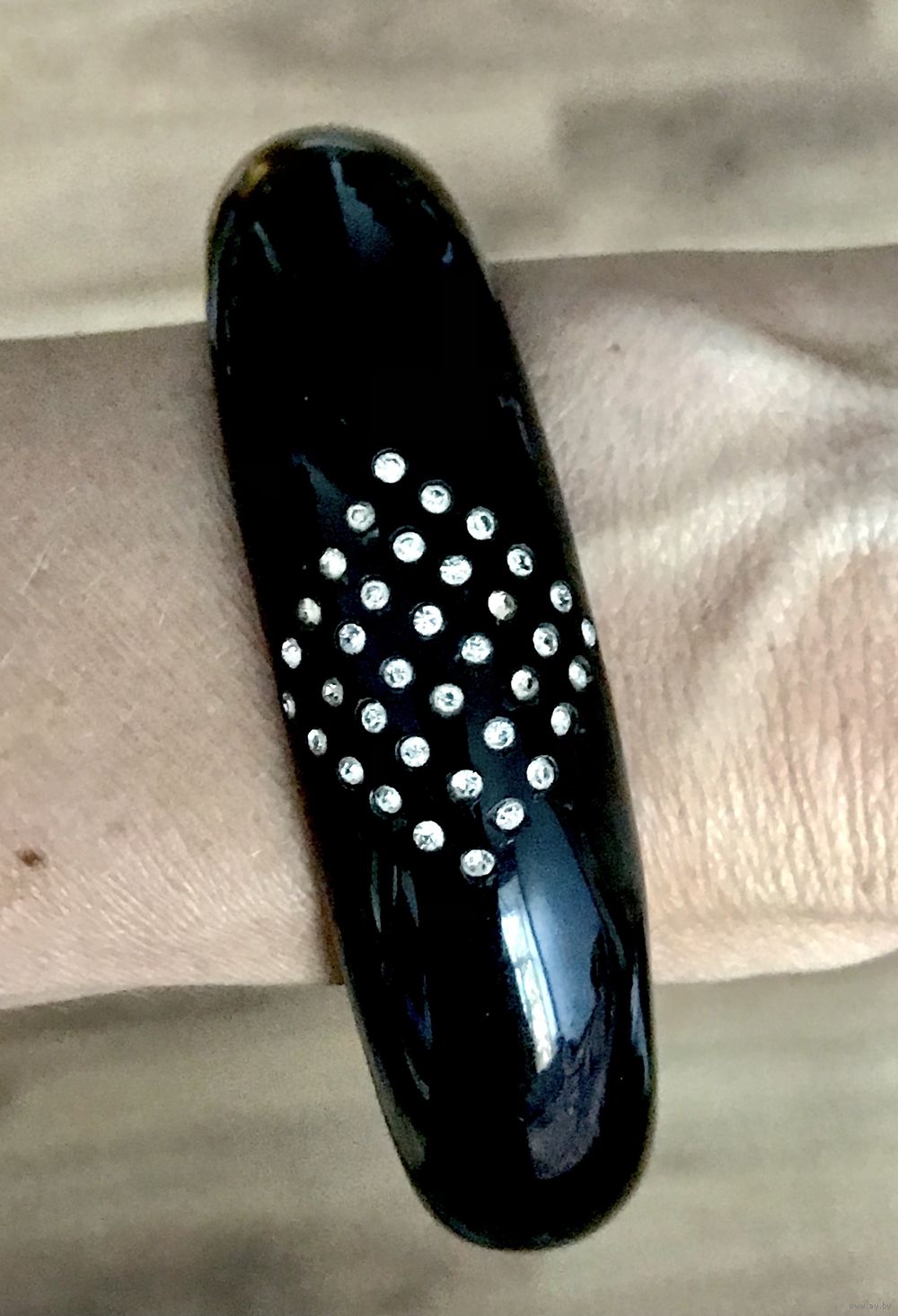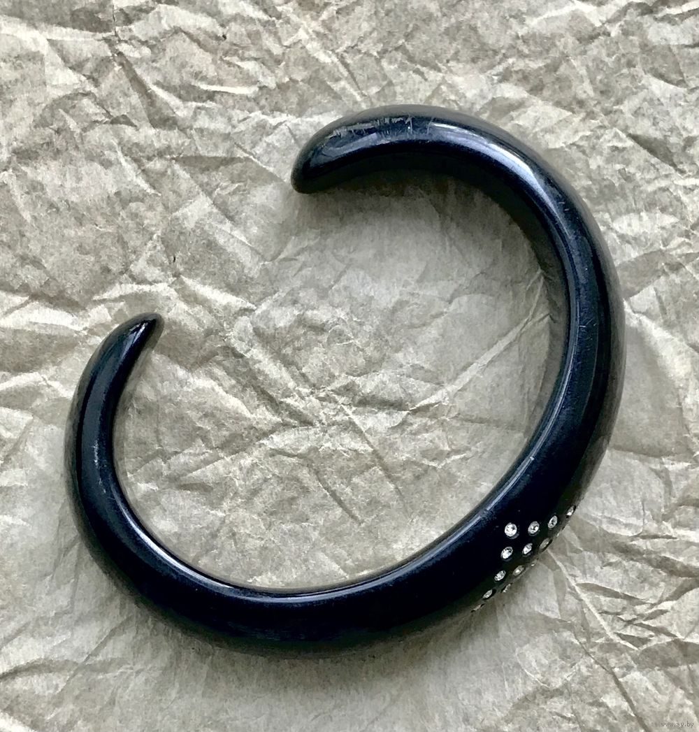 Браслет из плотного пластика чёрного цвета, лицевая сторона украшена кристаллами. Высота по центру 2см., вн.диаметр 7см., расстояние между краями браслета 2,5см. Имеются следы ношения.