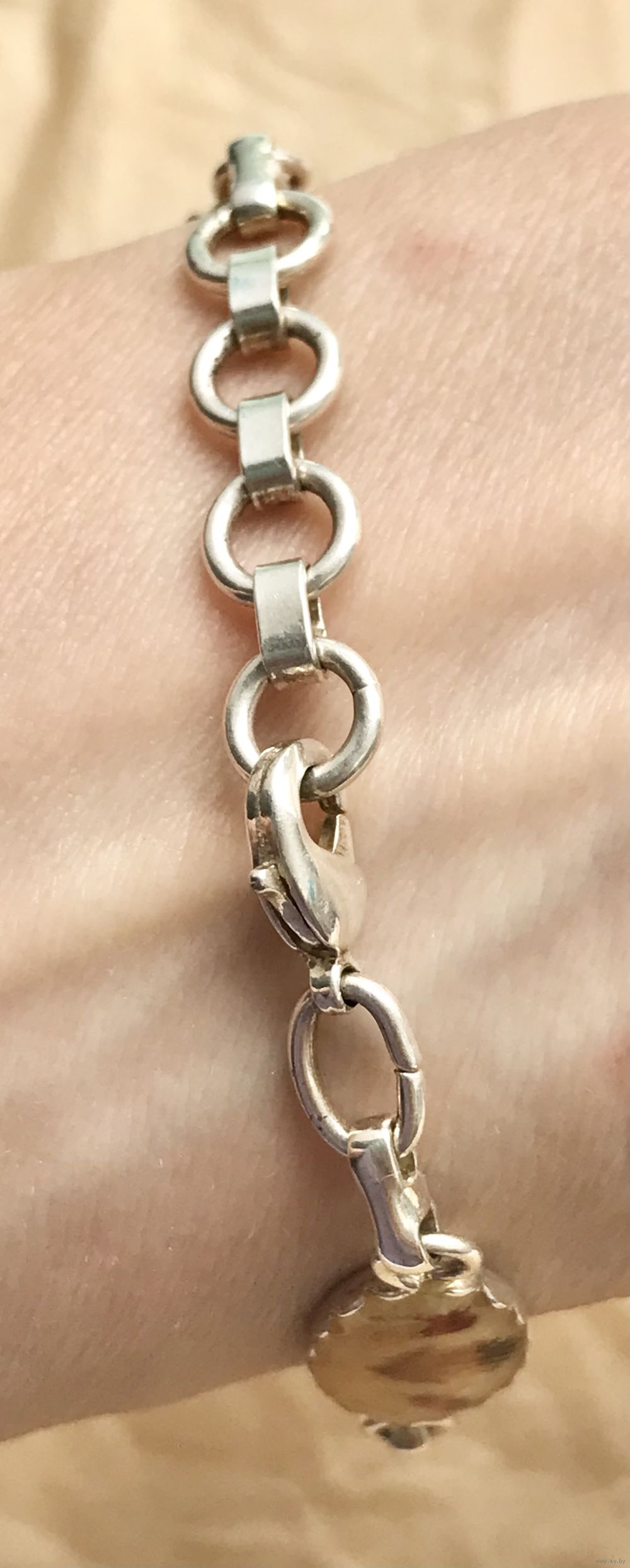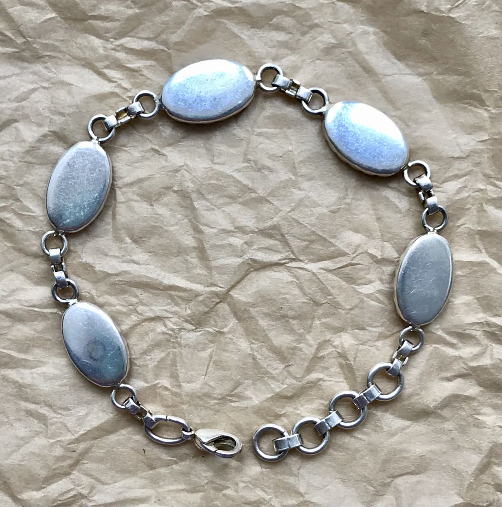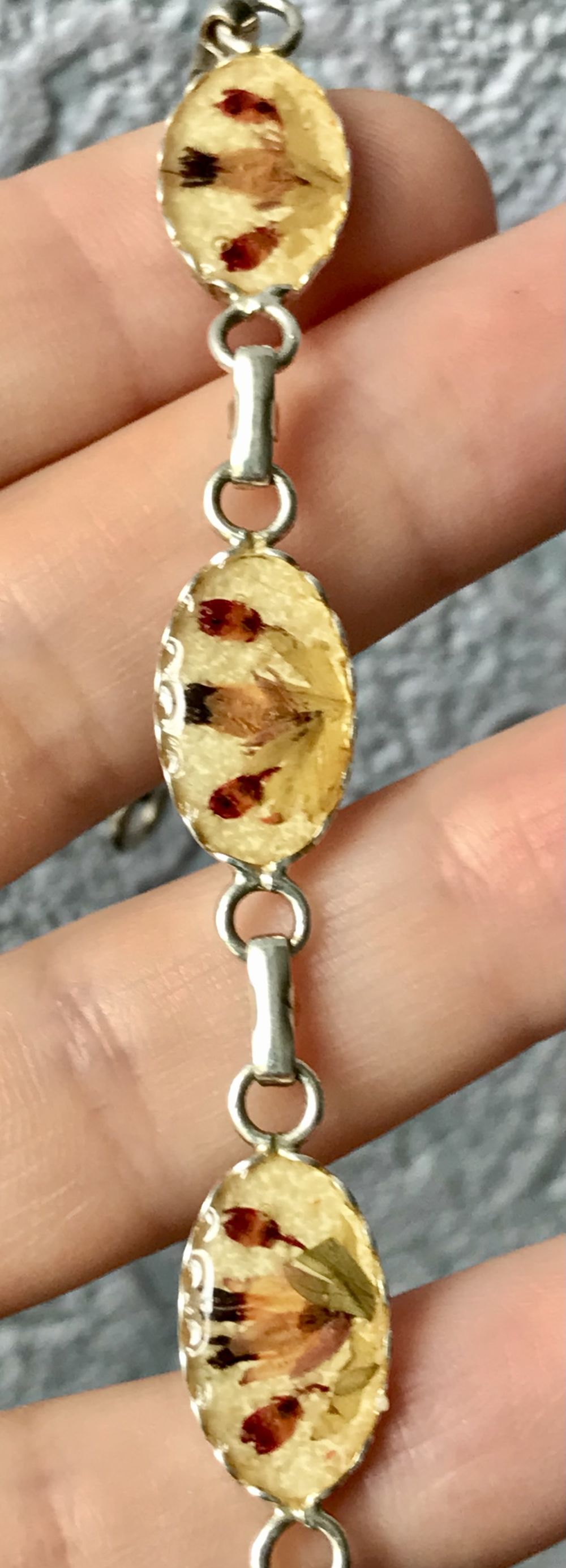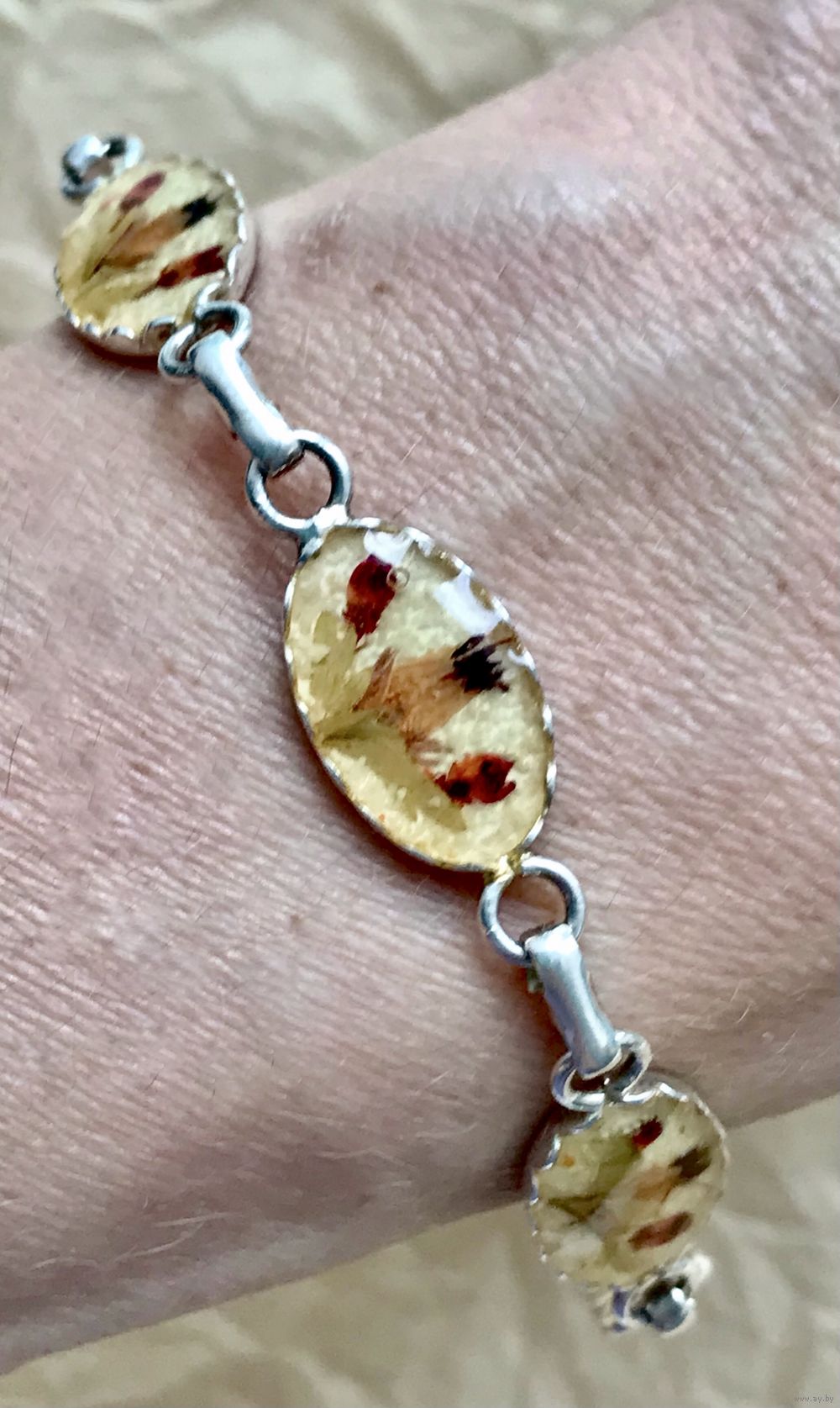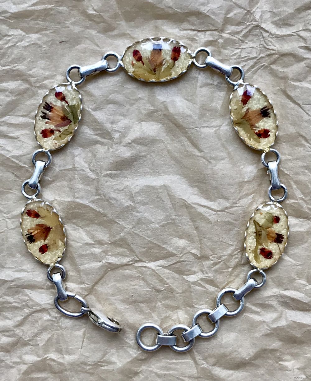 Браслет с основой из серебра (отметок нет, металл проверен в юв.мастерской). Вставки из сухих цветов в юв.смоле. Минимальная длина браслета 17,5см., максимальная 20см., высота браслета 1см. Состояние хорошее.