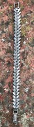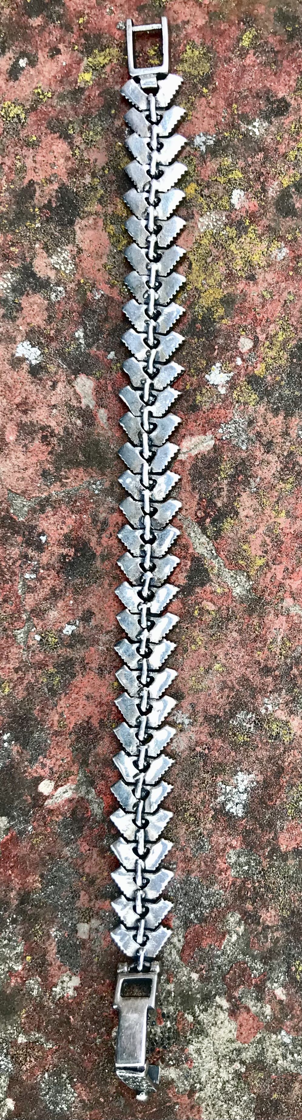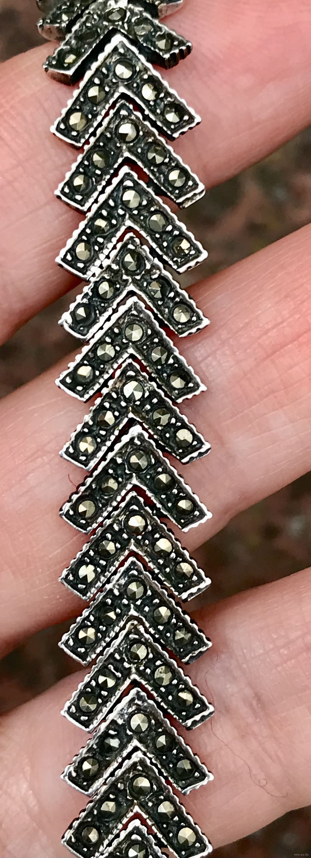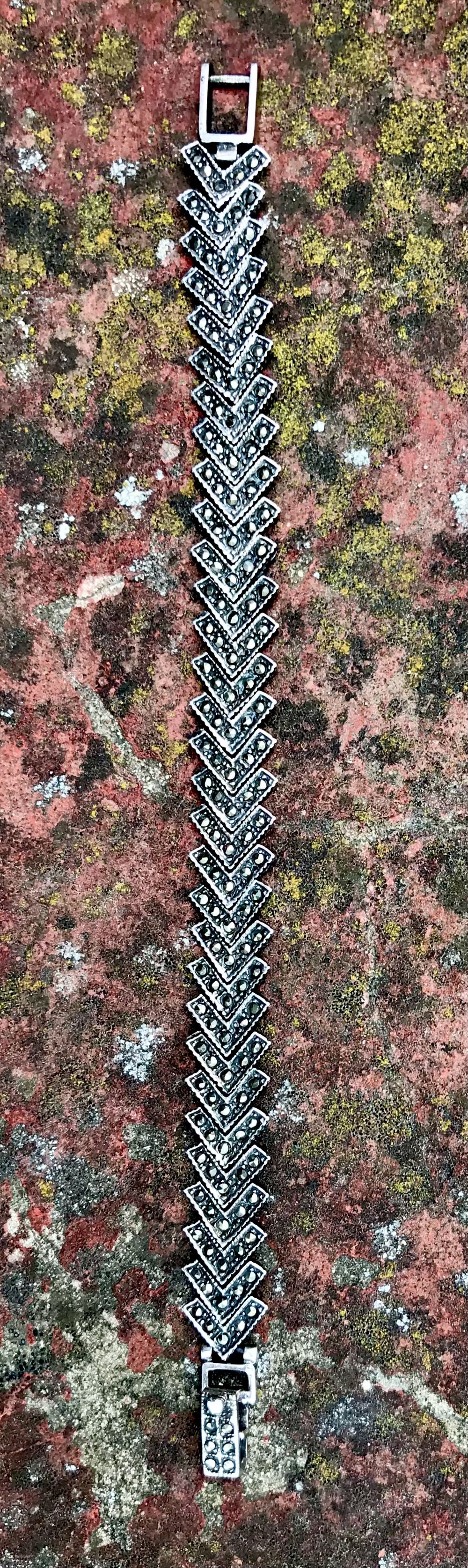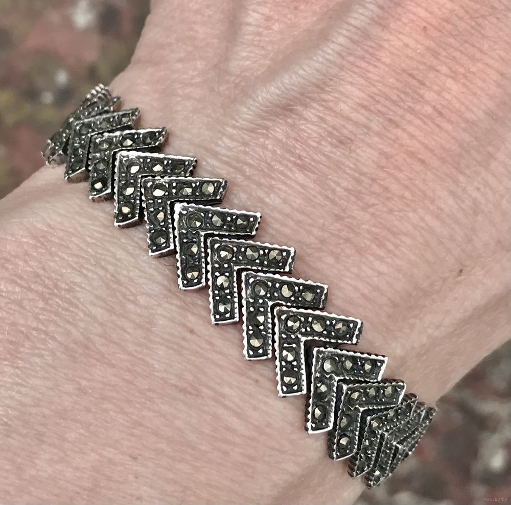 Винтажный браслет из серебра 925пр., на лицевой стороне вставки из марказитов. Длина браслета 18см., высота 1,2см., вес 19,44гр. Все вставки на месте. Состояние хорошее.