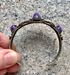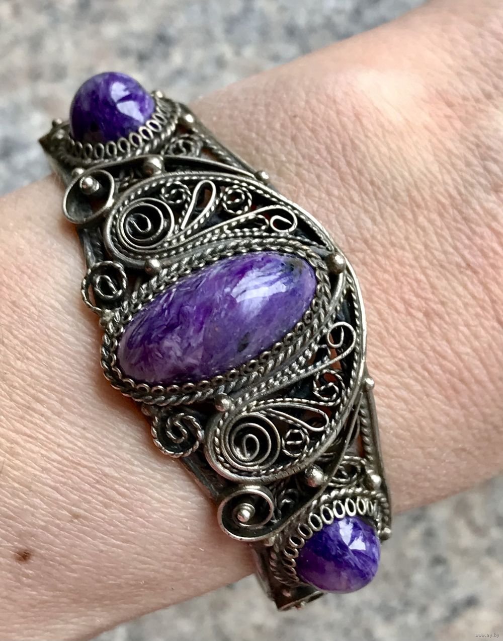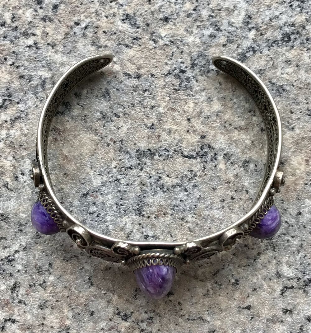 Браслет из мельхиора со вставками из чароита. Ширина центральной части 2,4см., размер центральной вставки 1,8х0,8см., диаметр боковых 1см. Размер регулируется. Состояние хорошее.