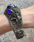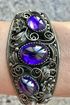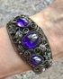 Крупный винтажный браслет с основой из мельхиора и вставками из художественного стекла. В закрытом виде браслет имеет овальную форму размером 5,5х6см., высота центральной части 3см., разъемный. Была произведена замена крепления. Состояние хорошее.