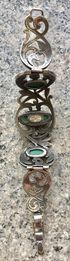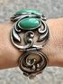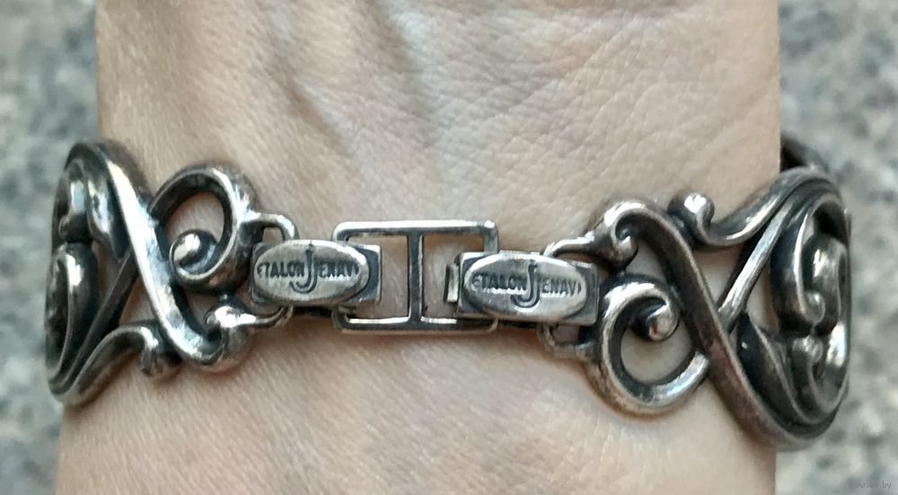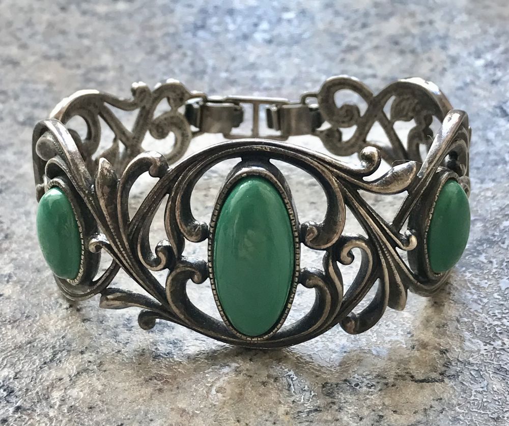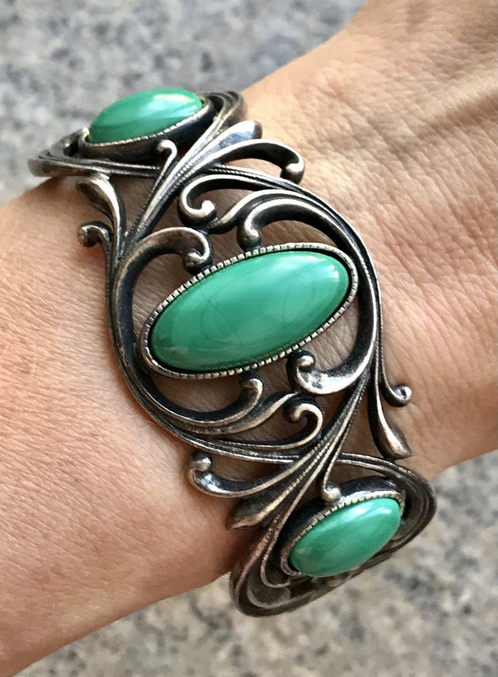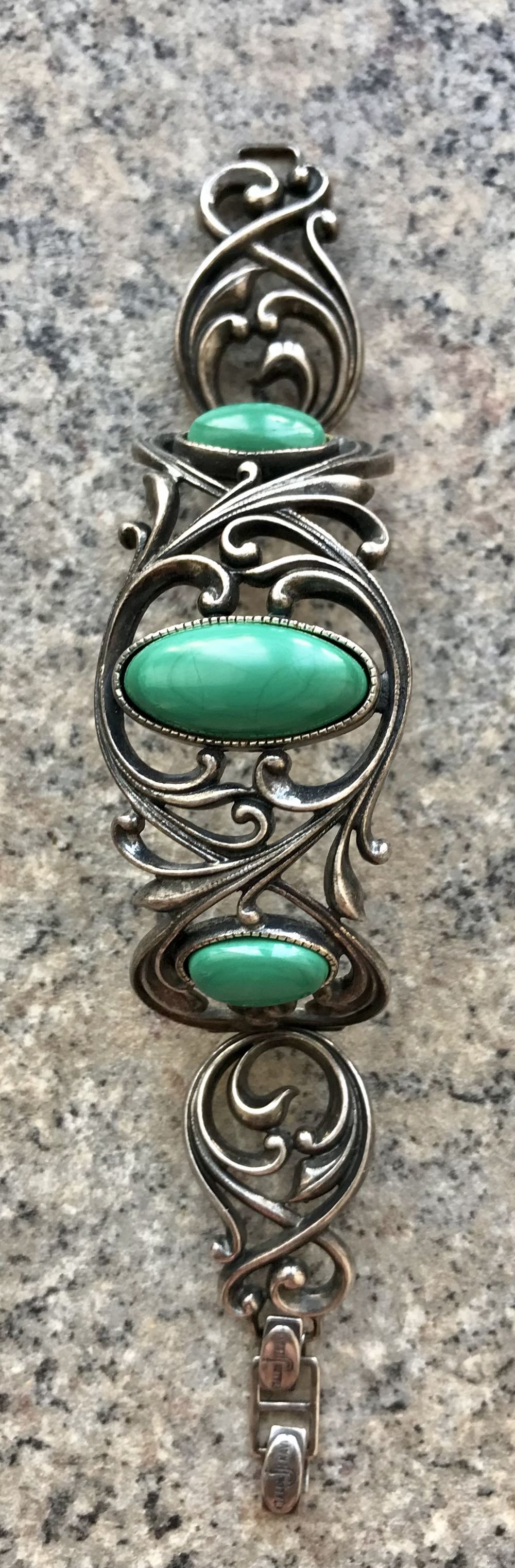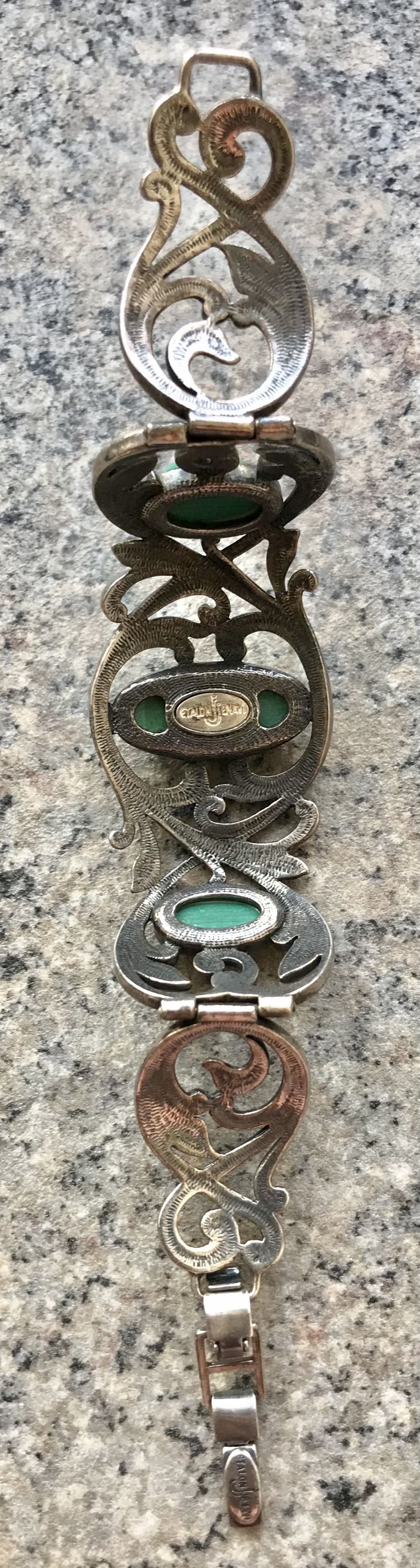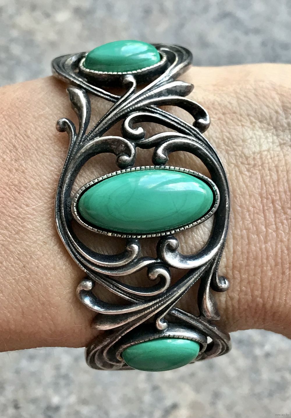 Крупный эффектный браслет с основой из бижутерного сплава с серебряным покрытием и малахитовыми вставками. Jenavi. Браслет разъемный, в закрытом виде имеет овальную форму размером 5,5х5см.(длина браслета 16,5см.), высота центральной части 3см. Не на широкое запястье. Состояние хорошее.