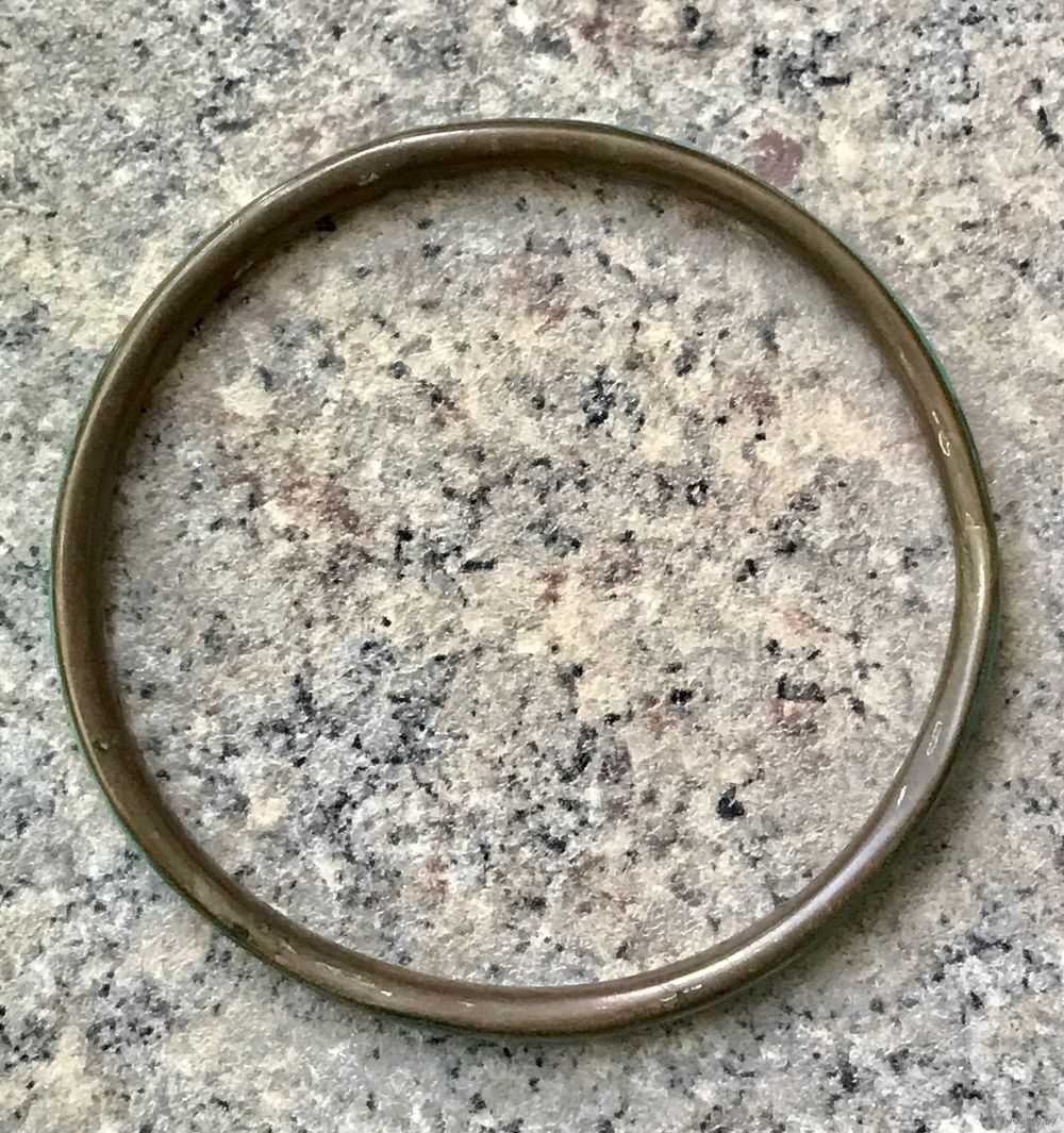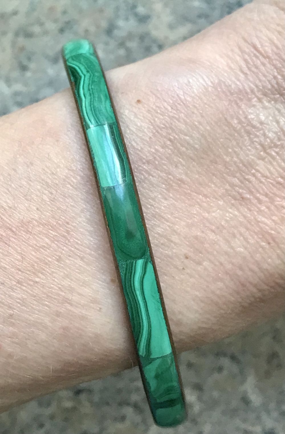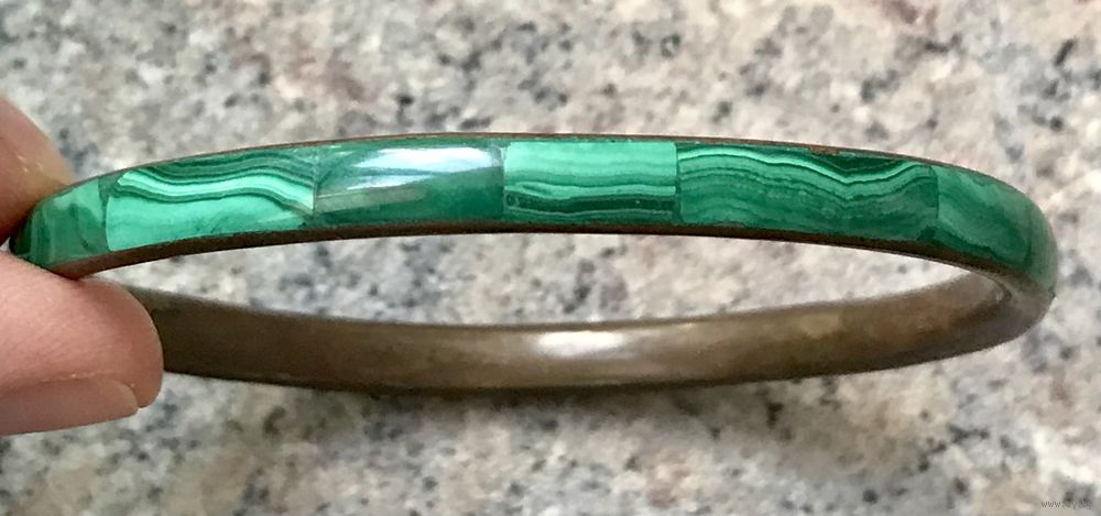 Винтажный браслет с основой из латуни, лицевая сторона украшена пластинами из малахит. Высота браслета 0,6см., вн.диаметр 6,7см. Состояние хорошее.