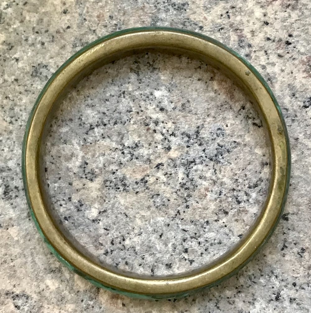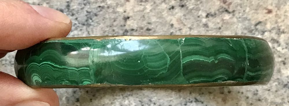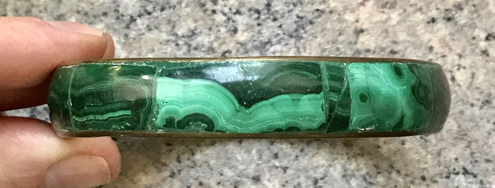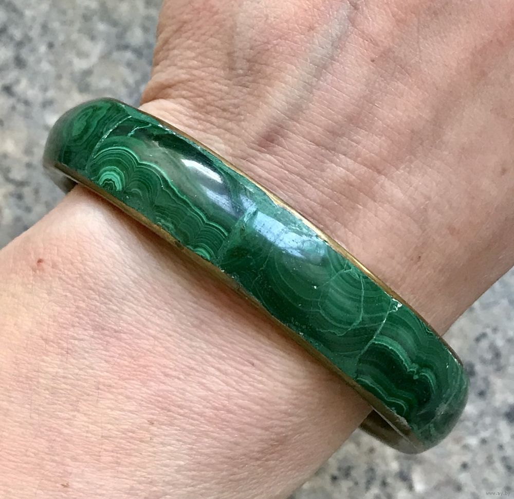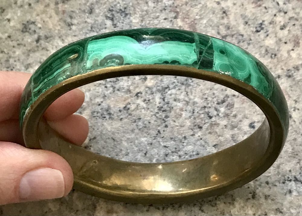 Крупный винтажный браслет с основой из латуни, лицевая сторона украшена пластинами из малахита (на камне имеются неровности естественного происхождения). Высота браслета 1,2см., вн. диаметр 6,5см. Тяжёленький.