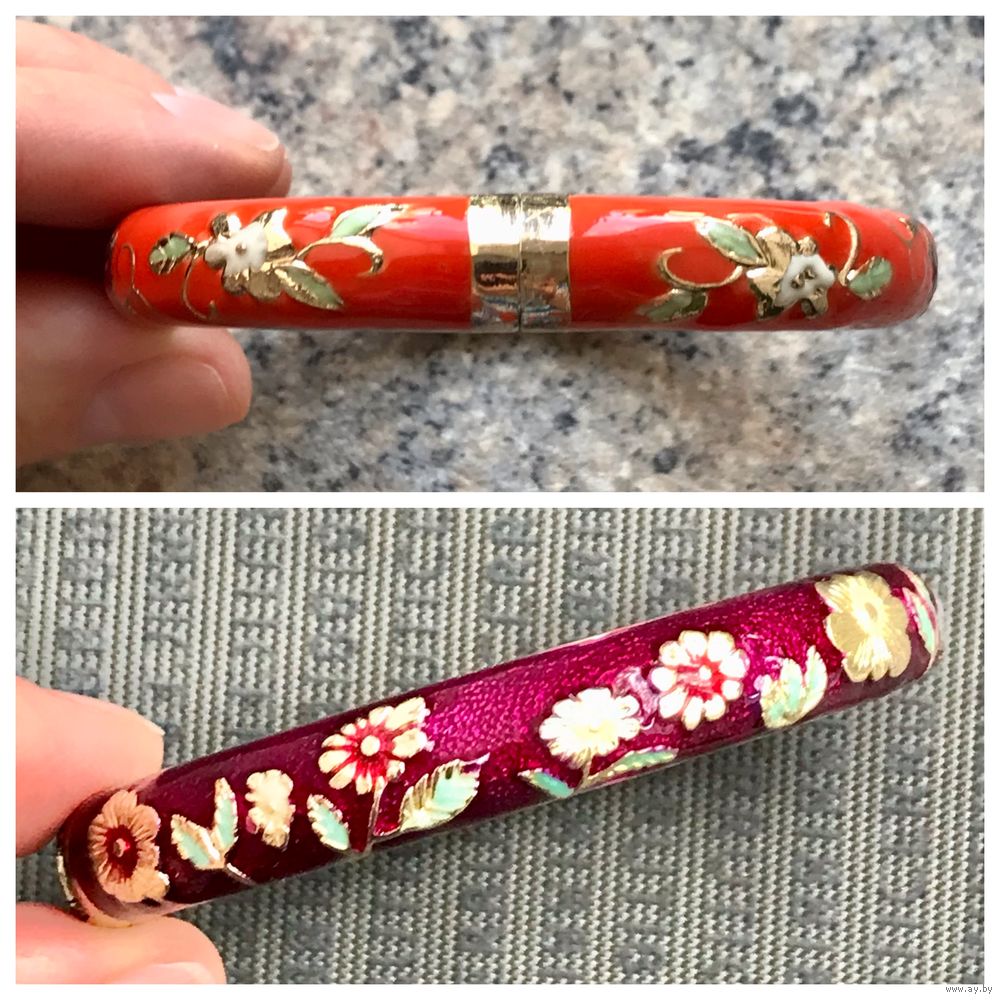 Винтажные браслеты - clamper от Jiu Long Xing. Выполнены из металла золотого тона. Декорированы цветной эмалью. Высота каждого браслета 0,9см., вн. диаметр 6см. Маркированы. Состояние хорошее.