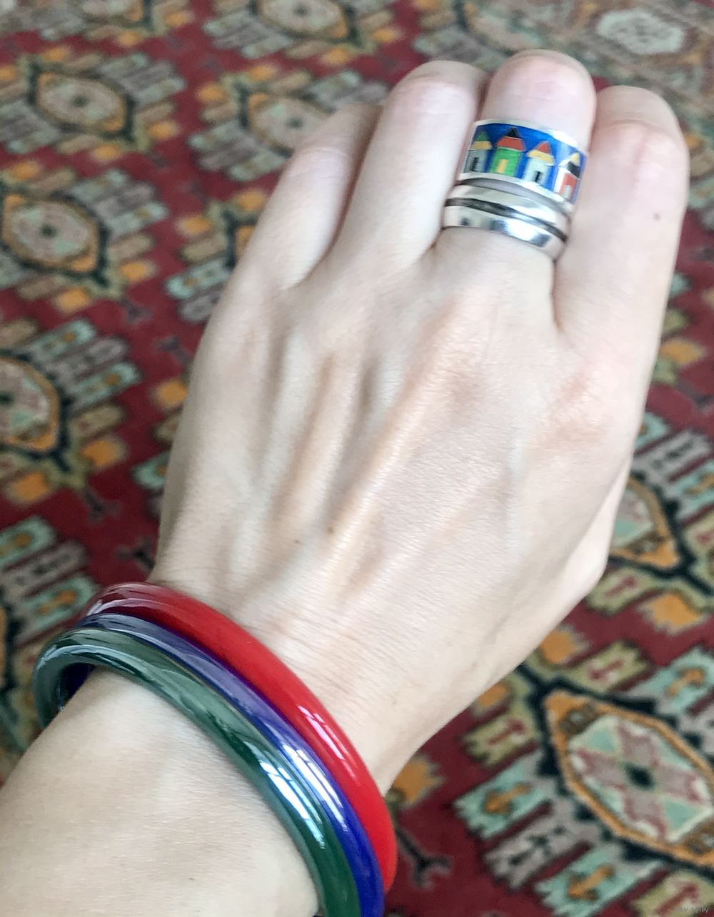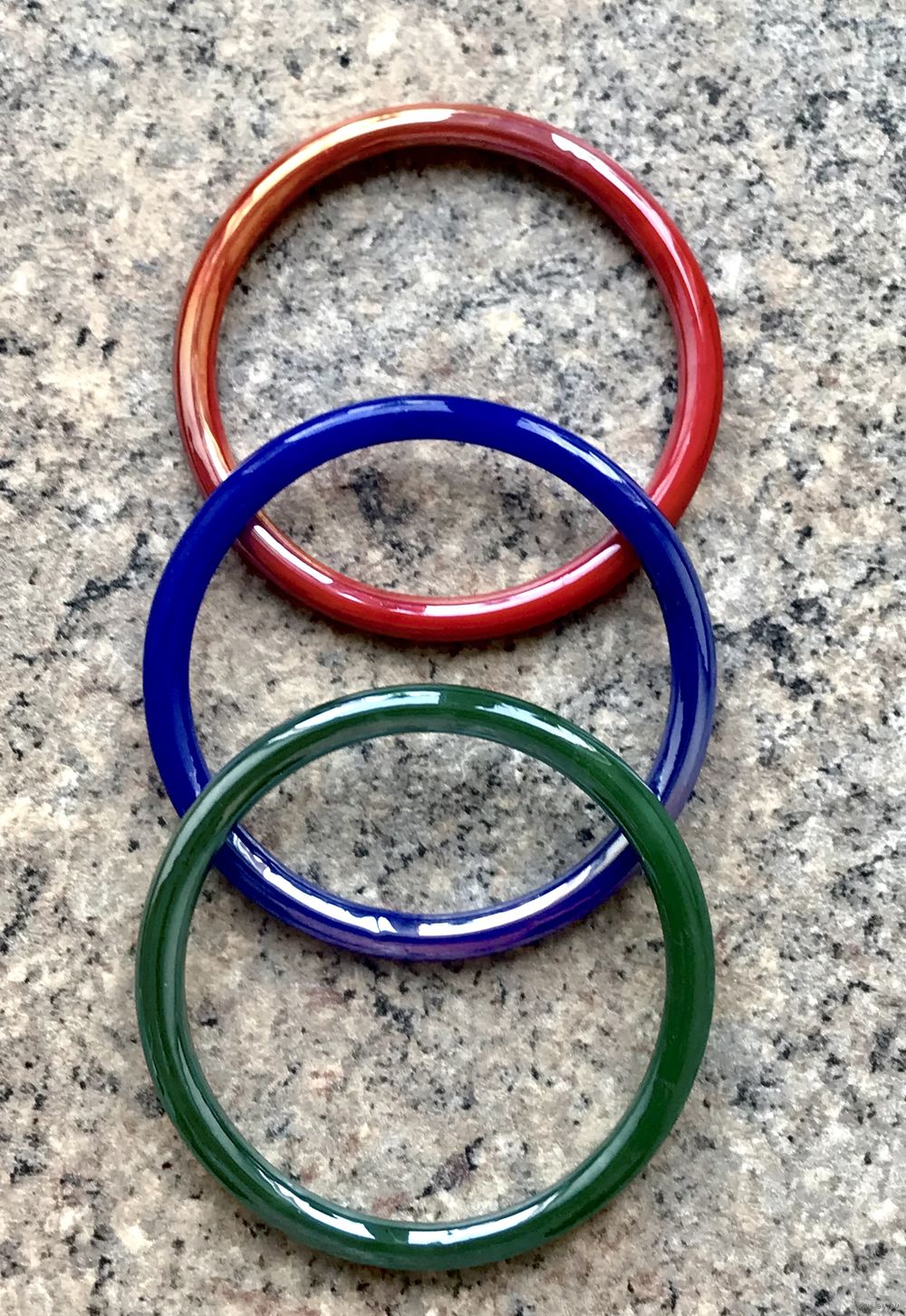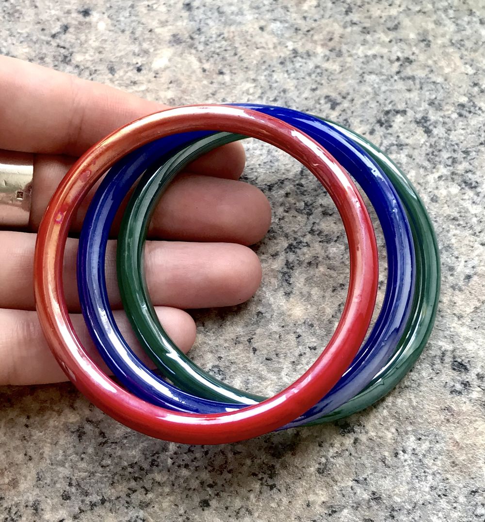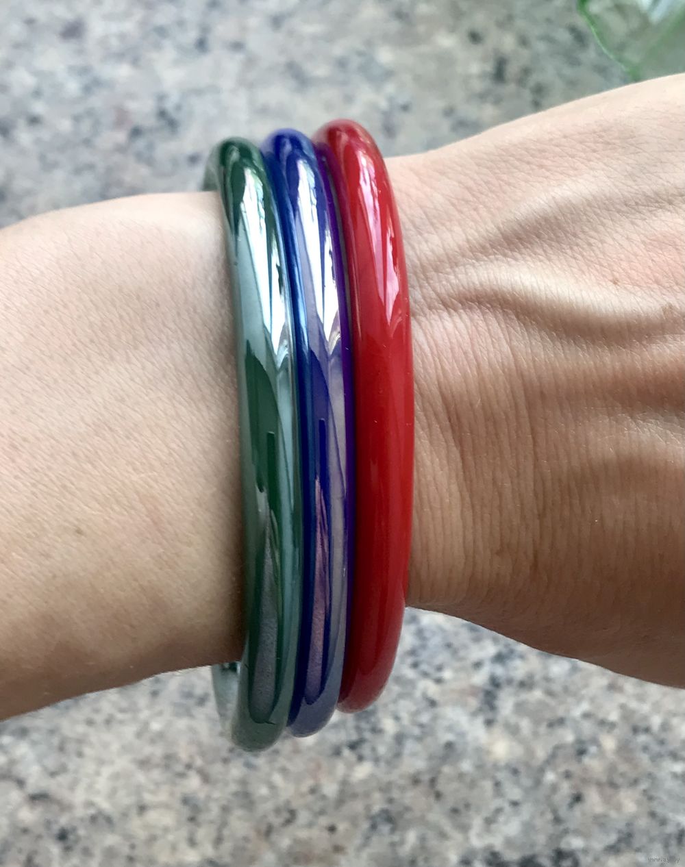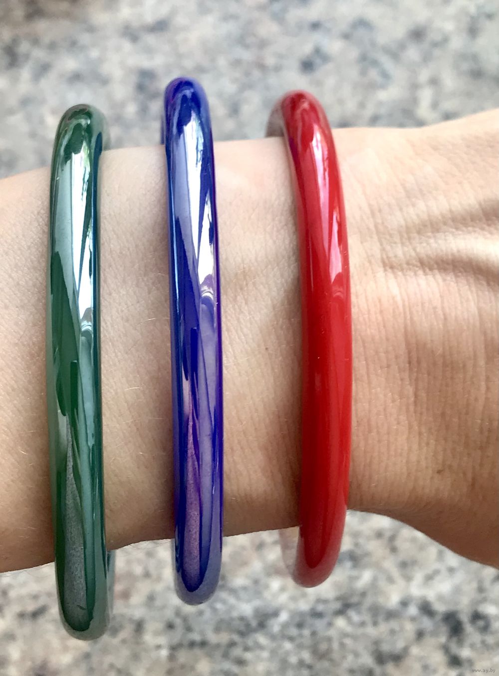 Яркие браслеты из цветного стекла с перламутровым блеском. Высота каждого 0,5см., вн.диаметр 6,5см. Состояние хорошее.