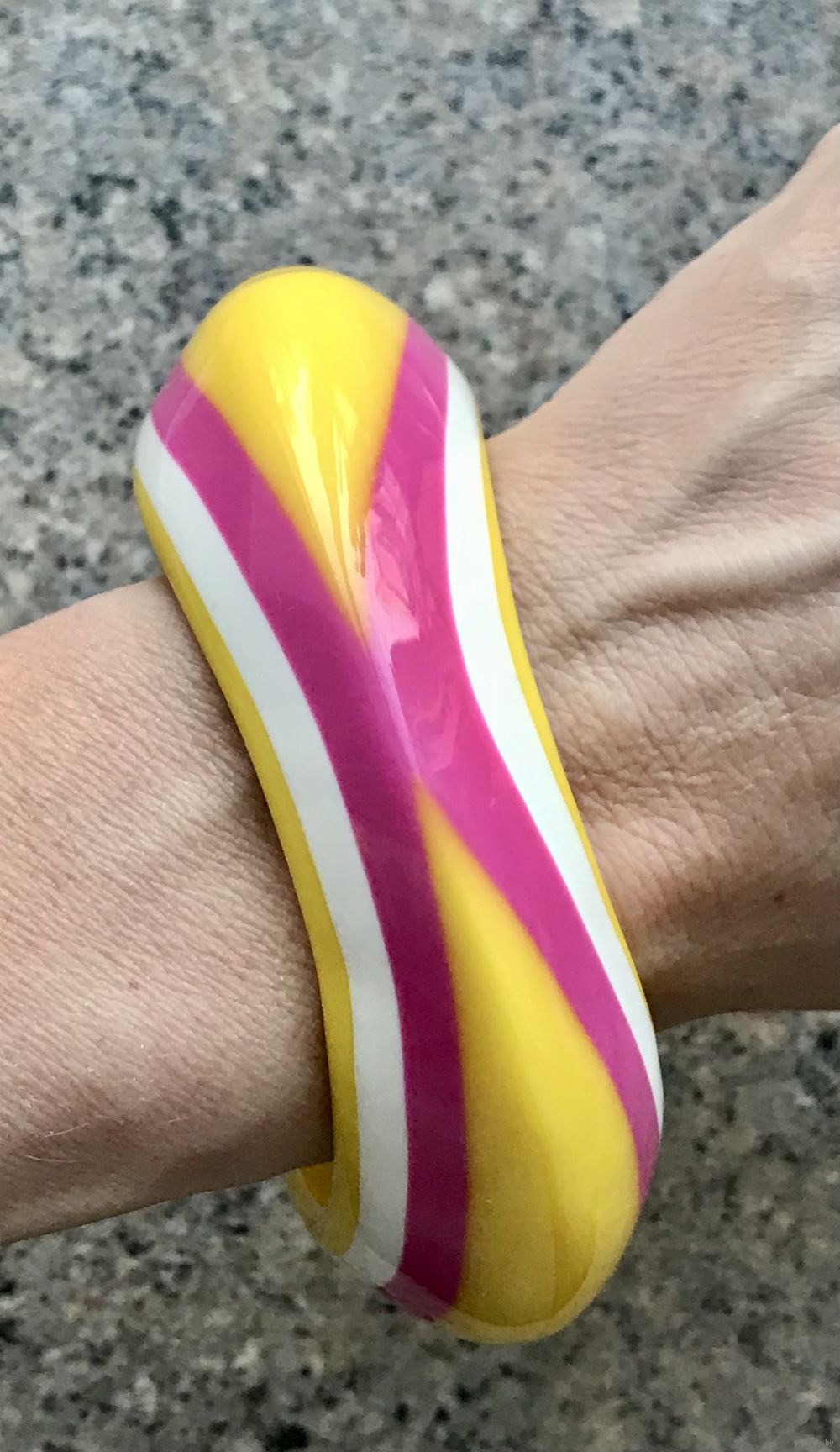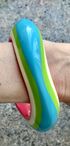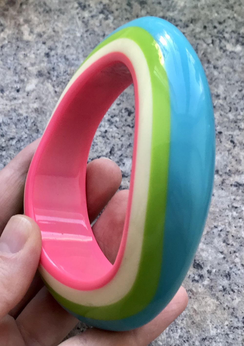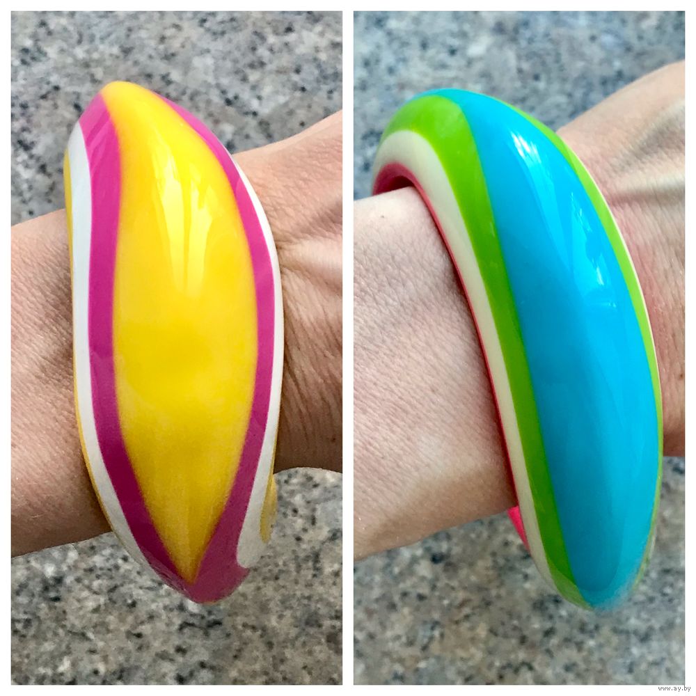 Крупные, эффектные, яркие браслеты из плотного пластика. Имеют волнистую форму, высота первого в самом узком месте 2см. в самом широком 3см., высота второго от 2 до 2,5см. Вн.диаметр каждого 6,7. Имеются незначительные следы носки. Очень приятные на ощупь,тяжёленькие.