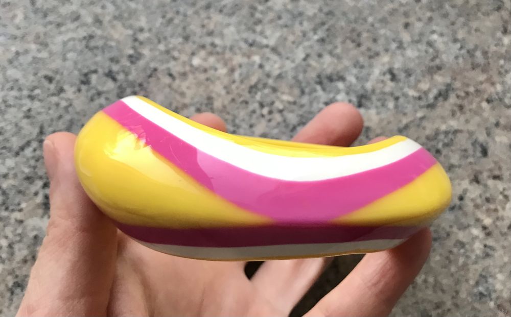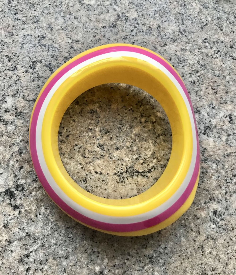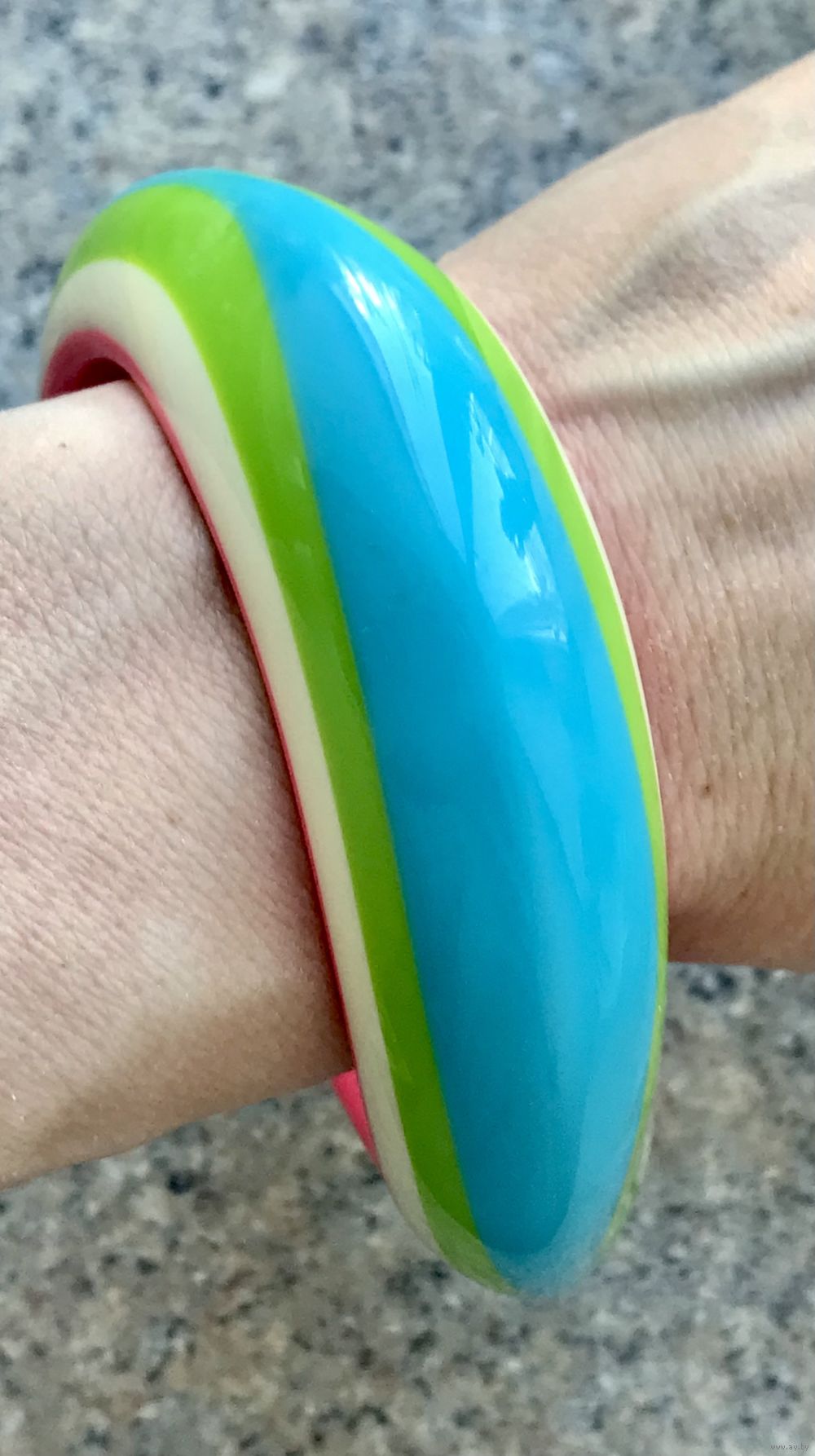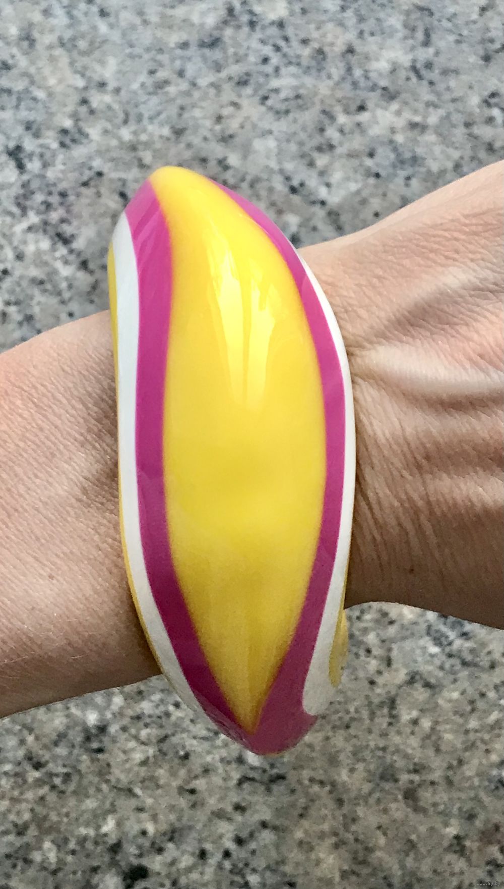Крупные, эффектные, яркие браслеты из плотного пластика. Имеют волнистую форму, высота первого в самом узком месте 2см. в самом широком 3см., высота второго от 2 до 2,5см. Вн.диаметр каждого 6,7. Имеются незначительные следы носки. Очень приятные на ощупь,тяжёленькие.