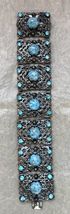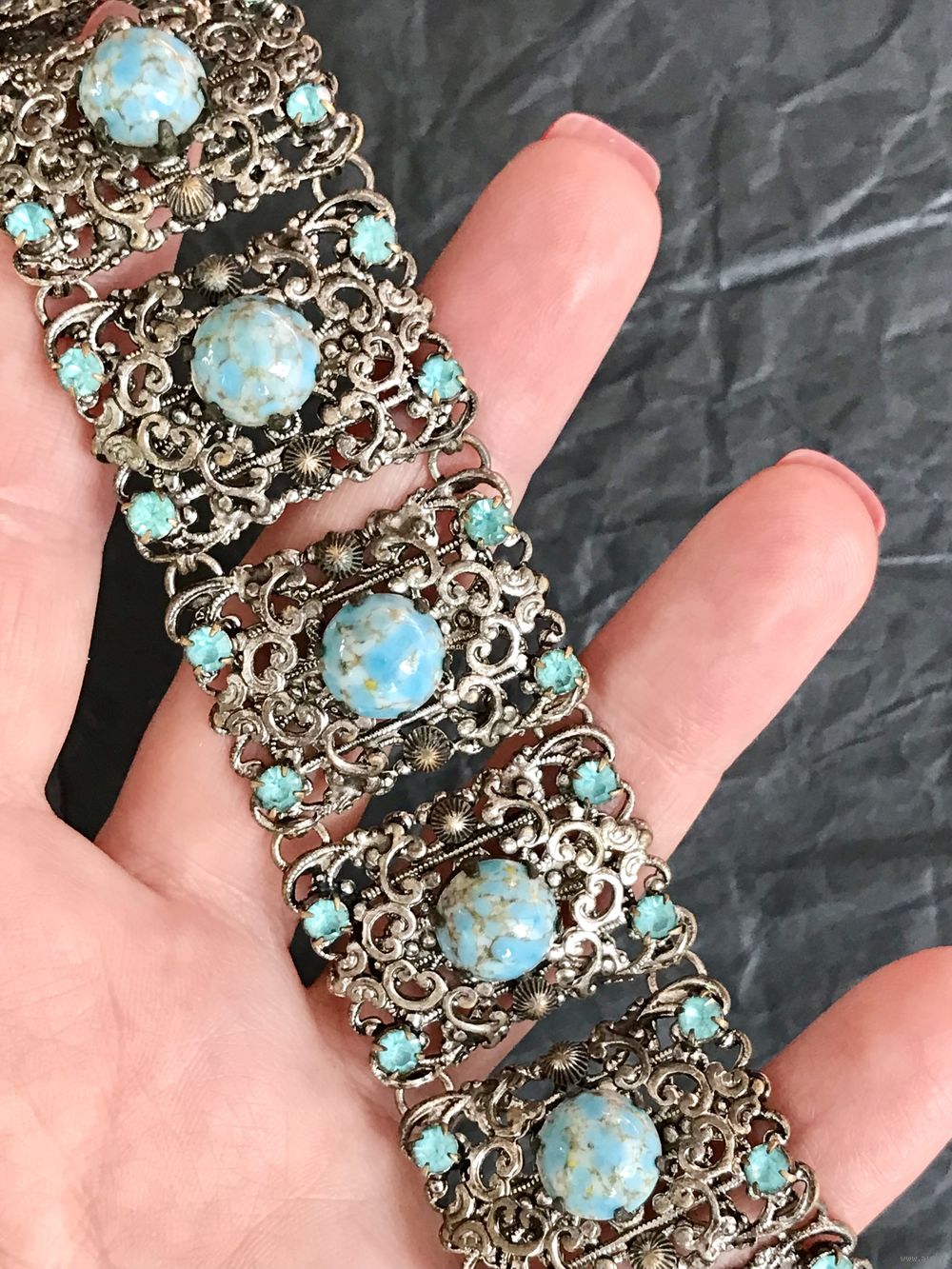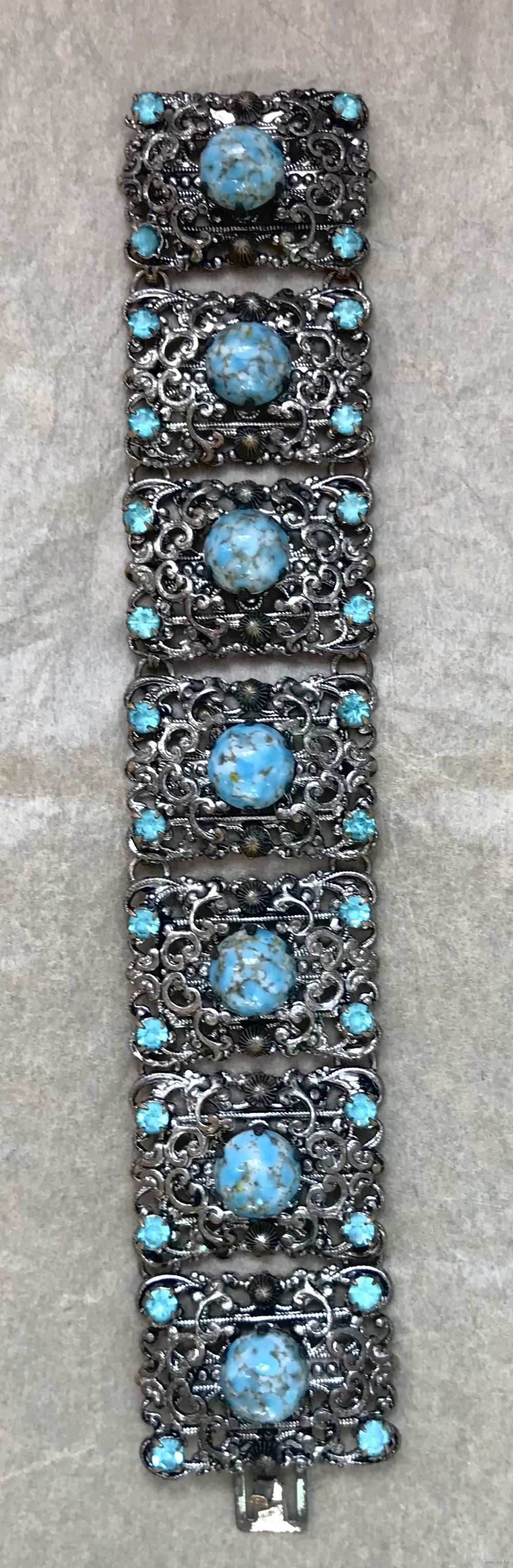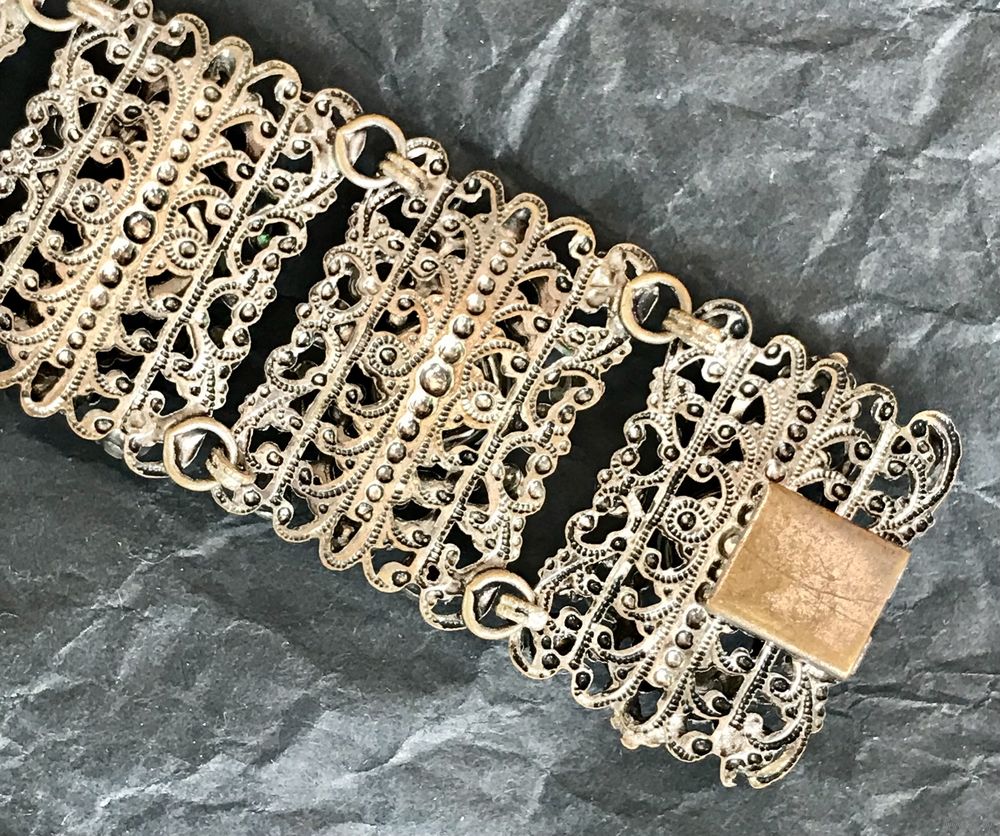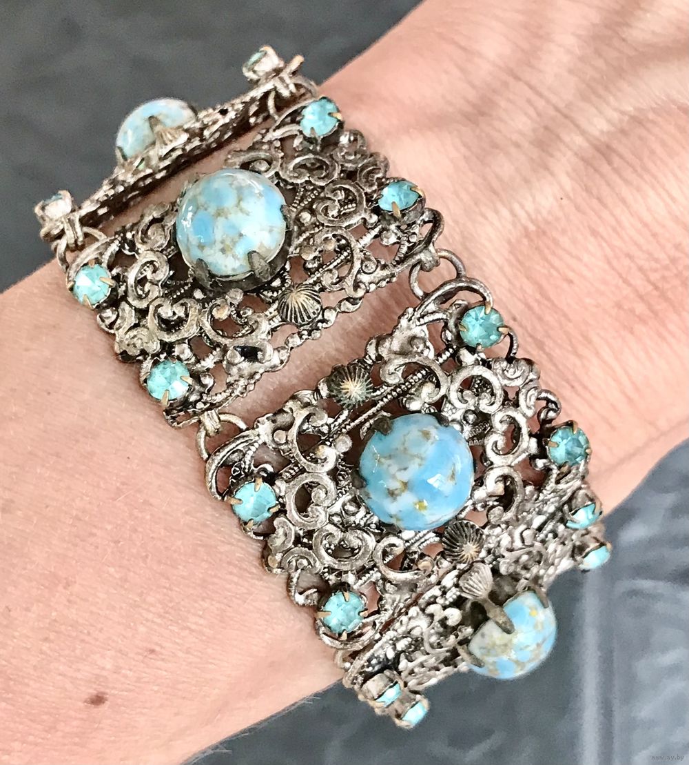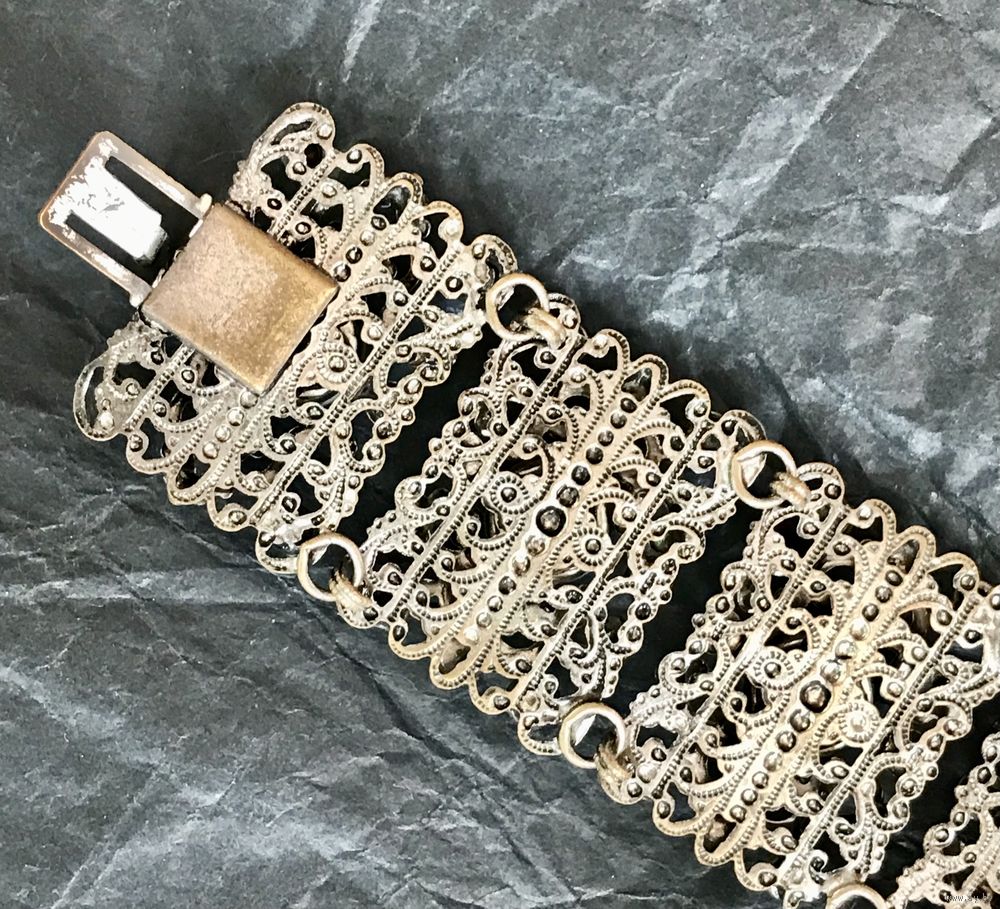Винтажный браслет (Чехословакия 60-е гг. ) выполнен методом штампования из латуни под филигрань с покрытием под серебро, вставки- художественное стекло и кристаллы. Длина браслета 16см., звено 3х2см., подойдёт на узкое запястье. Состояние хорошее.