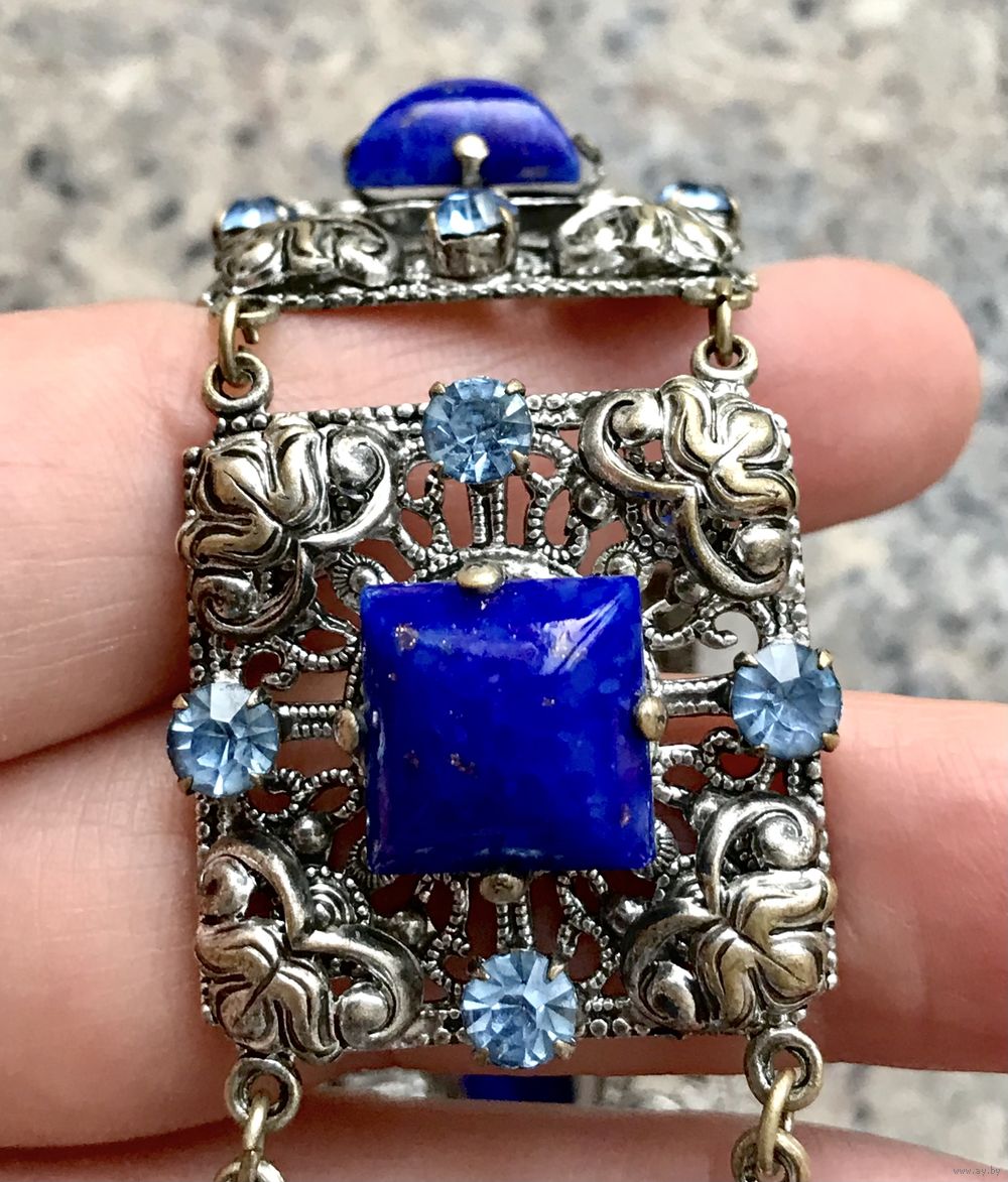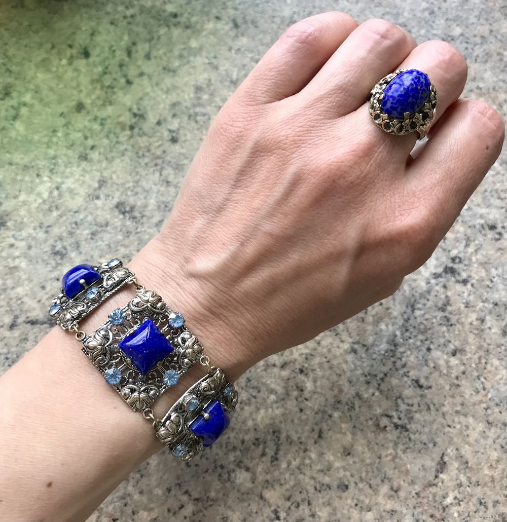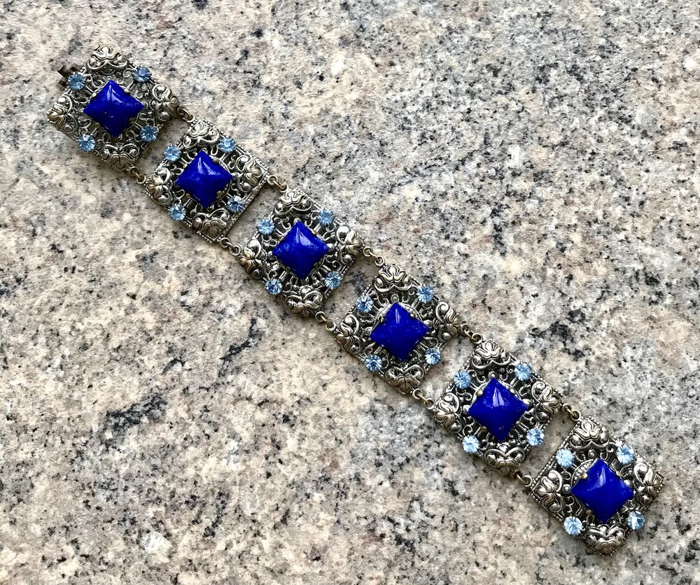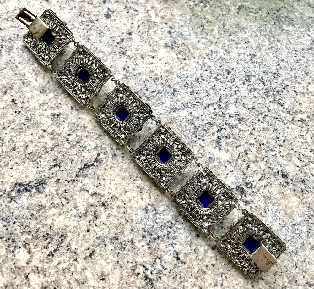 Браслет (Чехословакия 60-е гг. ) выполнен методом штампования из латуни под филигрань, вставки- пекинское и ювелирное стекло. Длина браслета 19см., звено 2,6х2,6см. Состояние хорошее. В лотах есть подходящее кольцо.