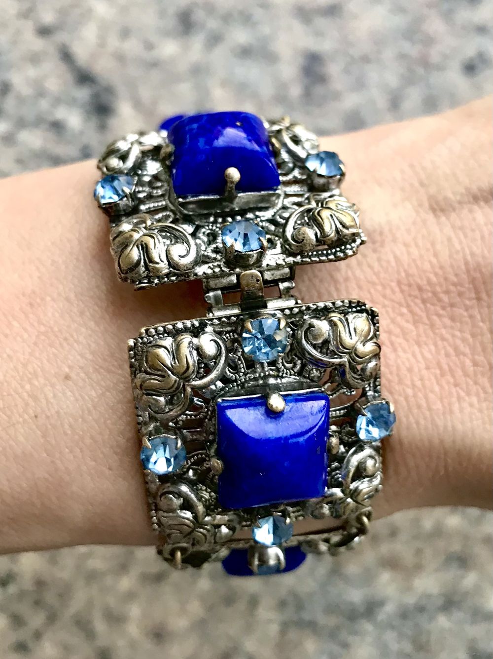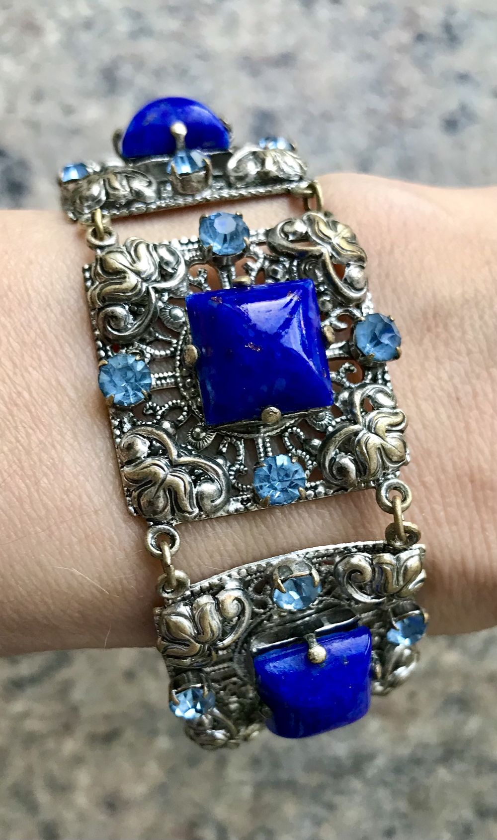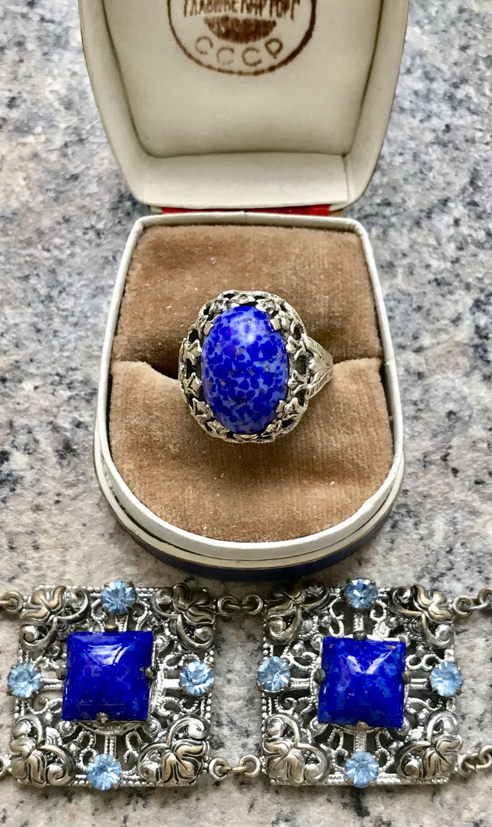 Браслет (Чехословакия 60-е гг. ) выполнен методом штампования из латуни под филигрань, вставки- пекинское и ювелирное стекло. Длина браслета 19см., звено 2,6х2,6см. Состояние хорошее. В лотах есть подходящее кольцо.