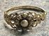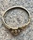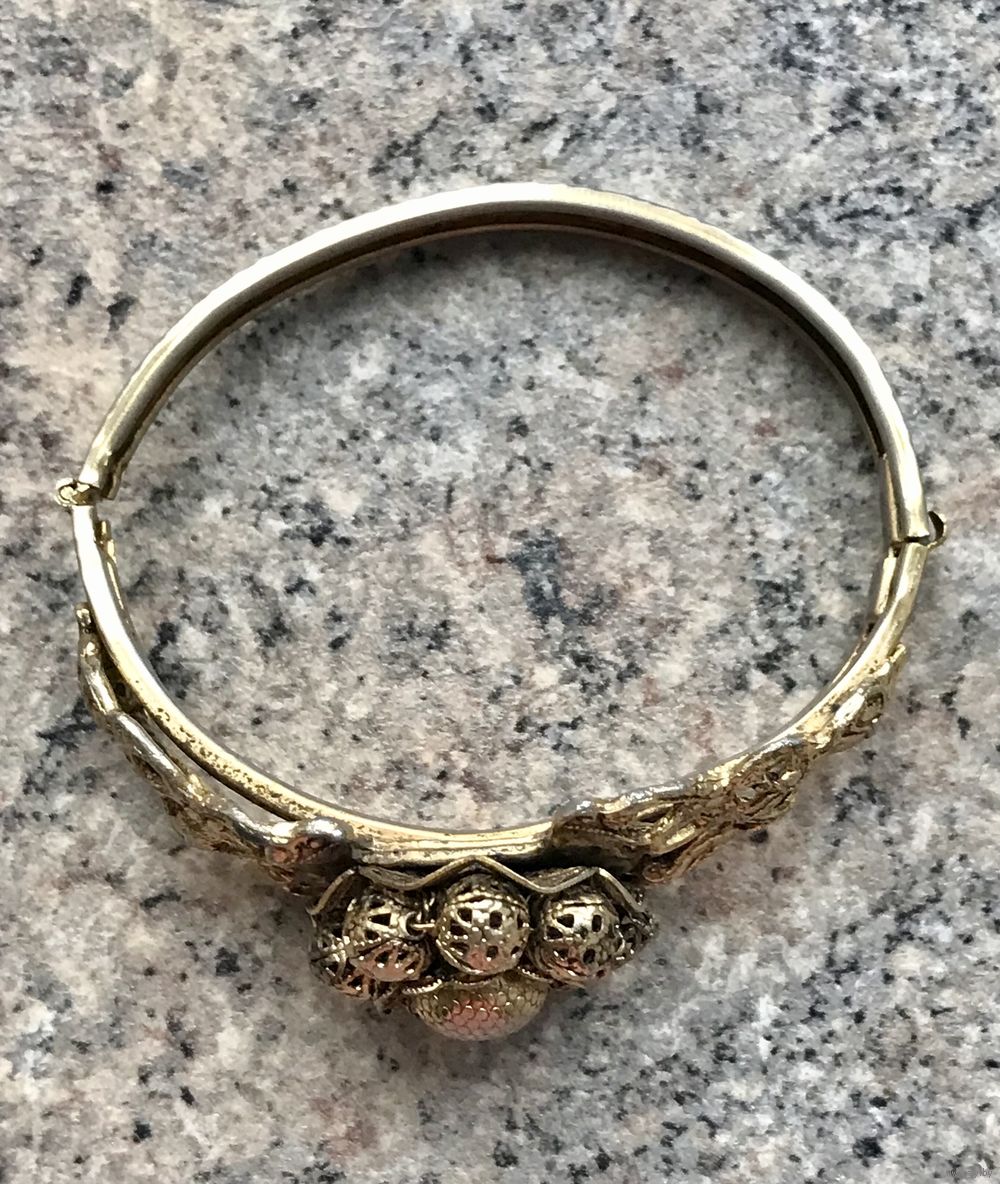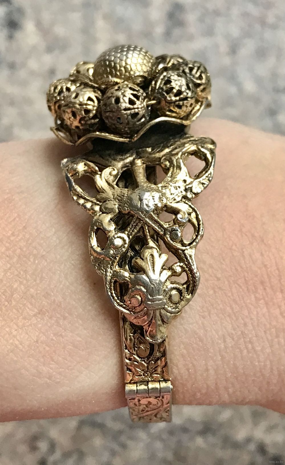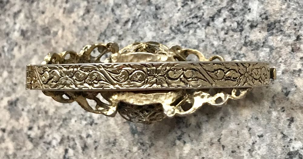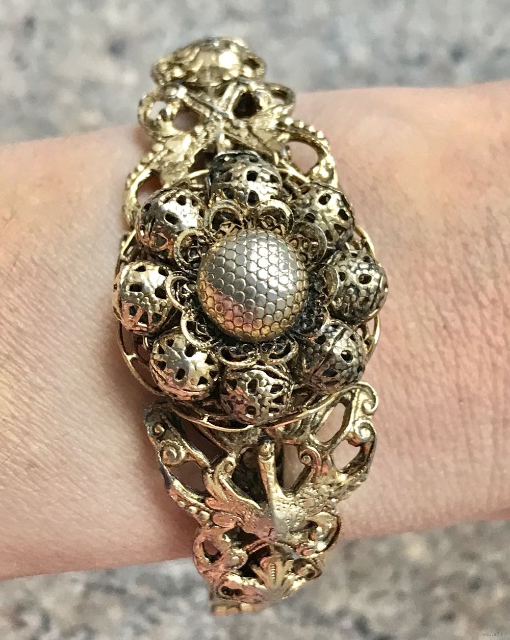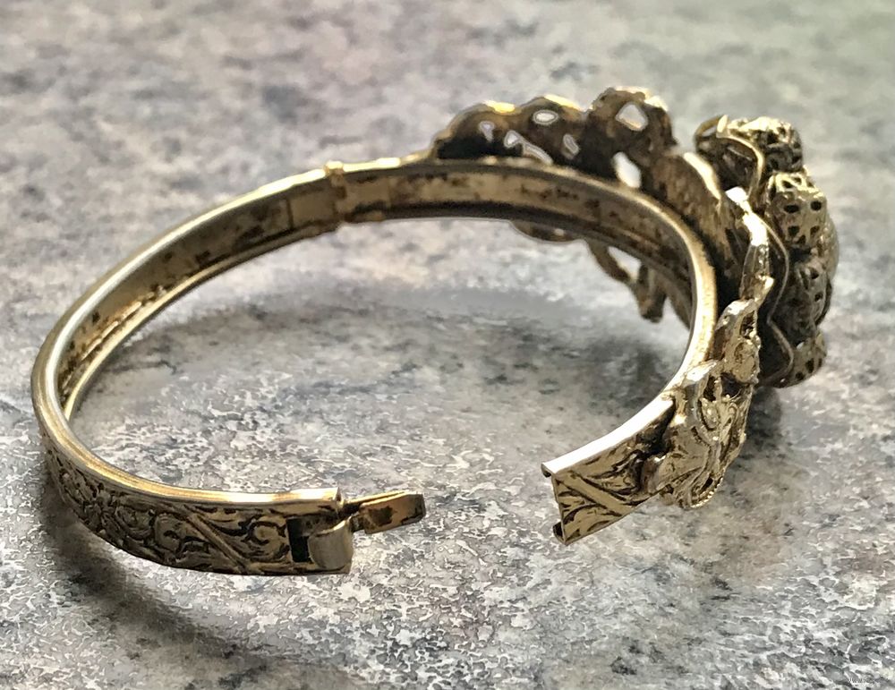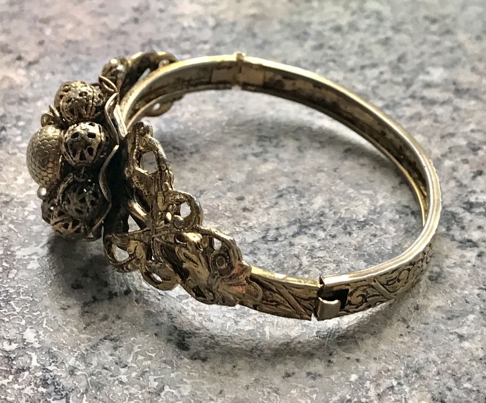 Винтажный браслет из бижутерного сплава цвета античного золота, по всему основанию идёт красивый тисненый узор, на лицевой стороне ажурная накладка на которой в центре находится замысловатый цветок. В некоторых местах присутствуют незначительные потёртости, на внутренней стороне -следы времени. Браслет имеет овальную форму (6,5смх 5см.), закрывается с помощью замочка, с одной стороны немного деформирован (в носке не заметно),не маркирован.