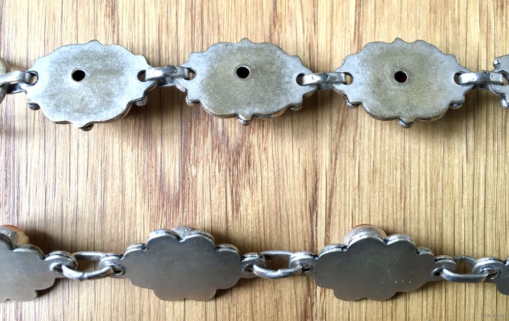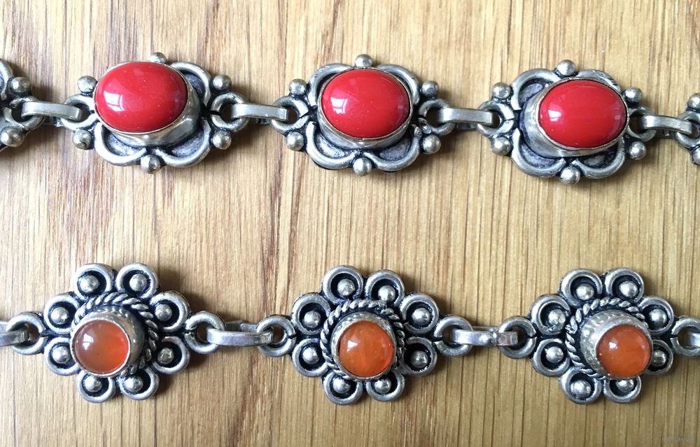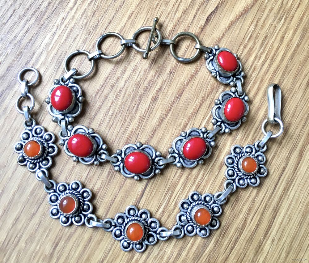 Браслеты выполнены из сплава нейзильбер, вставки из смальты . Длина браслета с красными вставками 23 см. с застежкой, длина браслета с оранжевыми вставками 20 см. с застежкой. На обратной стороне имеются потертости. Цена указана за один браслет.