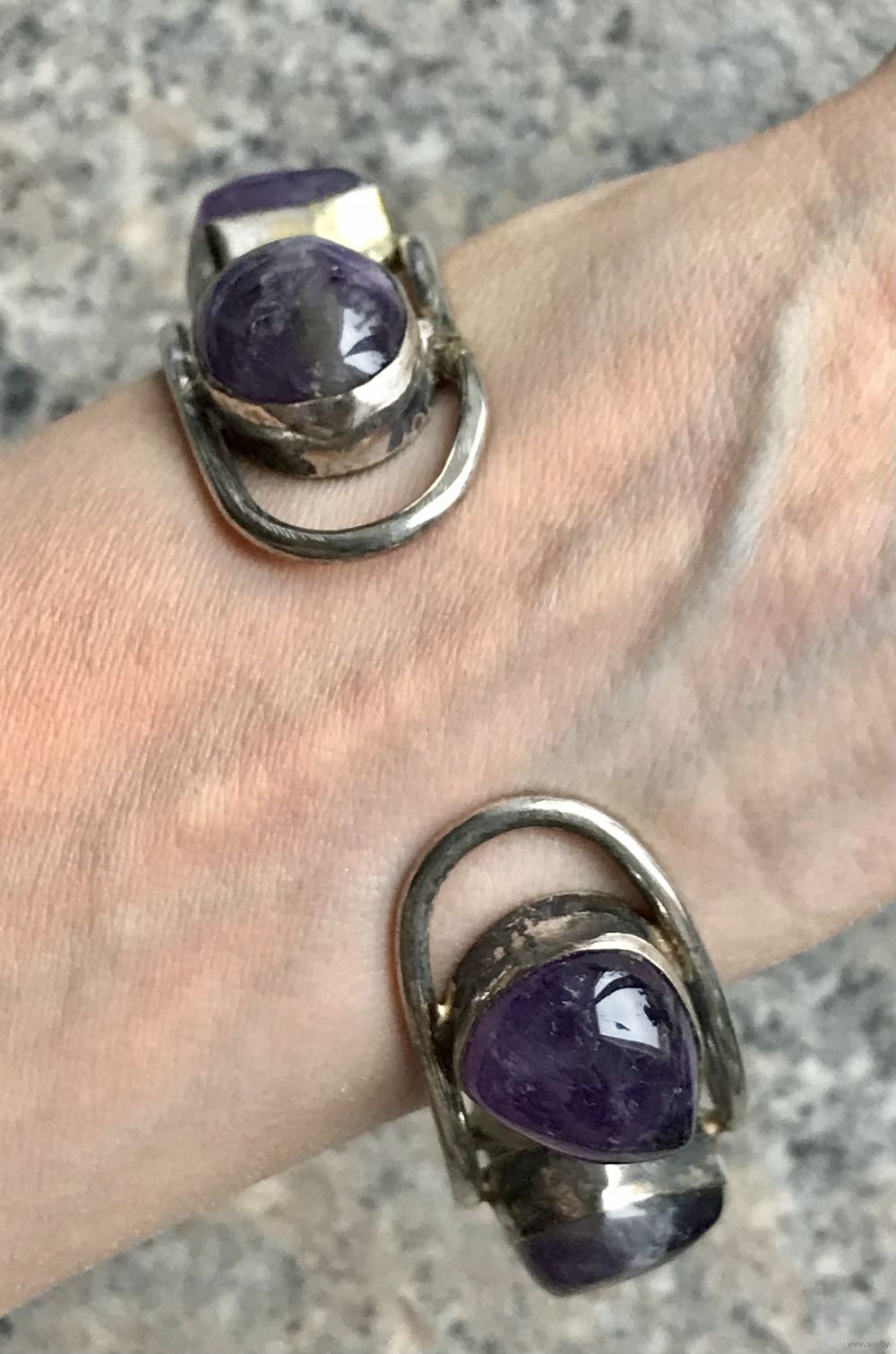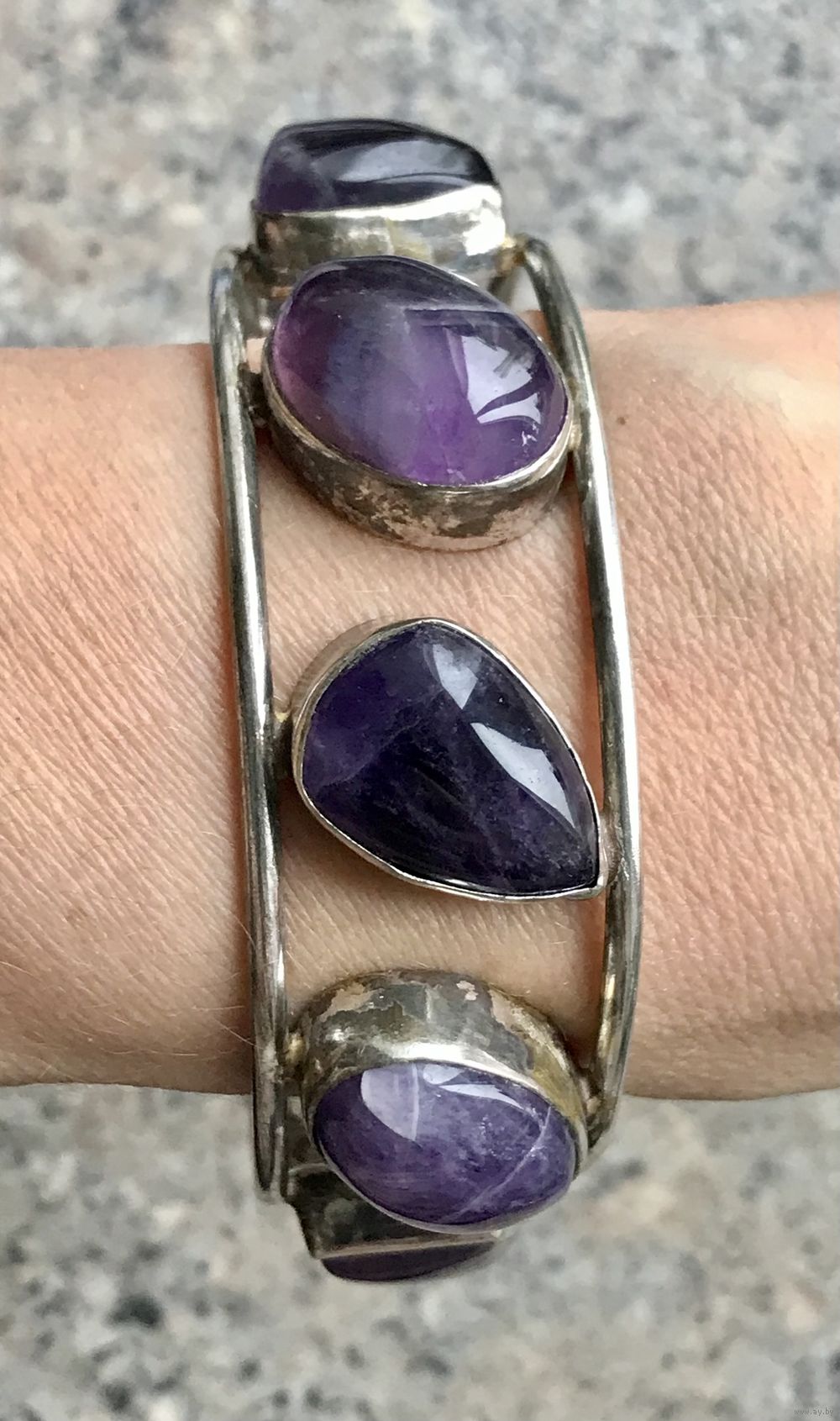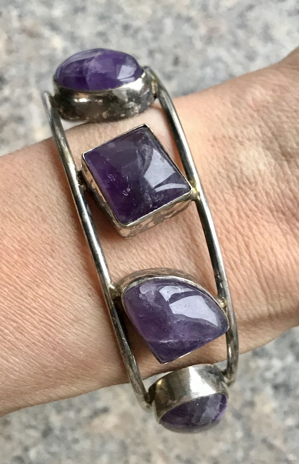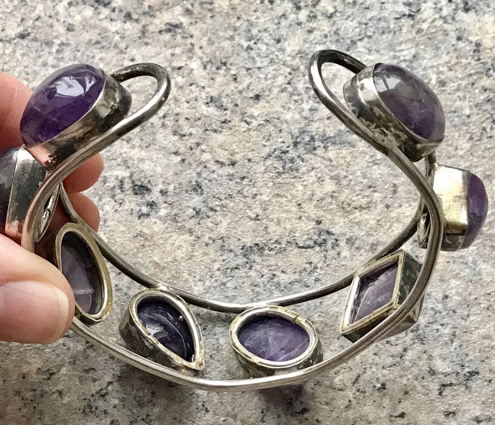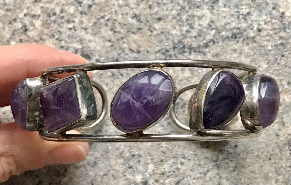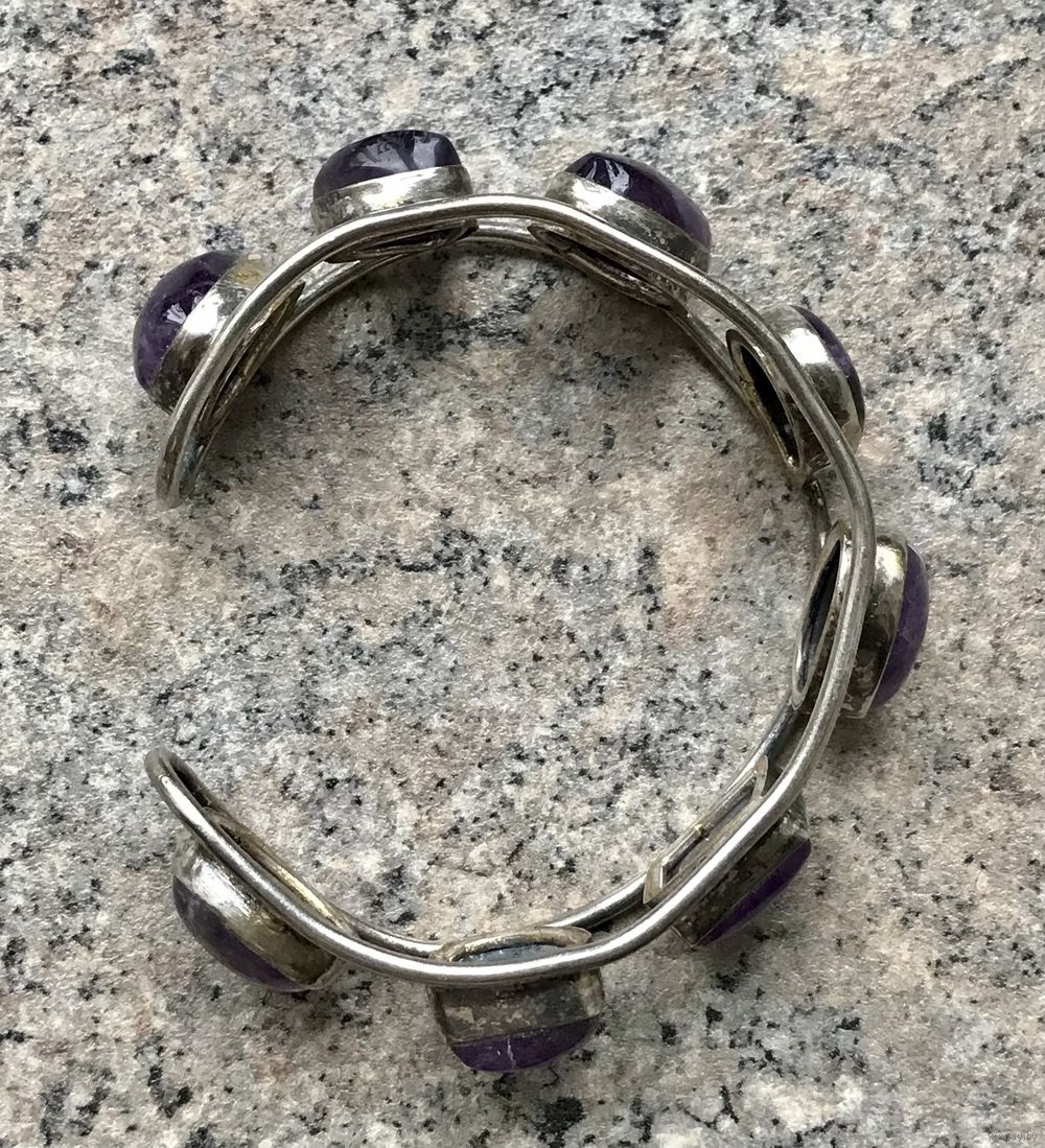 Винтажный браслет с основой из металла с серебрением и крупных вставок геометрических форм из аметиста. Высота браслета 2,3см., размер регулируется, рассчитан не на узкое запястье. Тяжёленький. Состояние хорошее.