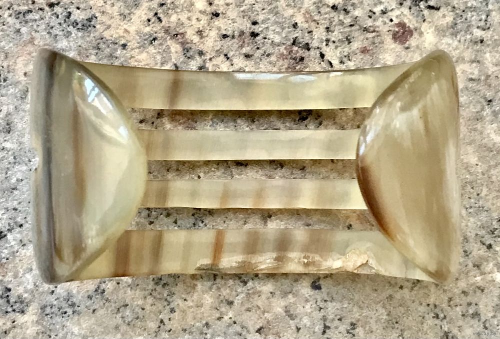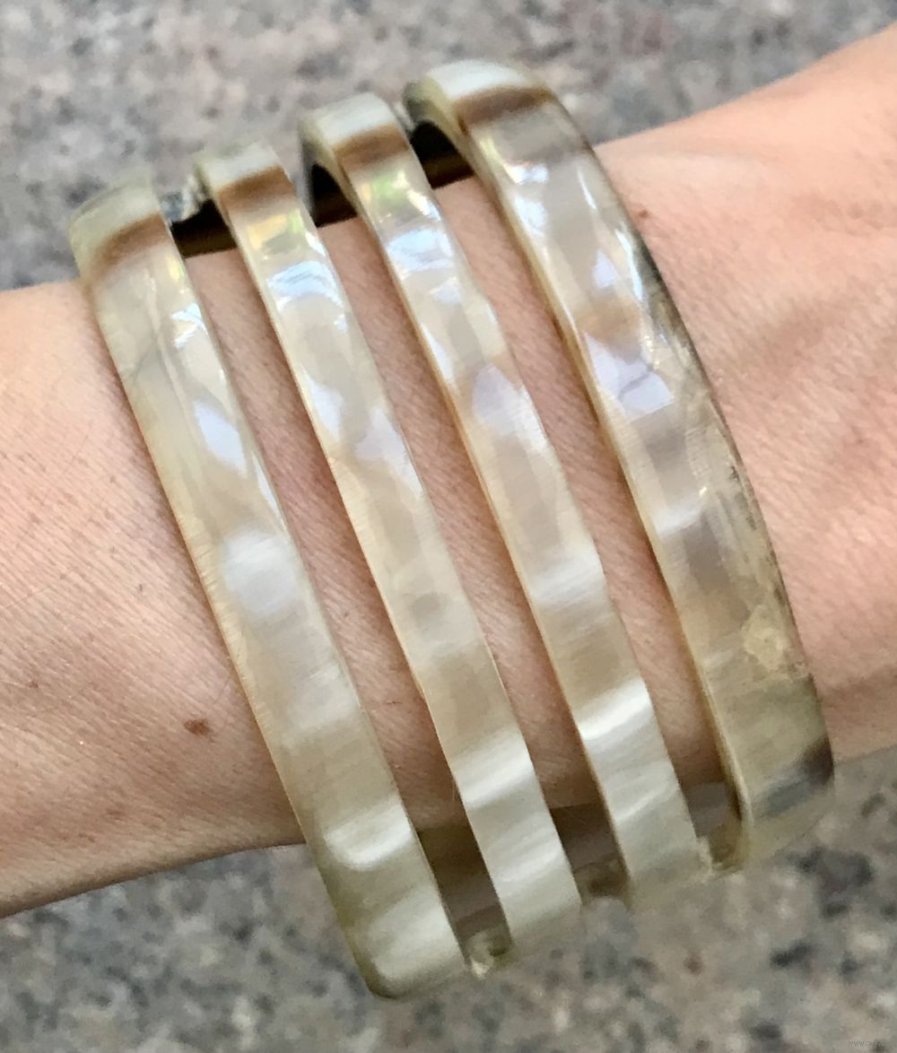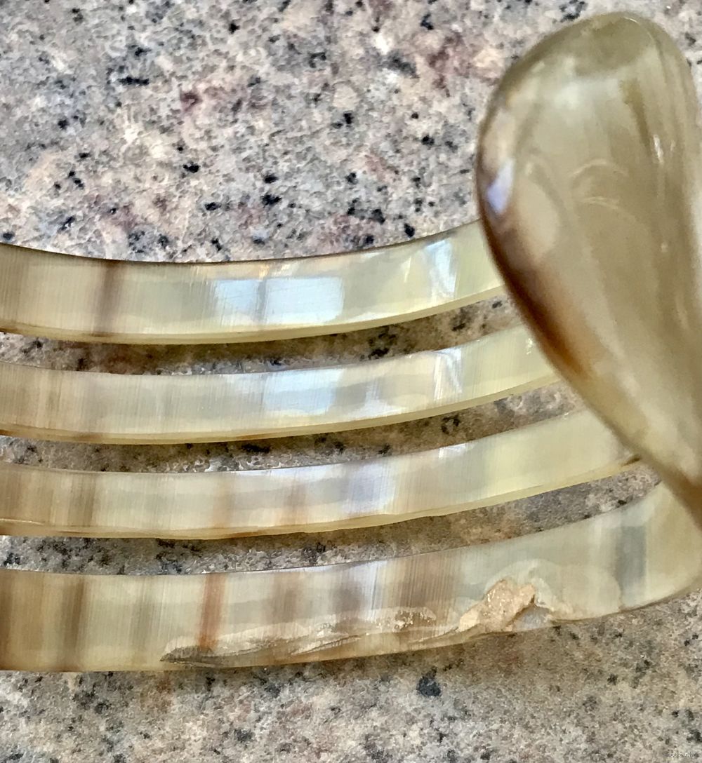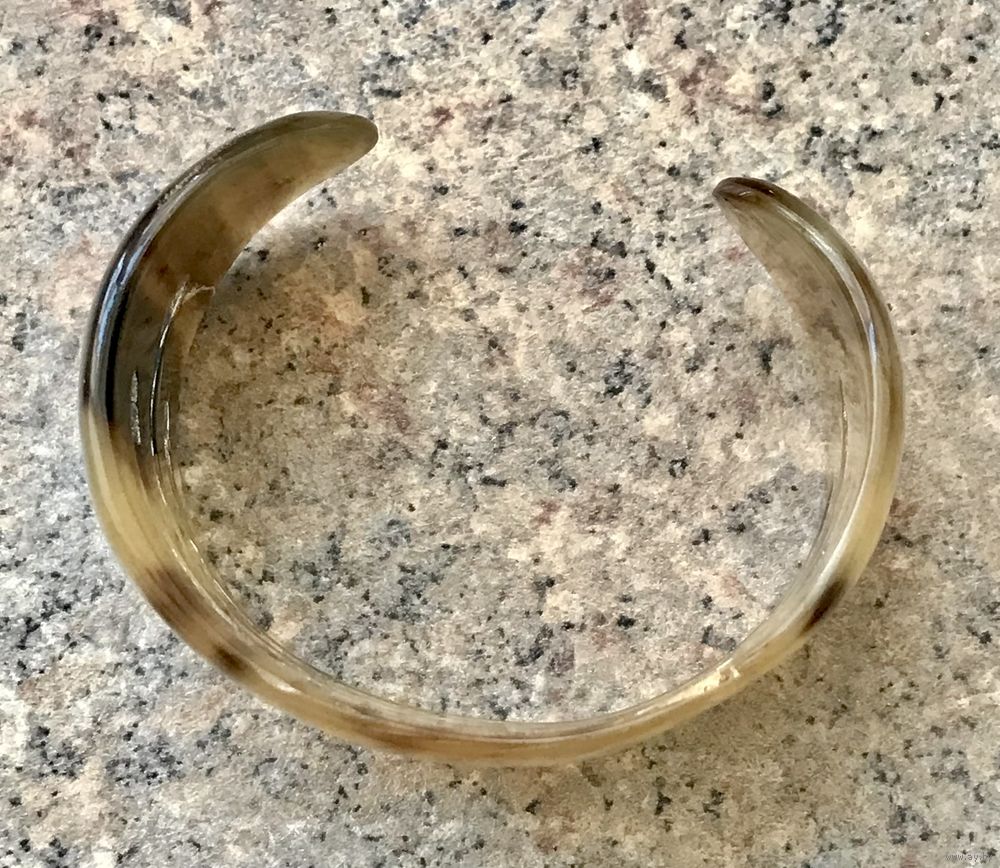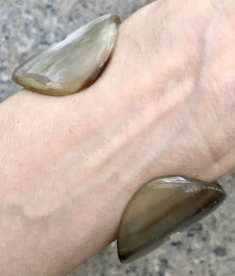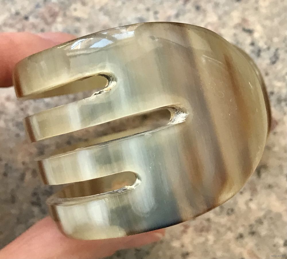 Винтажный крупный браслет из рога. Высота 4см. Внутри есть небольшая царапина и несколько поверхностных скольчиков, которые практически не видны с лицевой стороны. Браслет на широкое запястье. Примерная длина 21см.