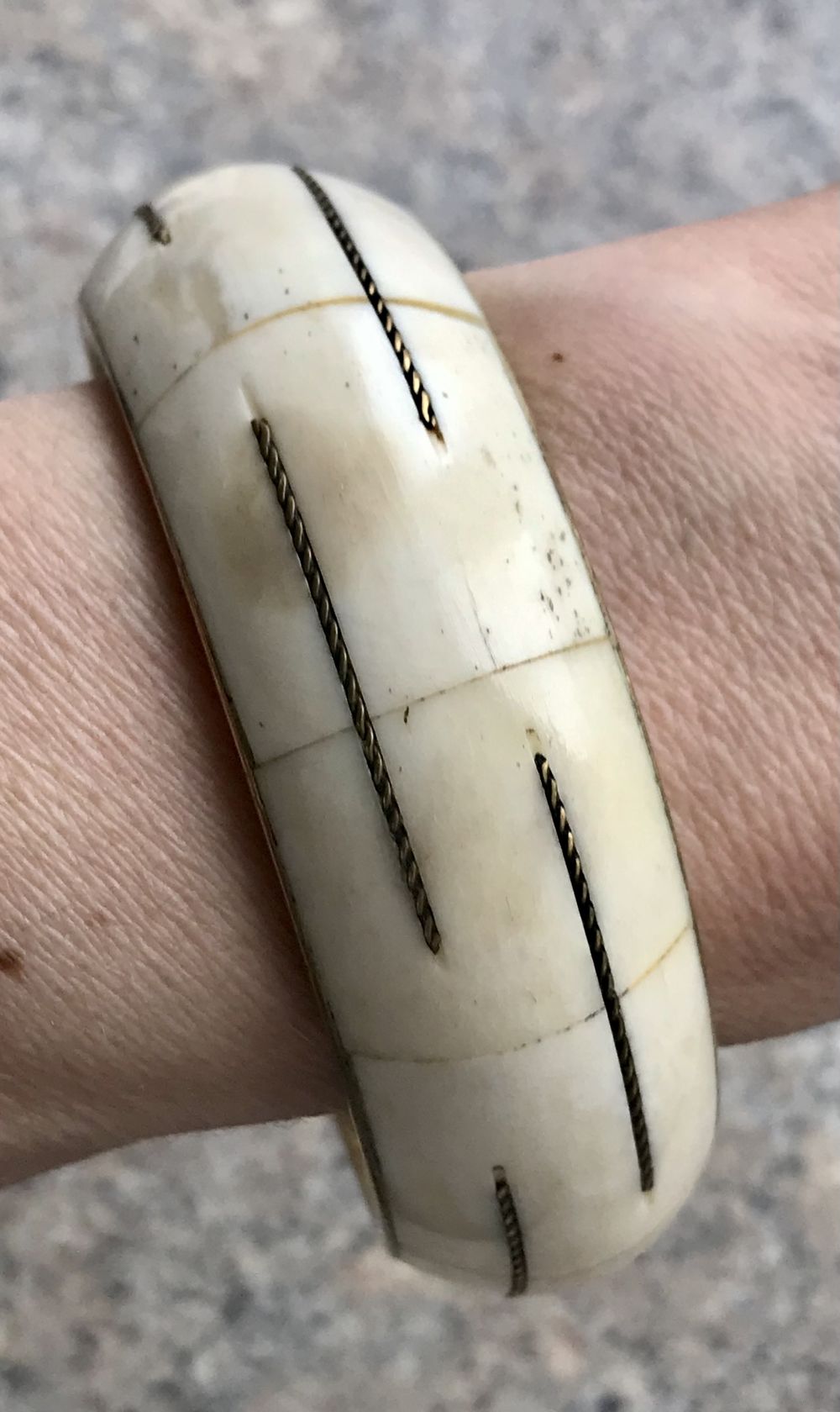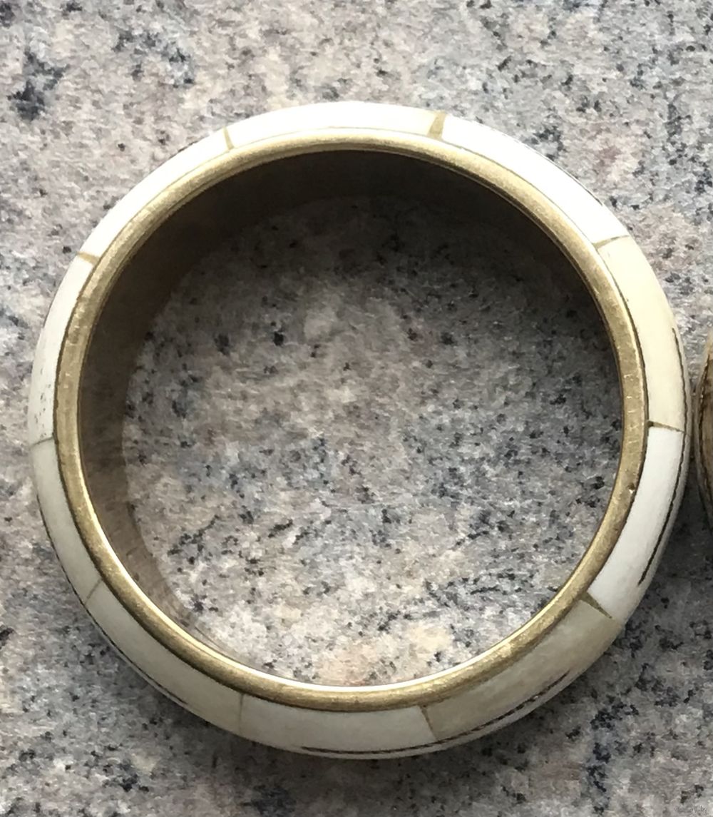 Винтажный индийский браслет. Основа из латуни, лицевая сторона украшена костью КРС. Высота 2,3см., вн.диаметр 6,2см. Неразъемный. Состояние хорошее.