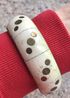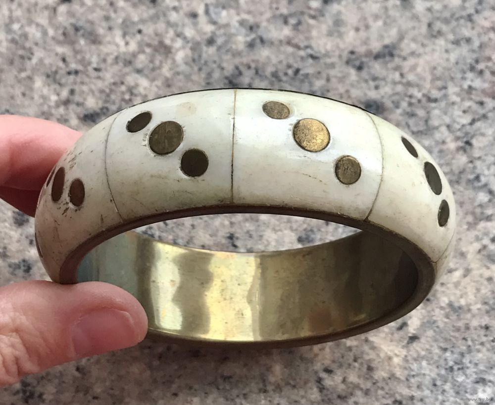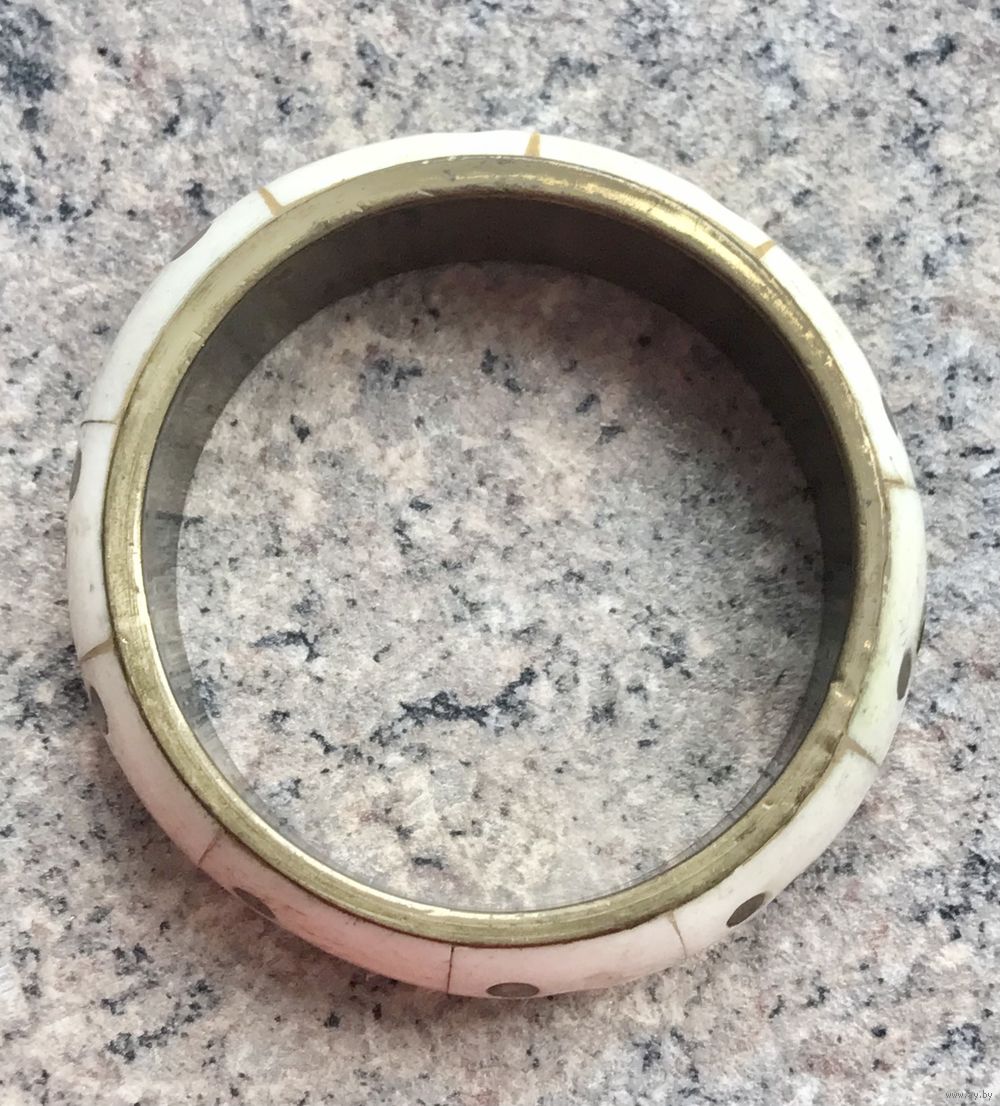 Винтажный индийский браслет. Основа из латуни, лицевая сторона украшена костью КРС. Высота 2,3см., вн.диаметр 6,5см. Неразъёмный. Состояние хорошее.
