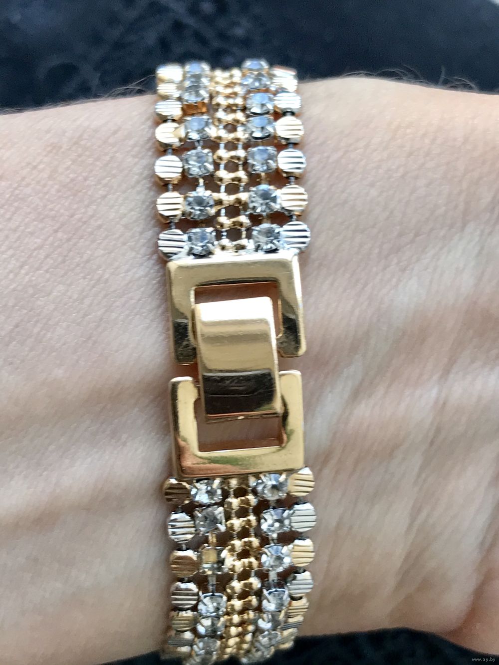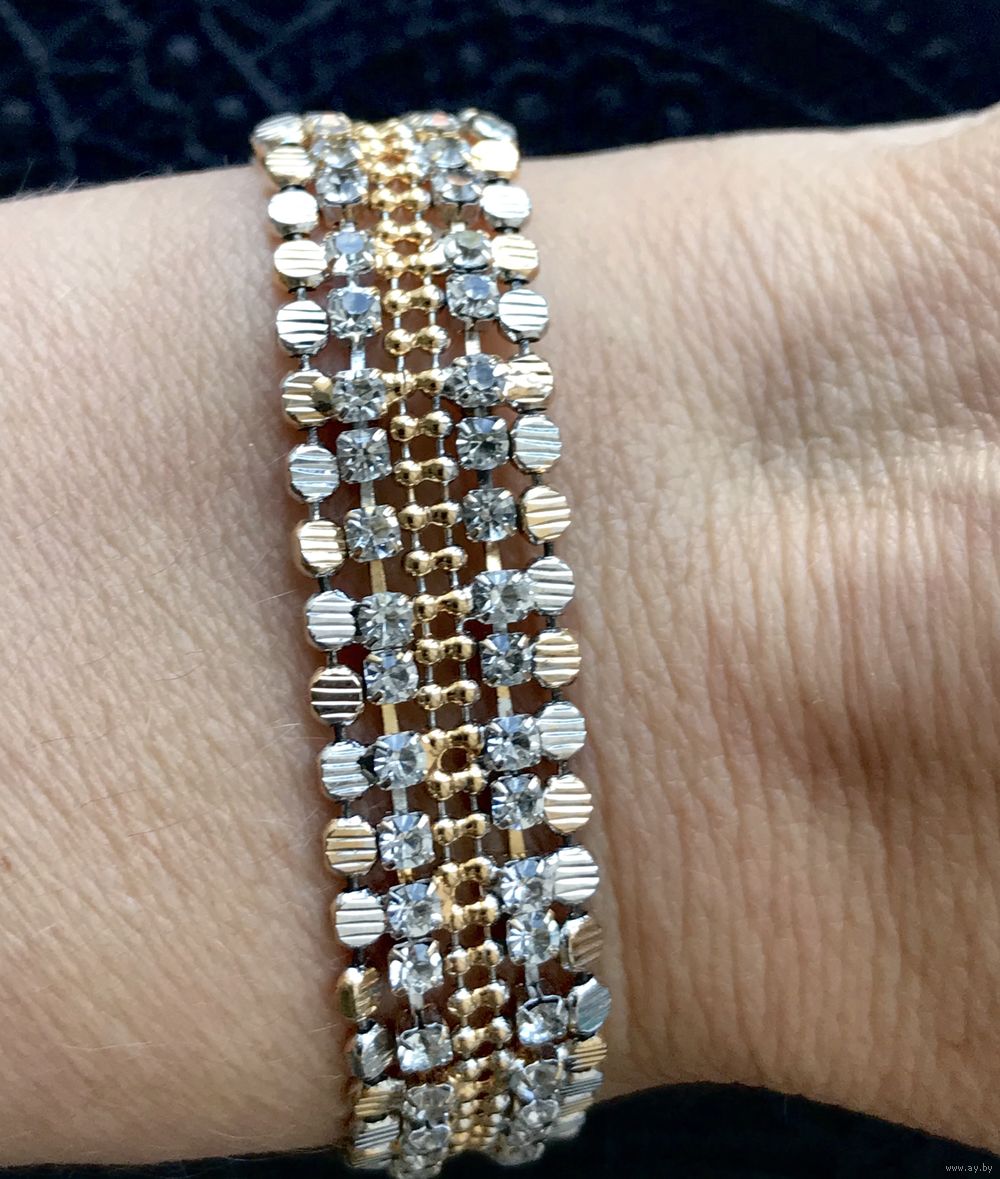 Браслет из металла двух тонов, вставки кристаллы. Длина с застежкой 18 см., высота 1,2см. Состояние хорошее.