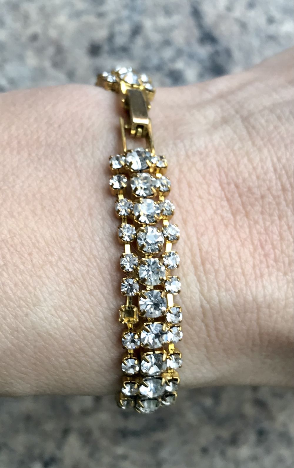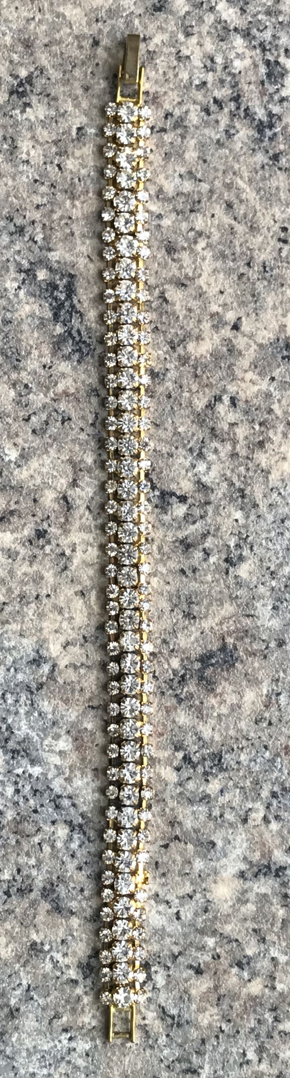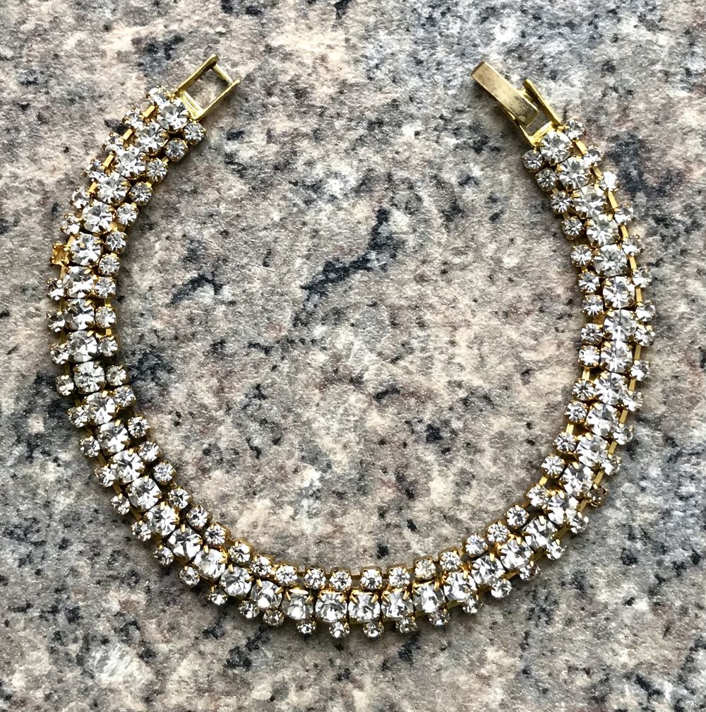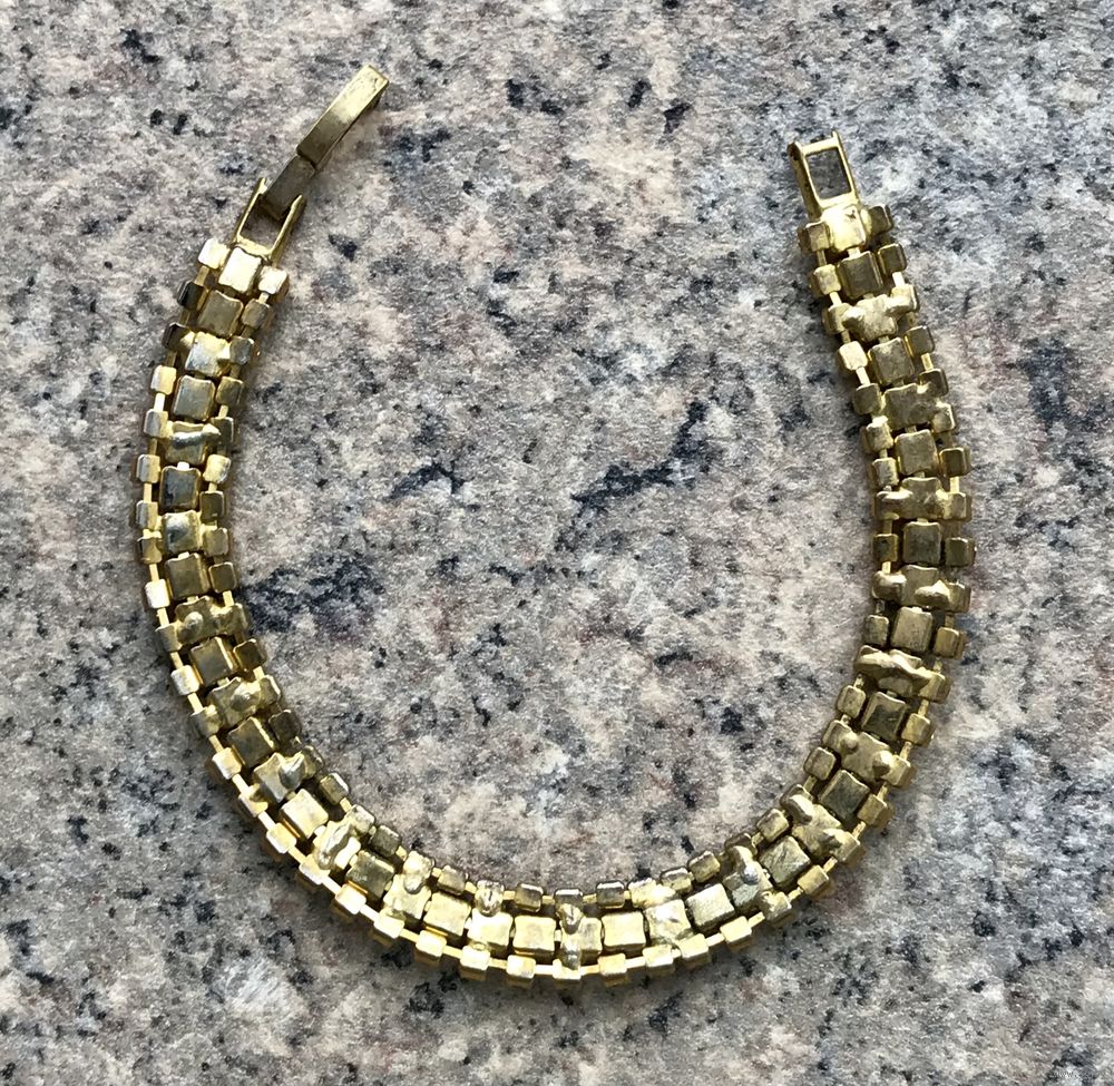 Браслет с основой из металла золотого тона, вставки- стекло, одной не хватает. Длина 18 см., высота 0,7см.