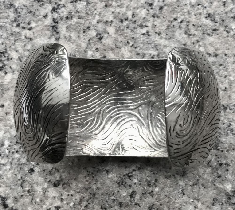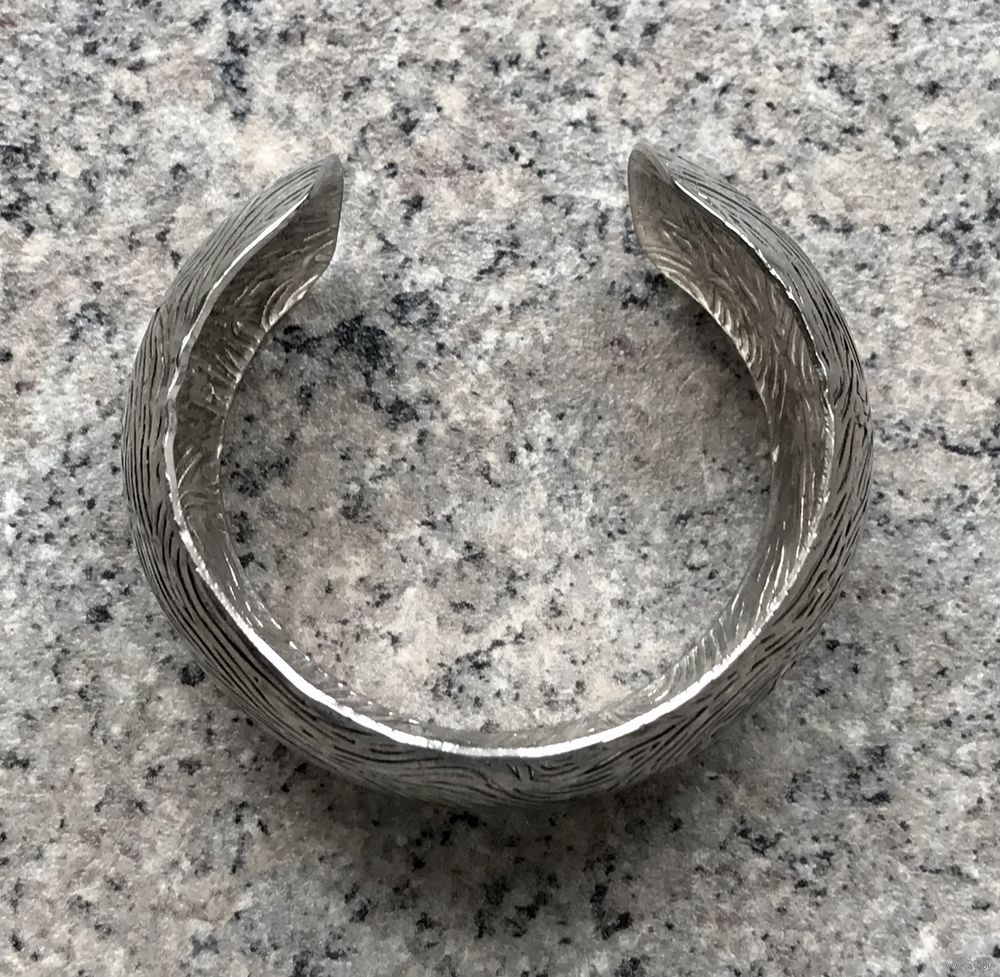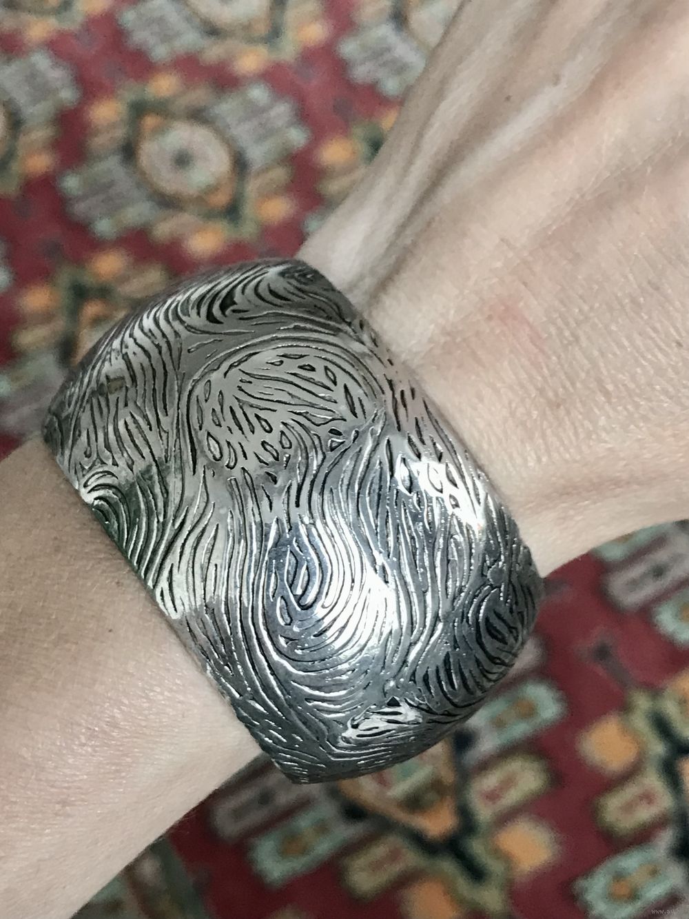 Крупный браслет из металла серебристого тона. Высота 3,5см., подойдёт на узкое запястье. Состояние хорошее.