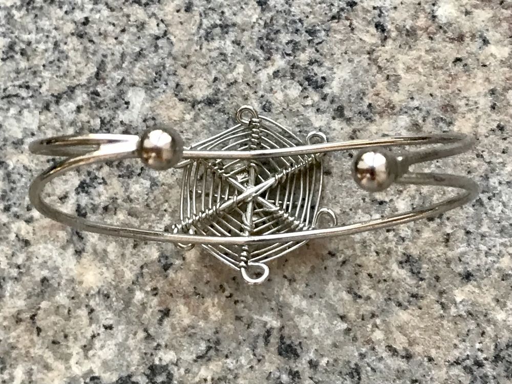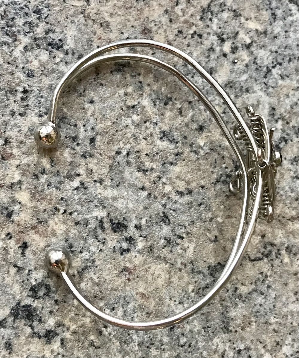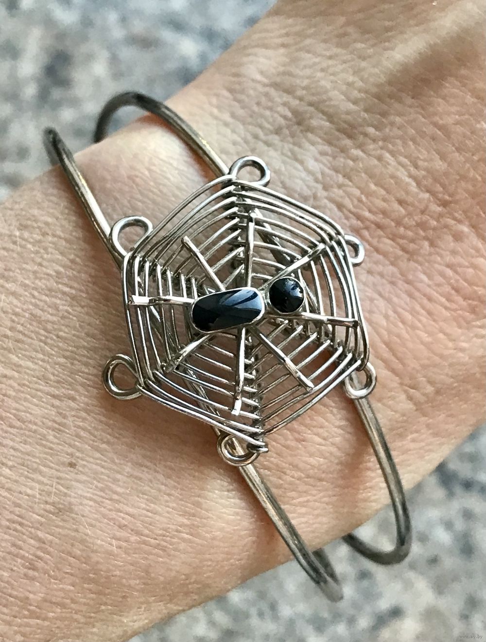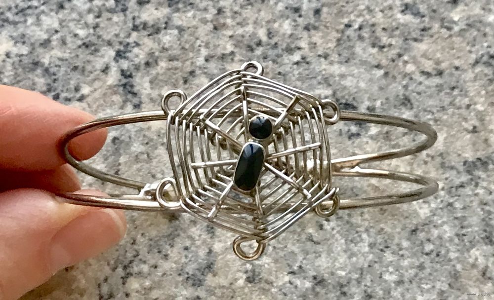 Браслет из металла серебристого тона, на теле паучка эмаль чёрного цвета. Высота центральной части 3см., размер регулируется, подойдёт и на узкое запястье. Состояние хорошее.