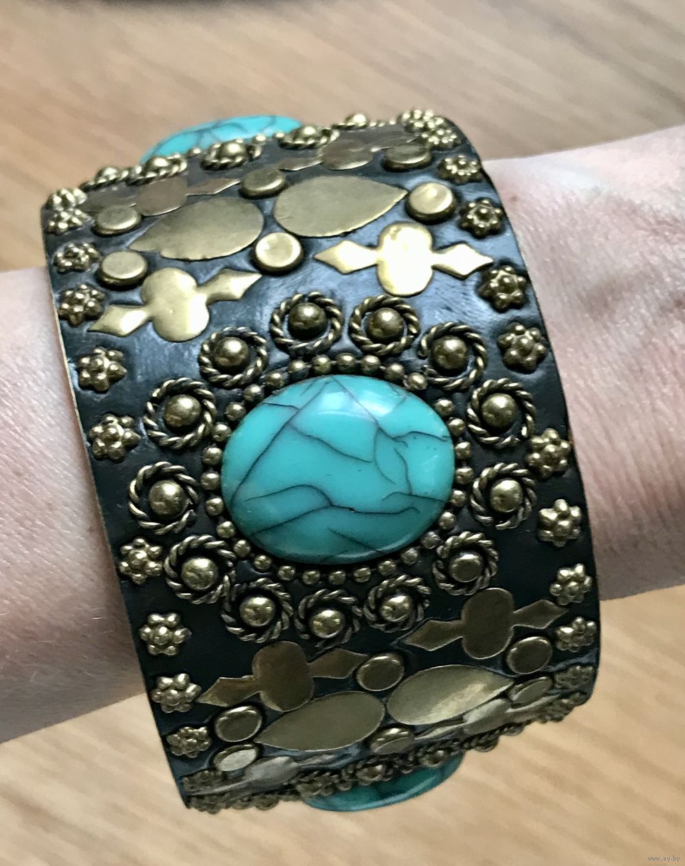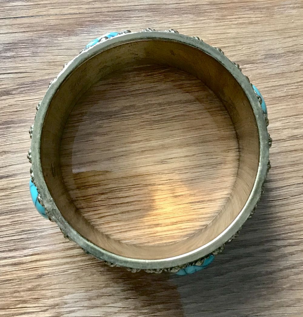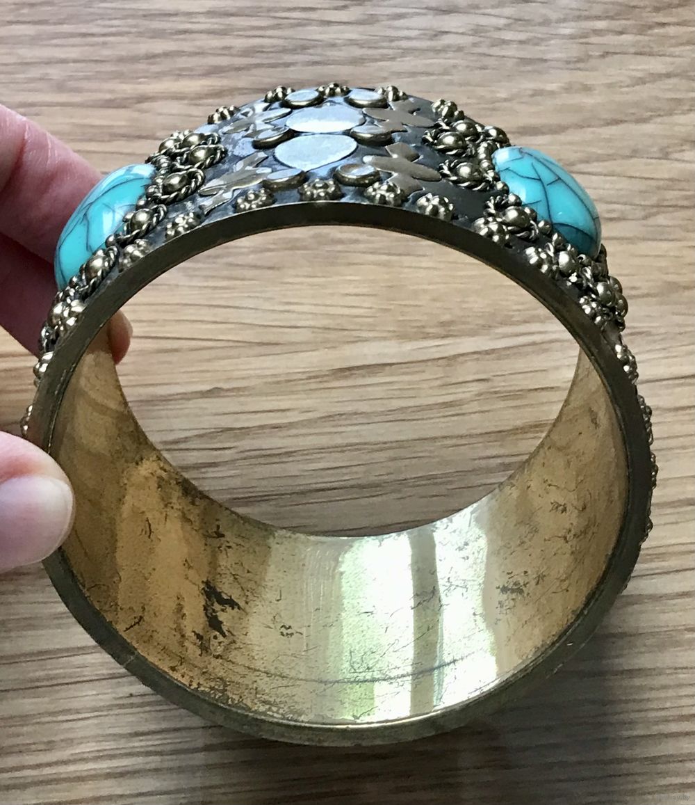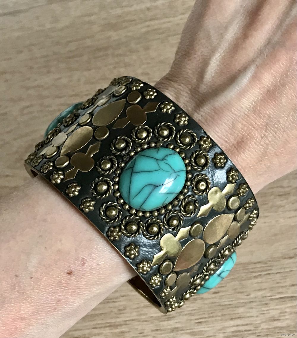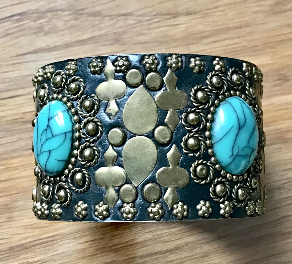 Крупный винтажный браслет с основой из латуни, лицевая сторона обтянута кожей, украшена вставками из пластика под бирюзу и элементами из латуни. Высота браслета 5см., вн.диаметр 7см. Внутри браслета на металле есть потёртости. Общее состояние хорошее.