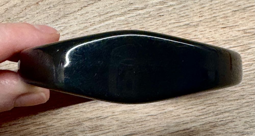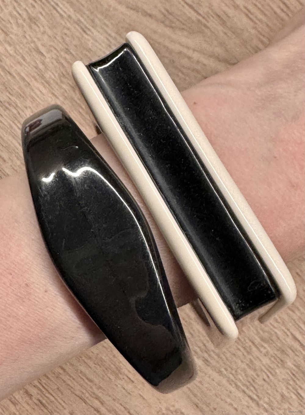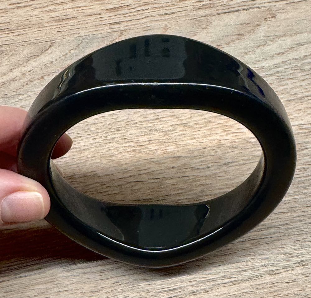 Браслет из плотного пластика чёрного цвета. Высота от 1,3 до 2,5см. Вн.диаметр 7см. Имеются незначительные следы ношения.