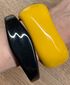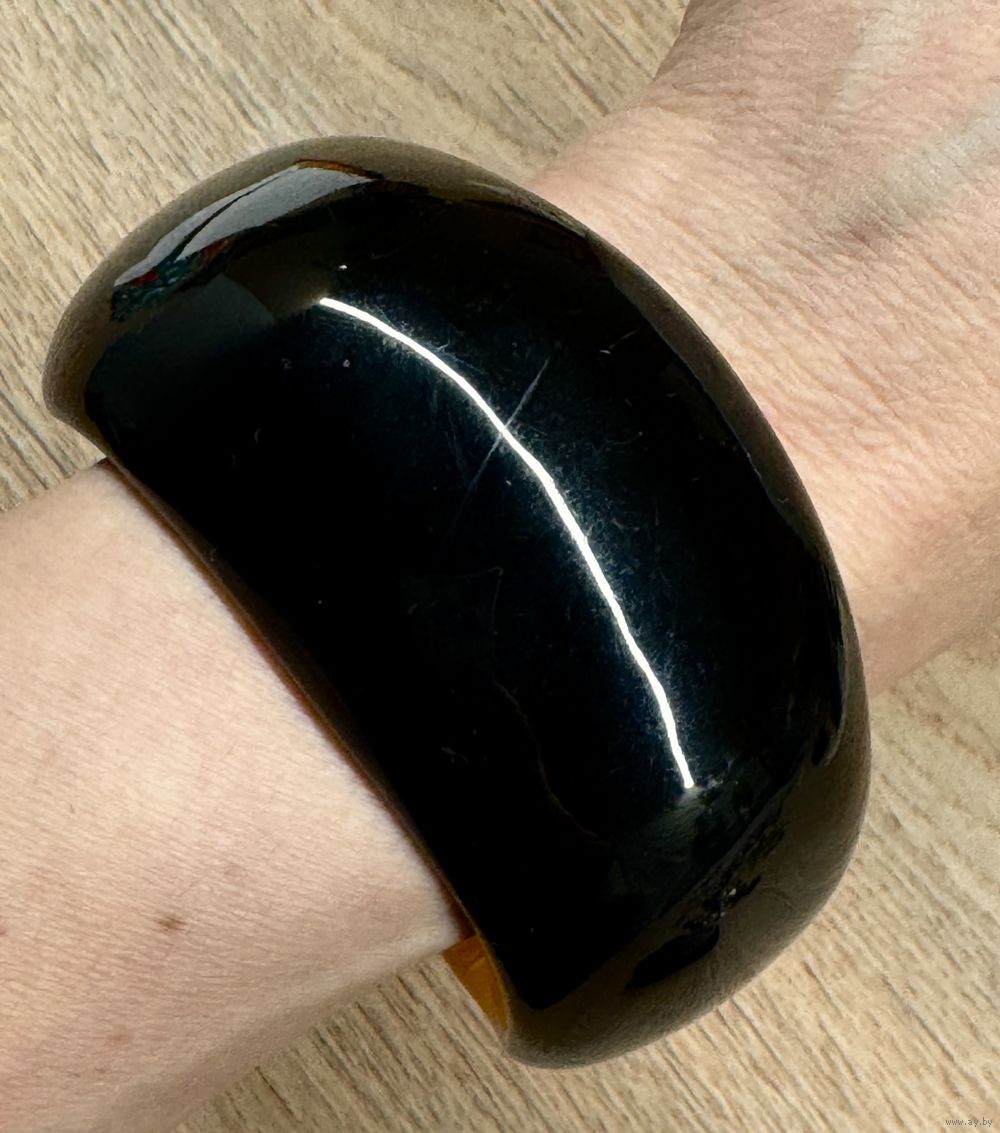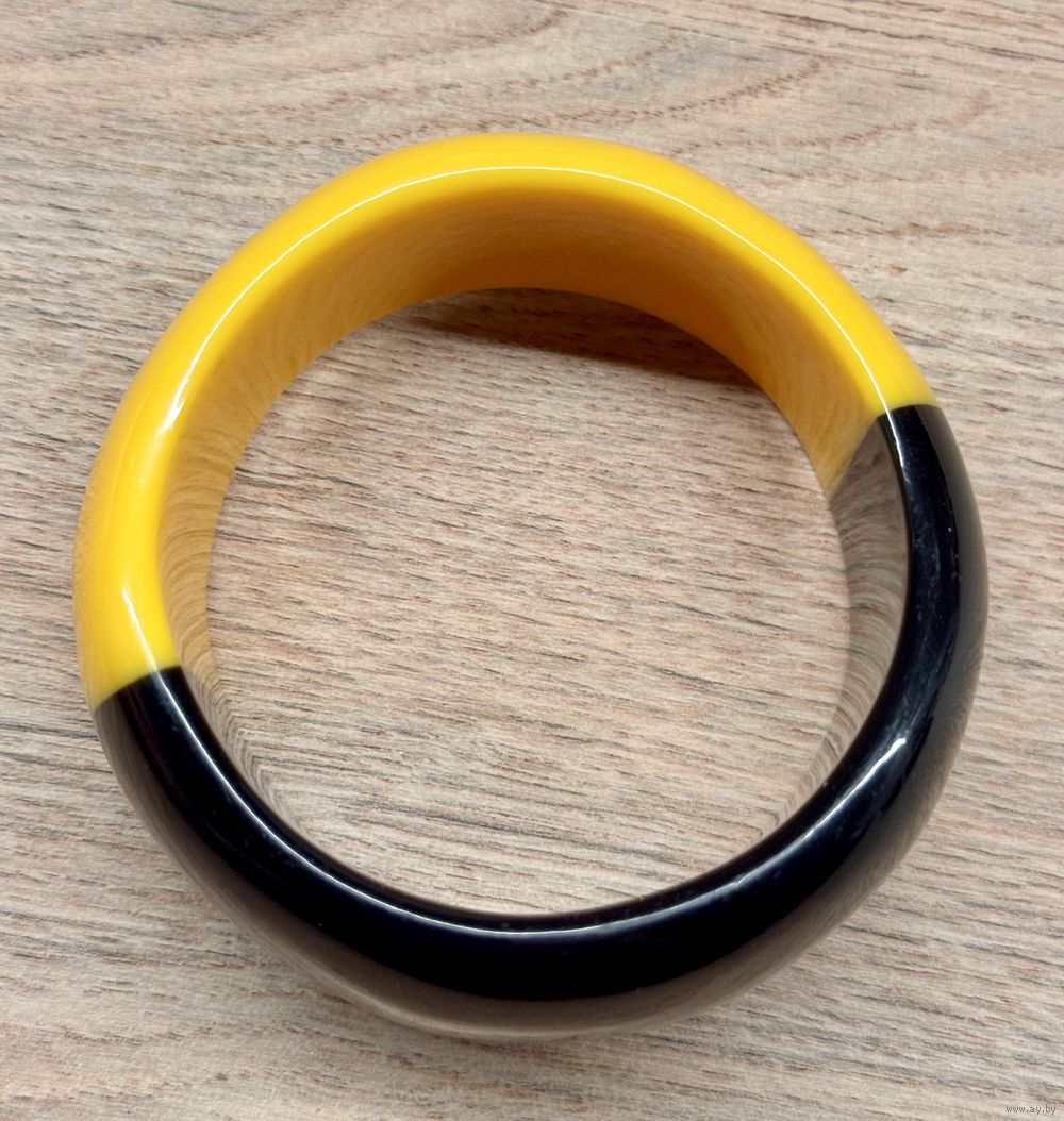 Браслет из чёрного и желтого пластика. Высота от 2,5 до 4см. Вн.диаметр 6,5см. Имеются небольшие следы ношения.
