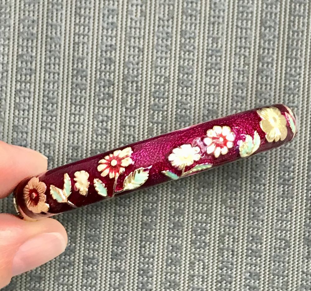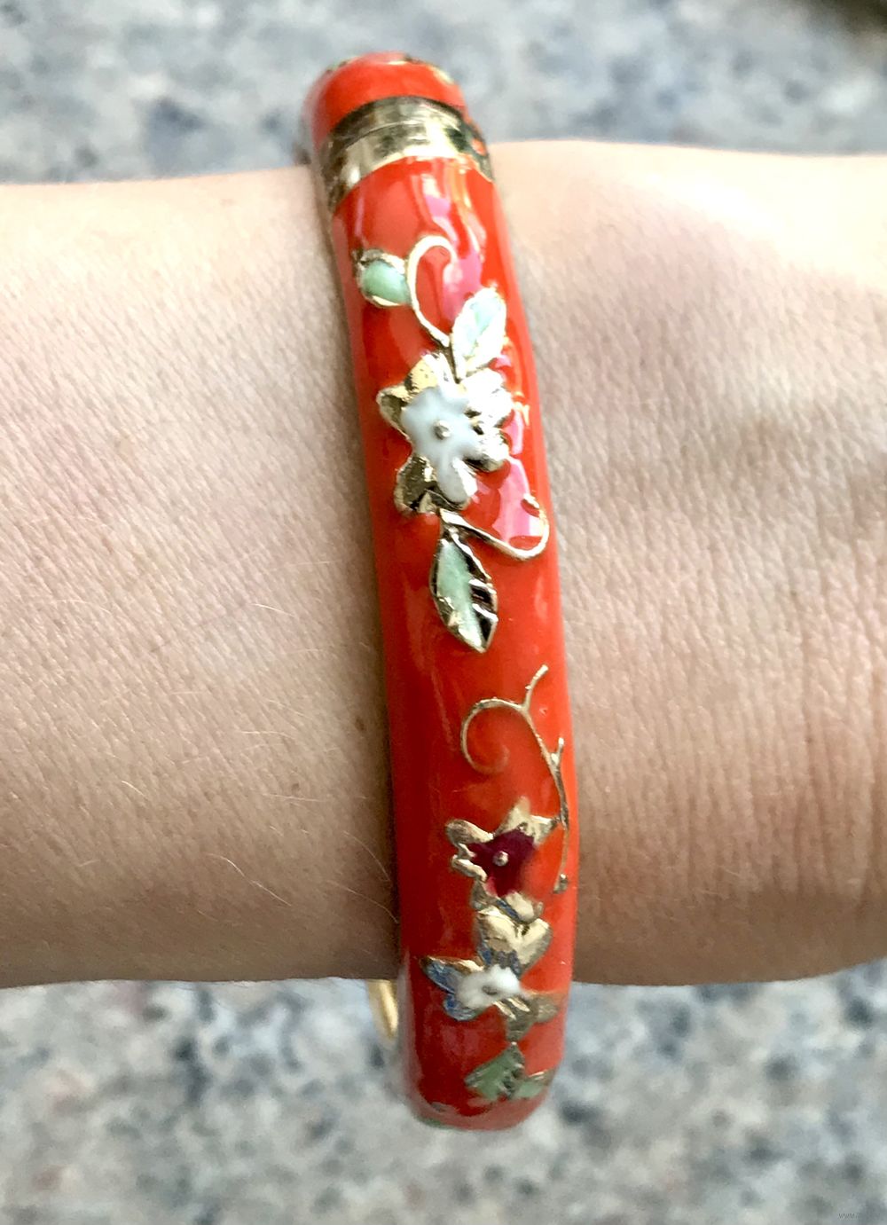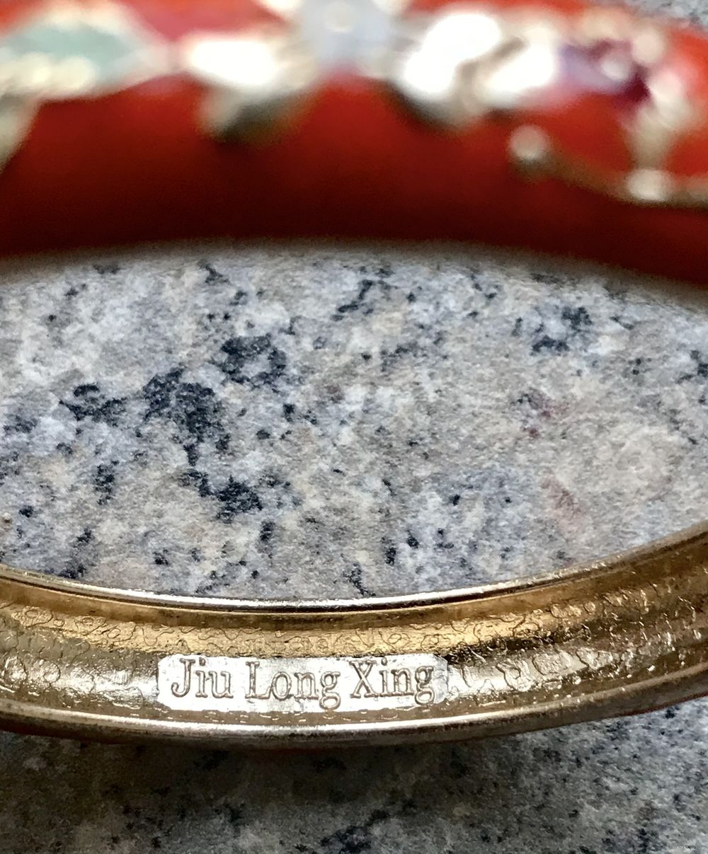 Винтажные браслеты - clamper от Jiu Long Xing. Выполнены из металла золотого тона. Декорированы цветной эмалью. Высота каждого браслета 0,9см., вн. диаметр 6см. Маркированы. Состояние хорошее.
