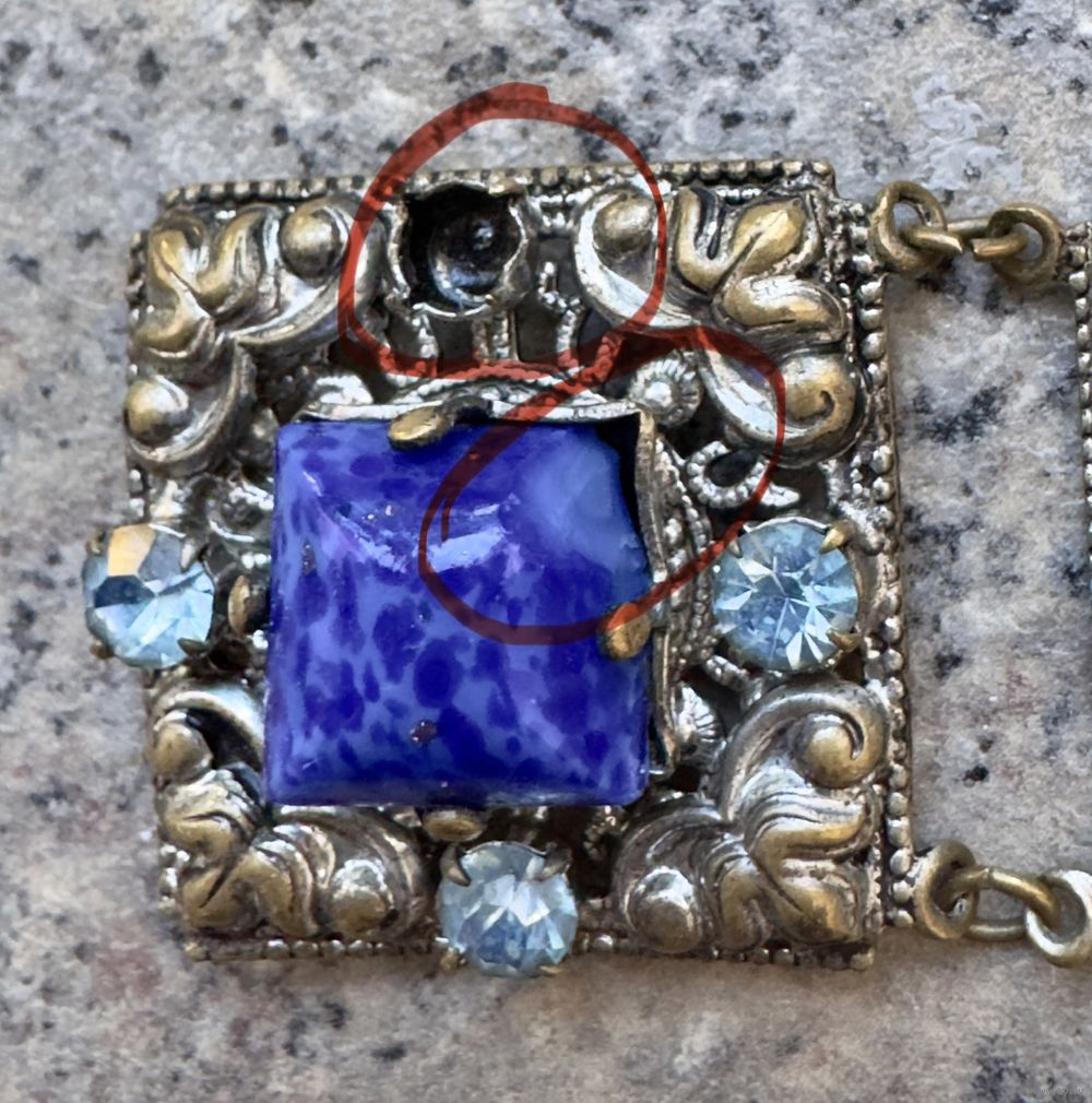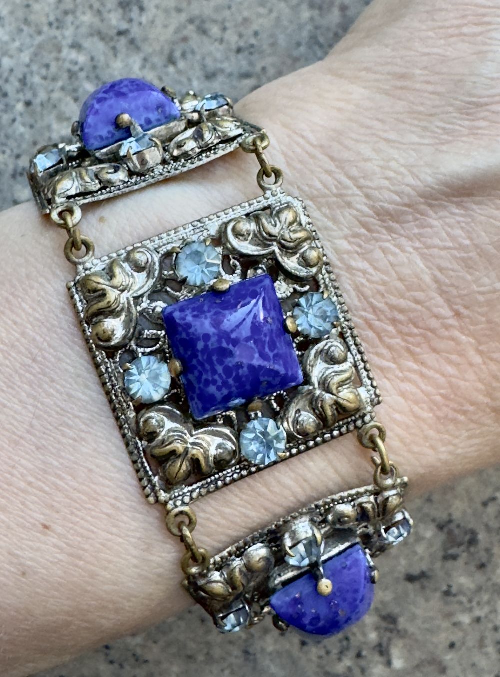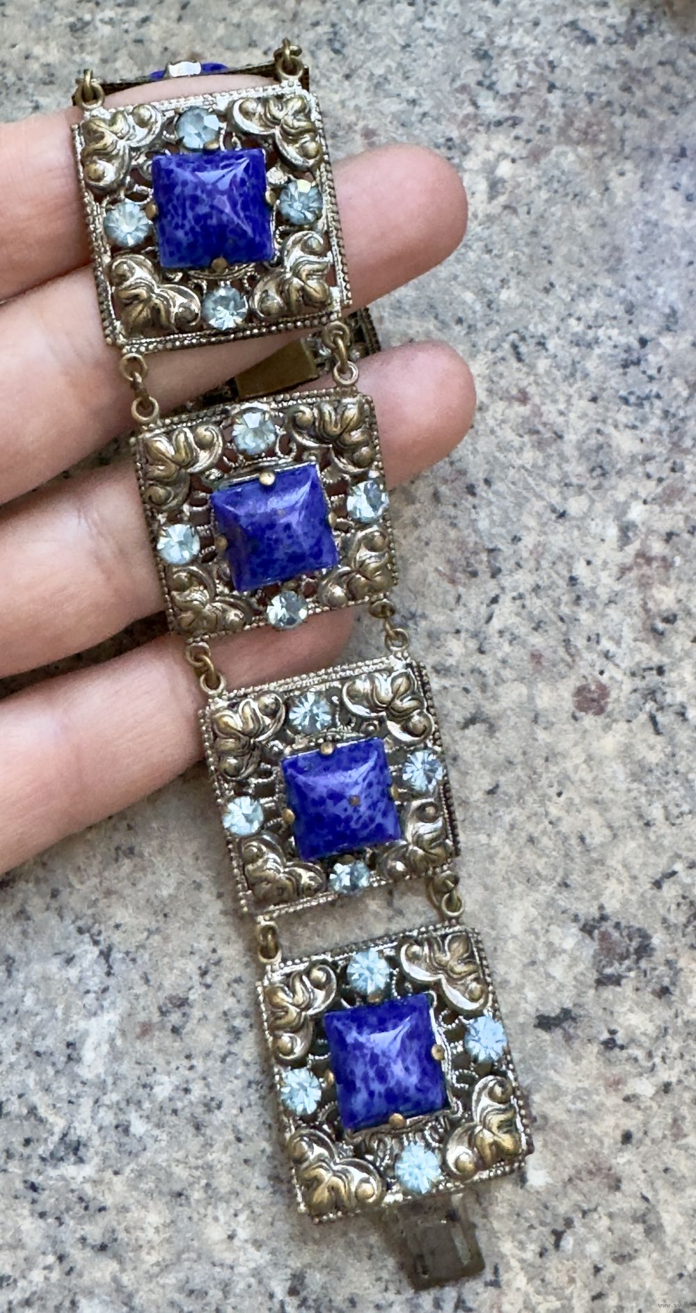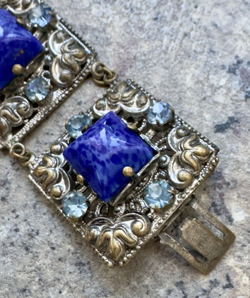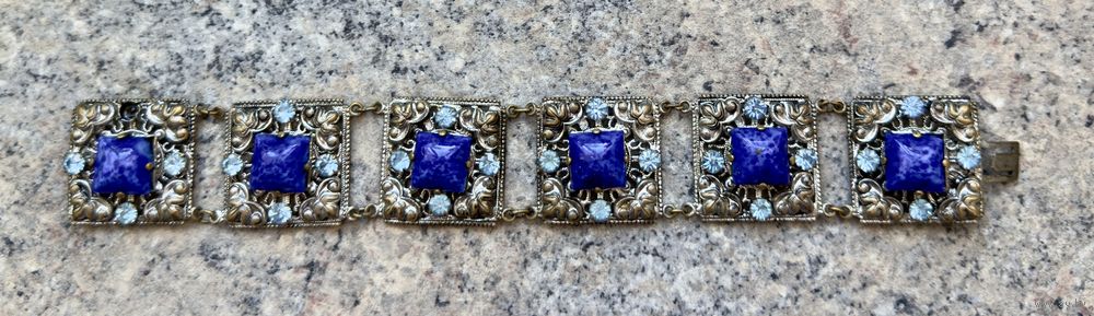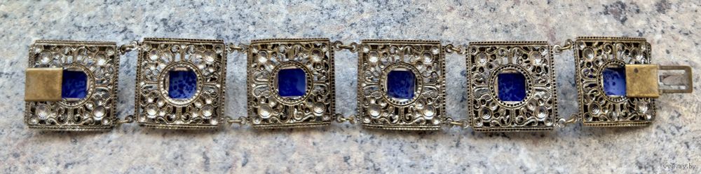 Браслет (Чехословакия 60-е гг. ) выполнен методом штампования из латуни под филигрань, вставки- художественное стекло и кристаллы. Длина браслета 19,5см.,высота 2,7см. Не хватает одного кристалла и на одной вставке из худ.стекла есть скол. Все нюансы учтены в цене.