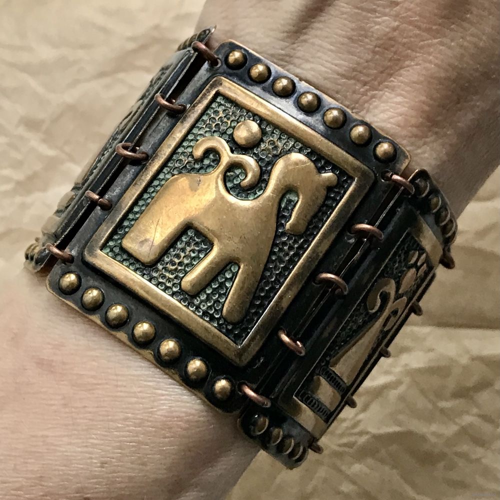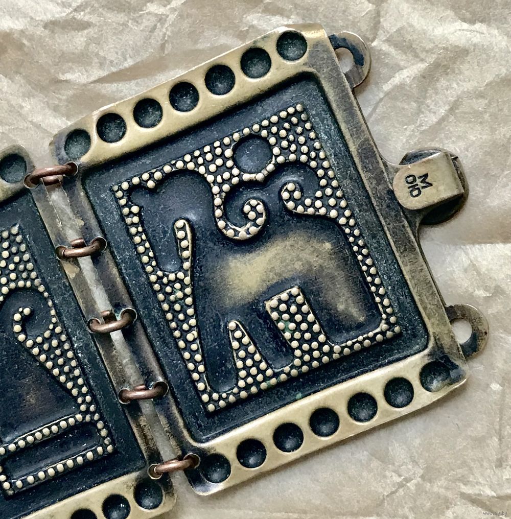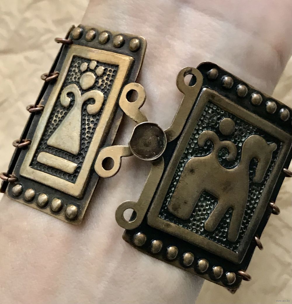 Крупный винтажный браслет из латуни. Сделан в период СССР в мастерской «Одесский ювелир». Стоит клеймо МОЮ. Длина браслета 19,5см., высота 4,5см. Состояние хорошее. Редкий экземпляр.