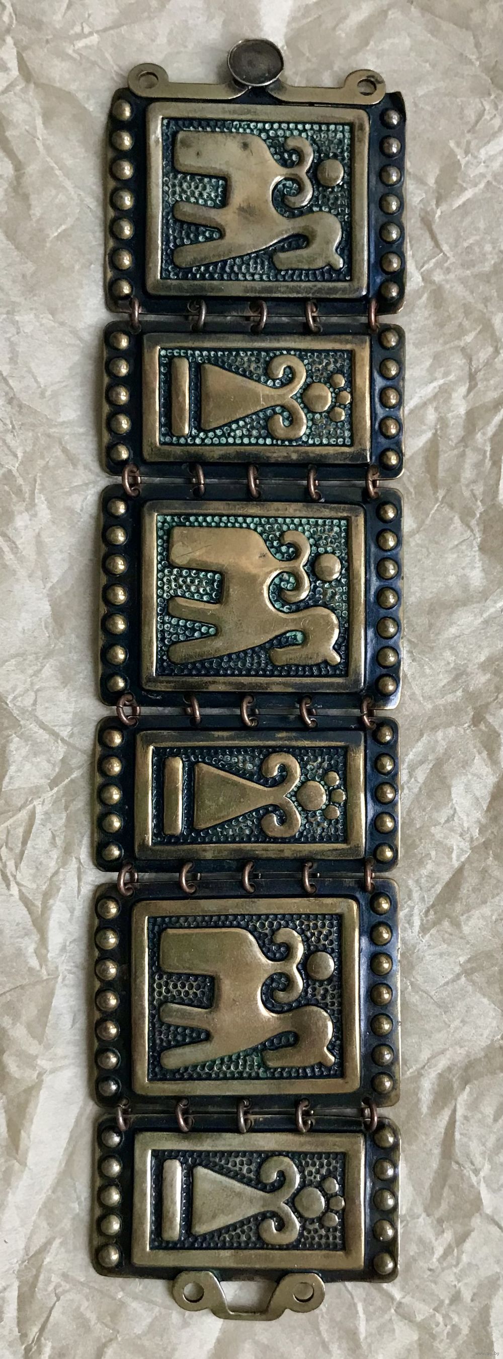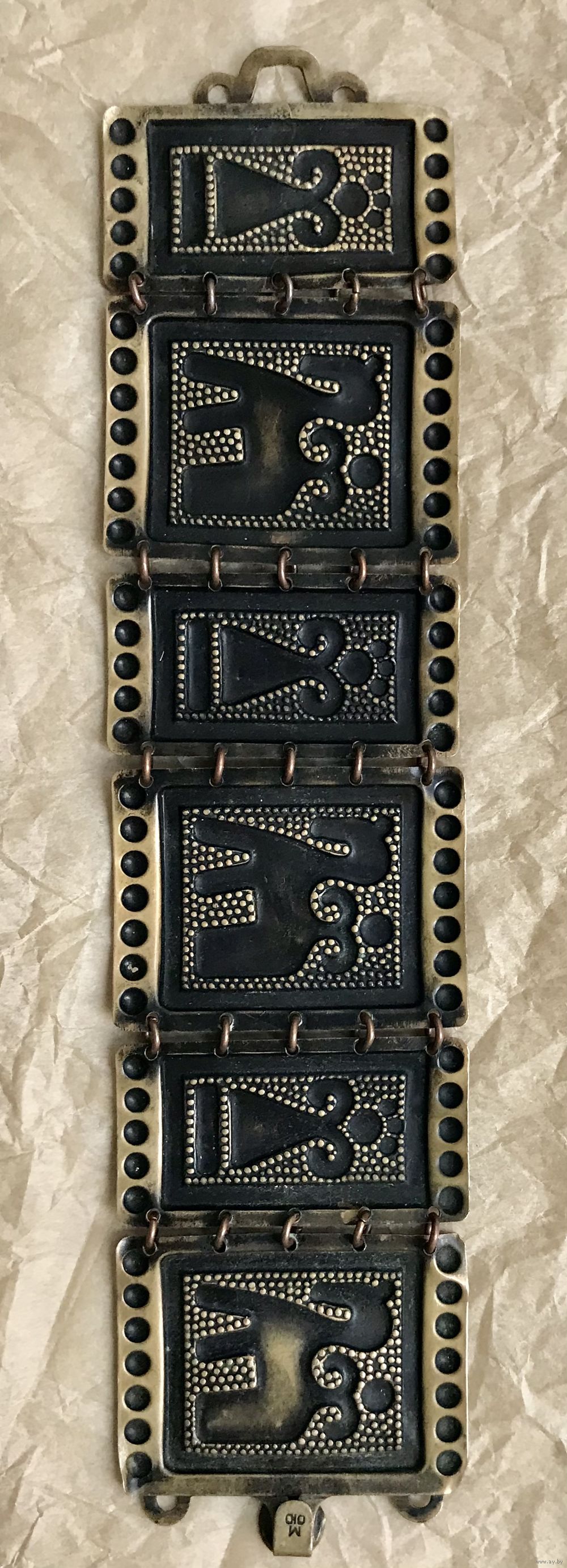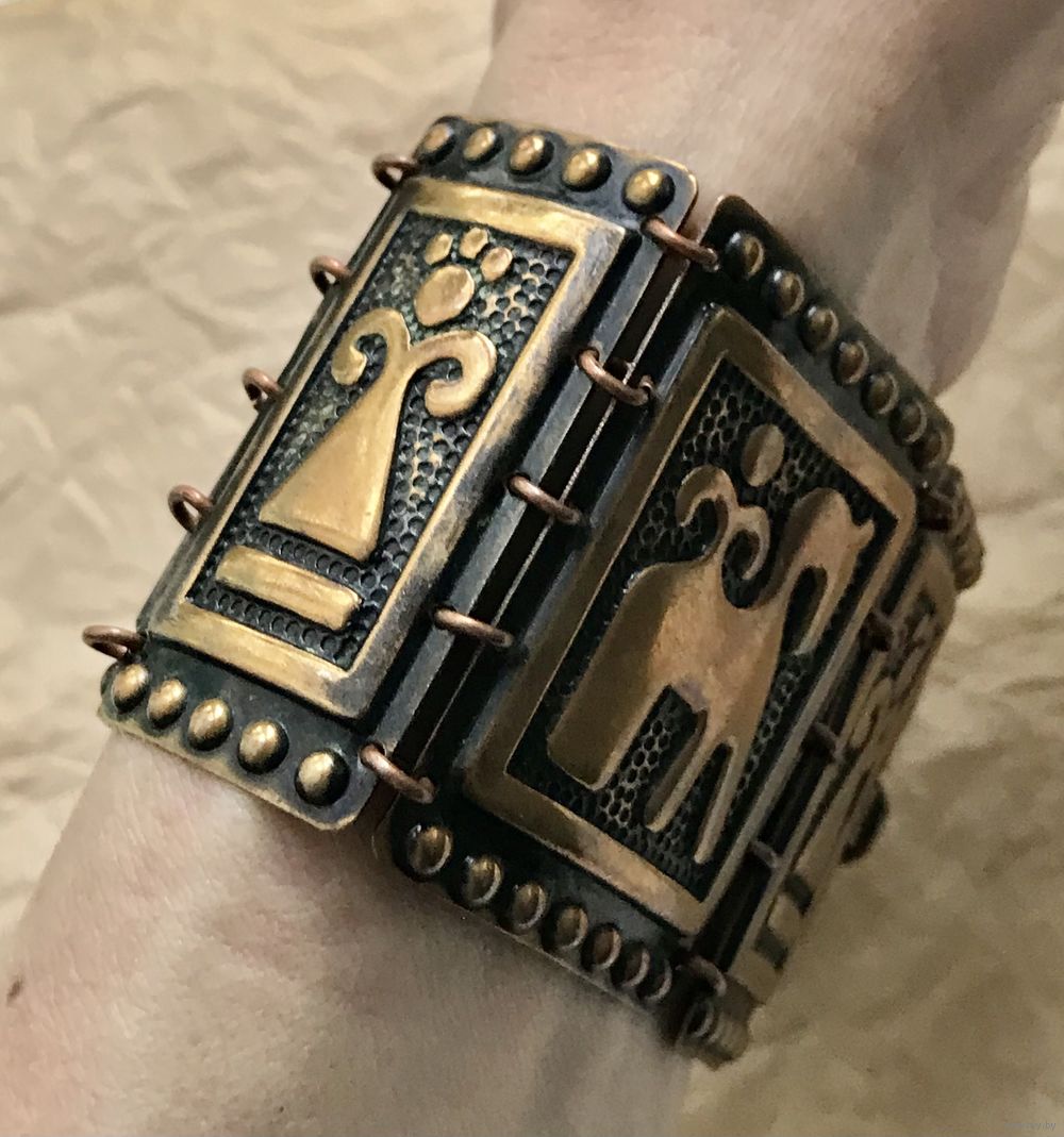 Крупный винтажный браслет из латуни. Сделан в период СССР в мастерской «Одесский ювелир». Стоит клеймо МОЮ. Длина браслета 19,5см., высота 4,5см. Состояние хорошее. Редкий экземпляр.