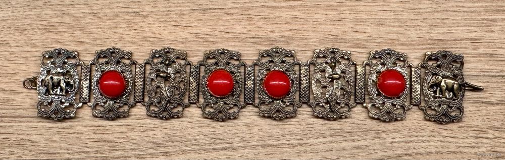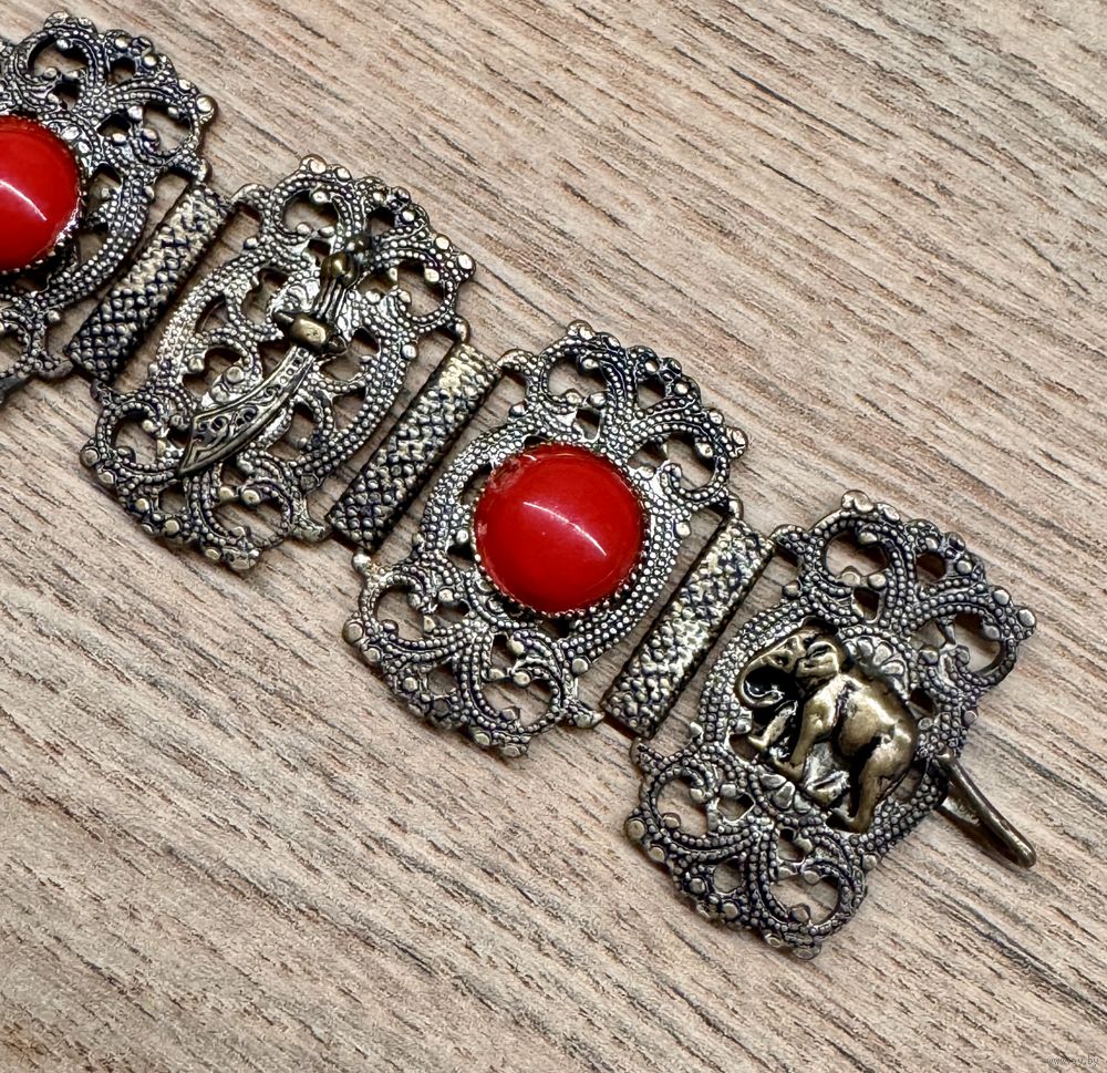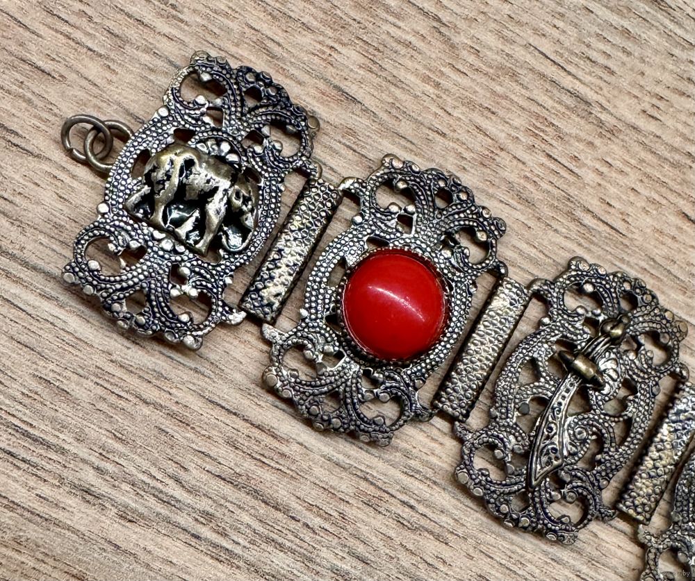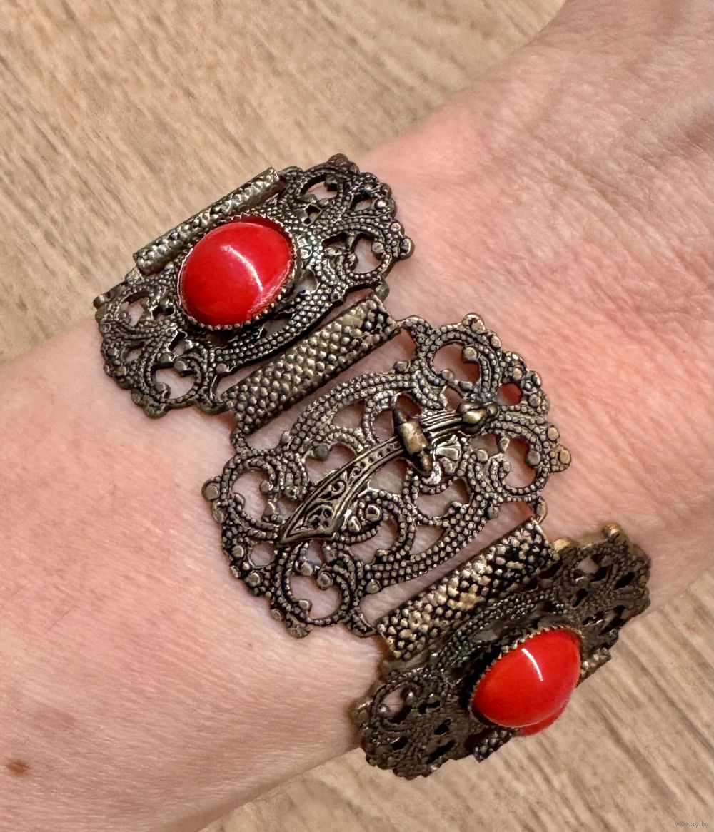 Винтажный браслет из металла серебристого тона с чернением, вставки из пластика красного цвета. Высота браслета 3см., длина 18,5см.