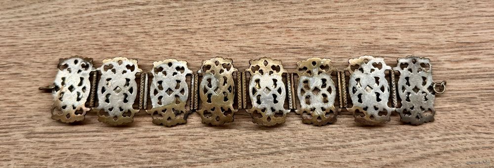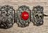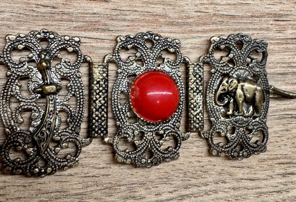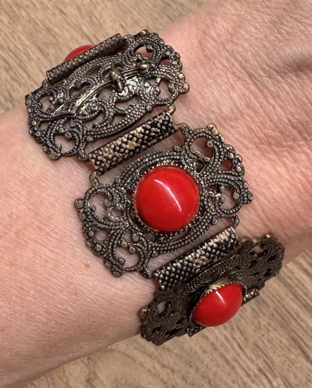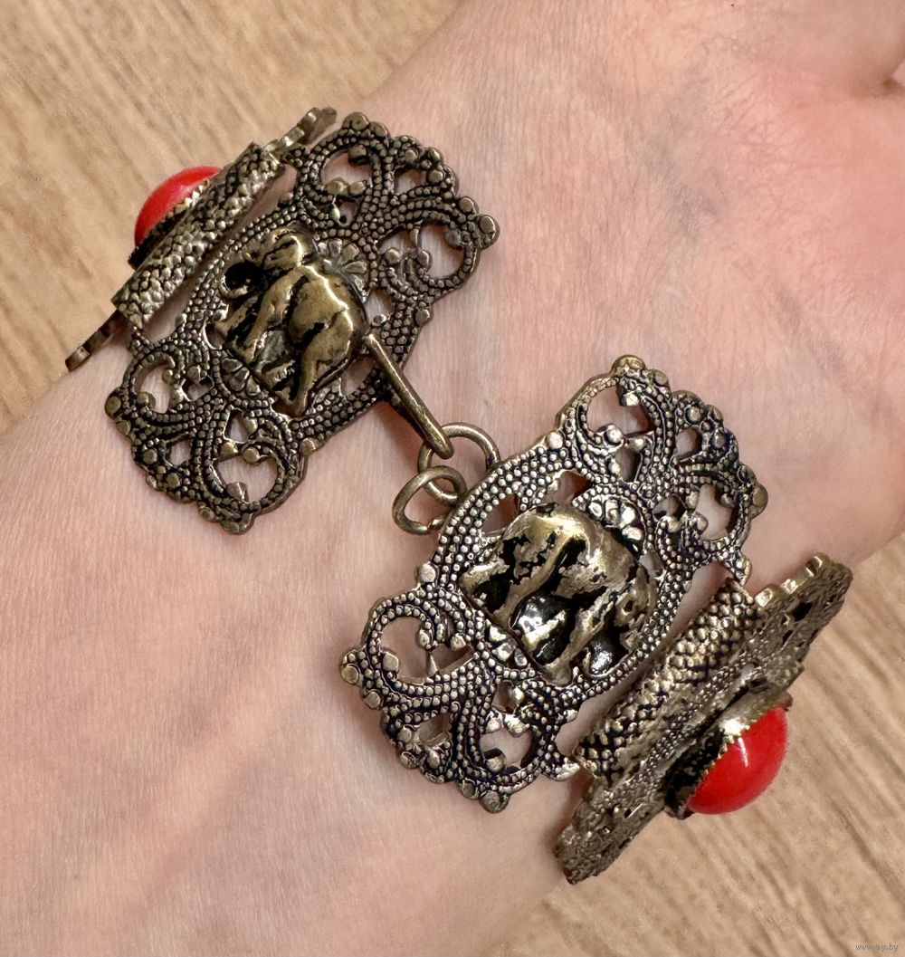 Винтажный браслет из металла серебристого тона с чернением, вставки из пластика красного цвета. Высота браслета 3см., длина 18,5см.