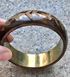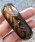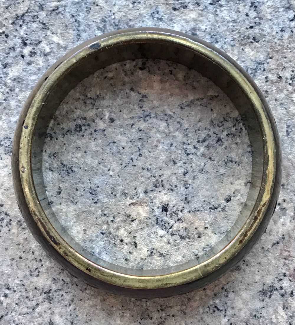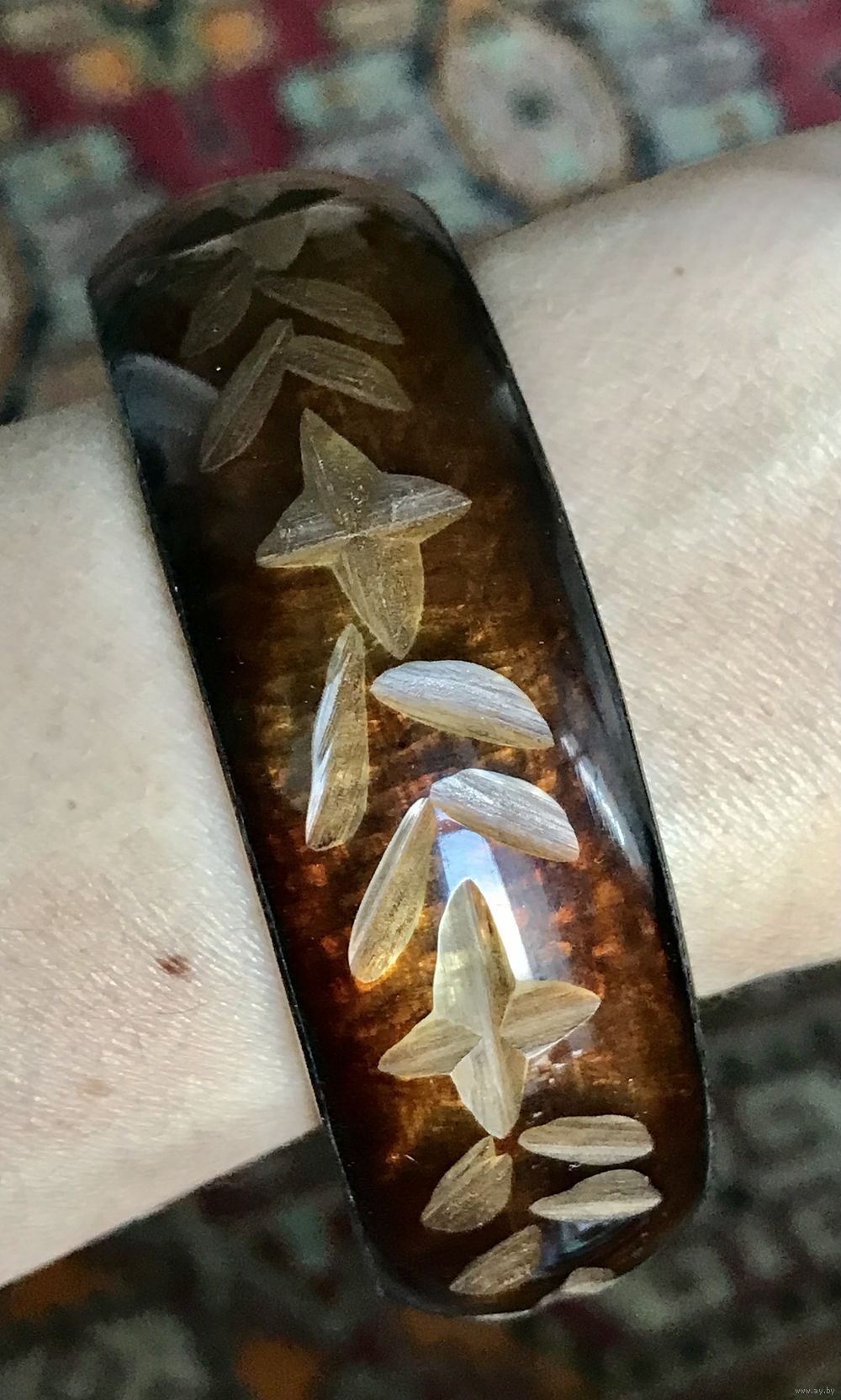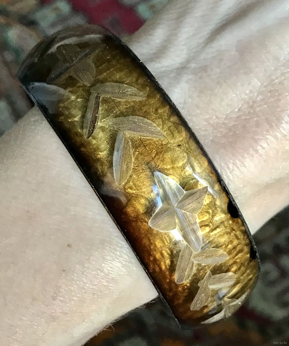 Винтажный браслет с основой из латуни, лицевая сторона украшена резным люцитом. Высота браслета 2,3см., вн.диаметр 6,5см. На металле местами есть небольшие потемнения. Общее состояние хорошее.