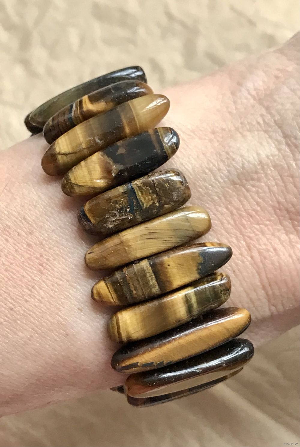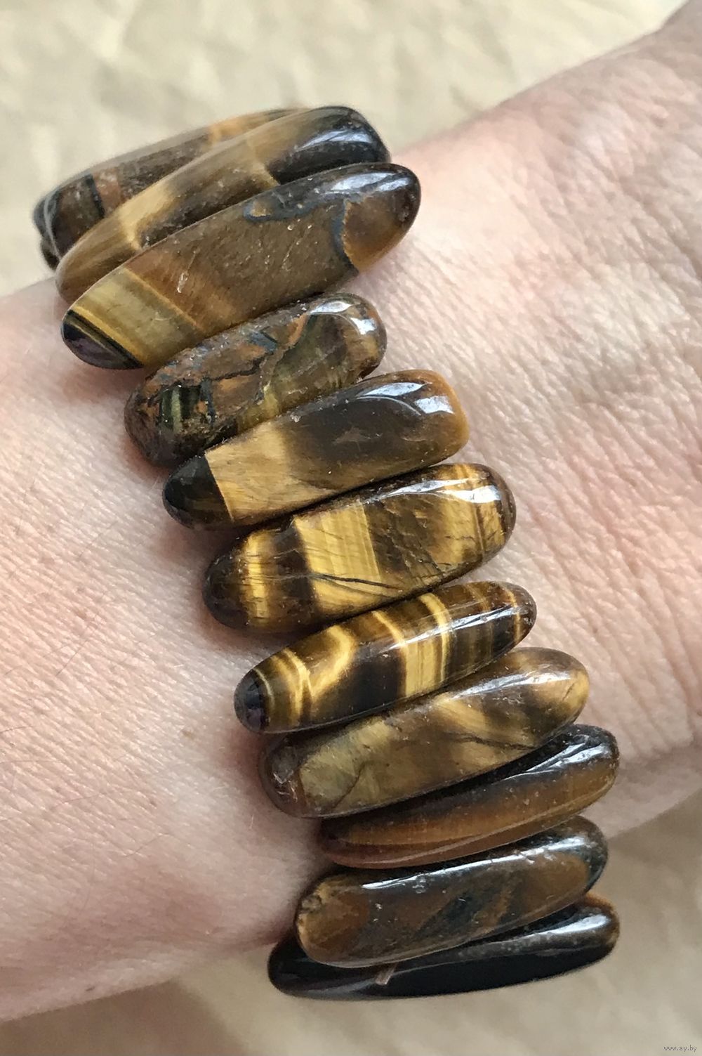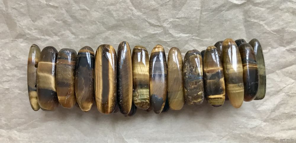 Браслет на резинке с бусинами из камня тигровый глаз. Высота бусин от 1,7 до 2,5см. Состояние хорошее.