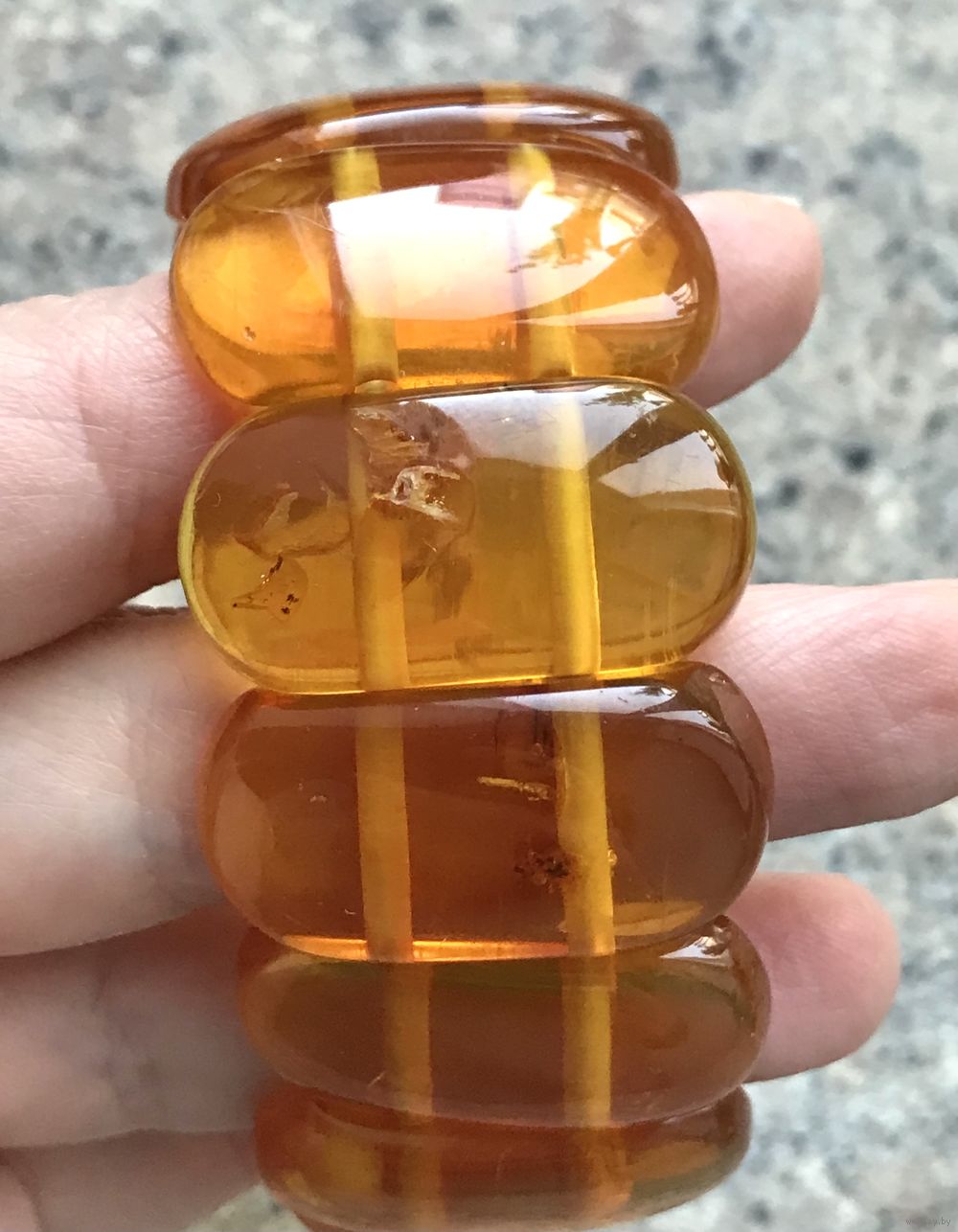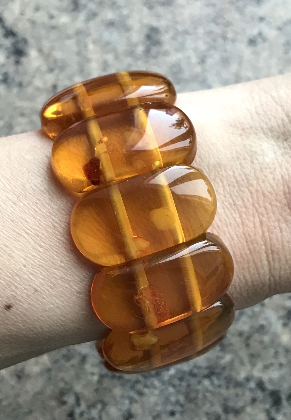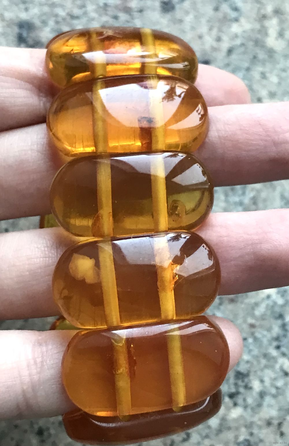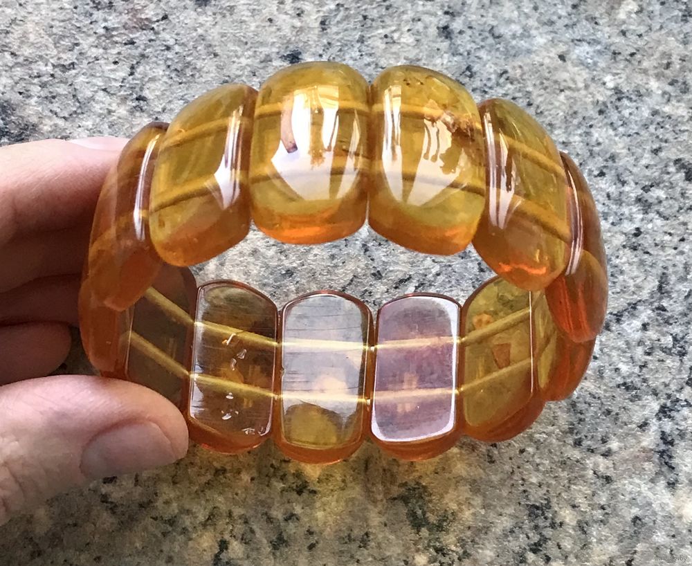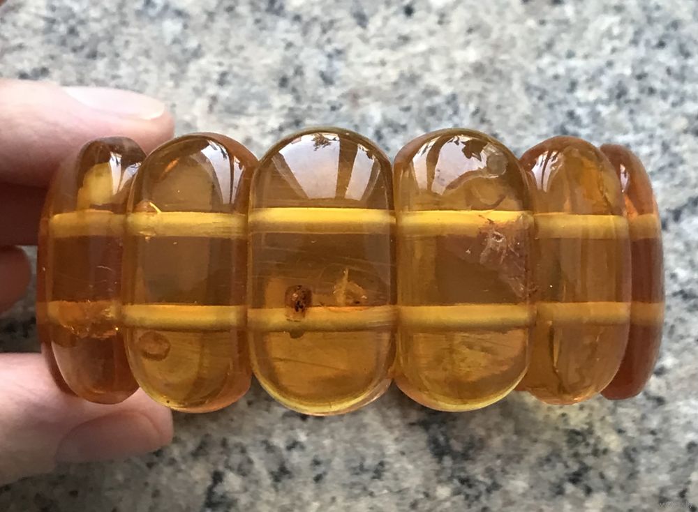 Винтажный крупный (высота 3см.) браслет скорее всего из плавленого янтаря. Размер пластин 3х1,5см. Браслет на резинке. На одной пластине есть незначительный скол.
