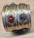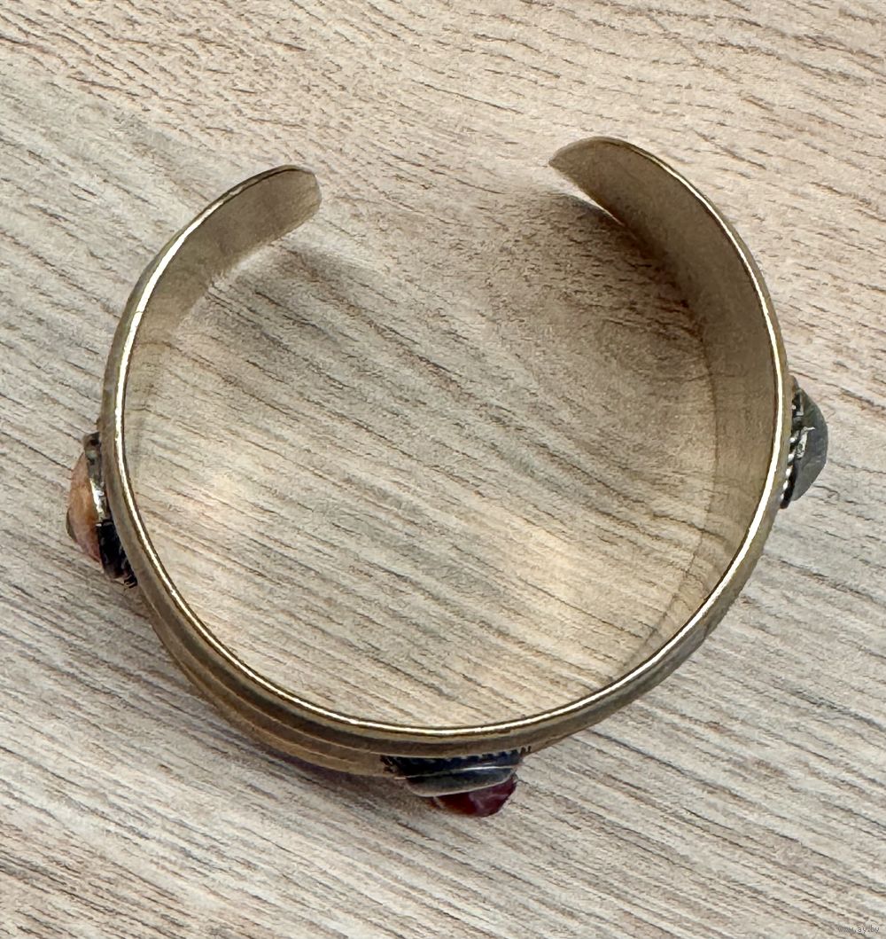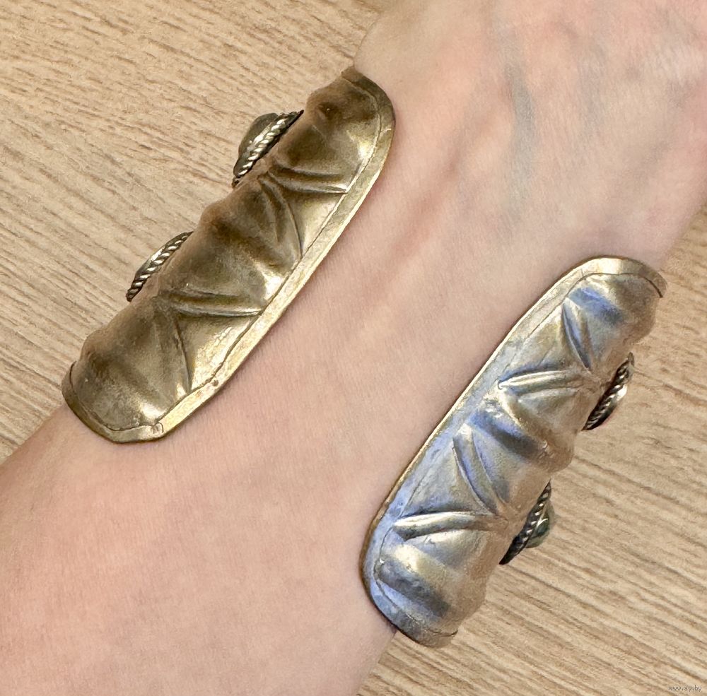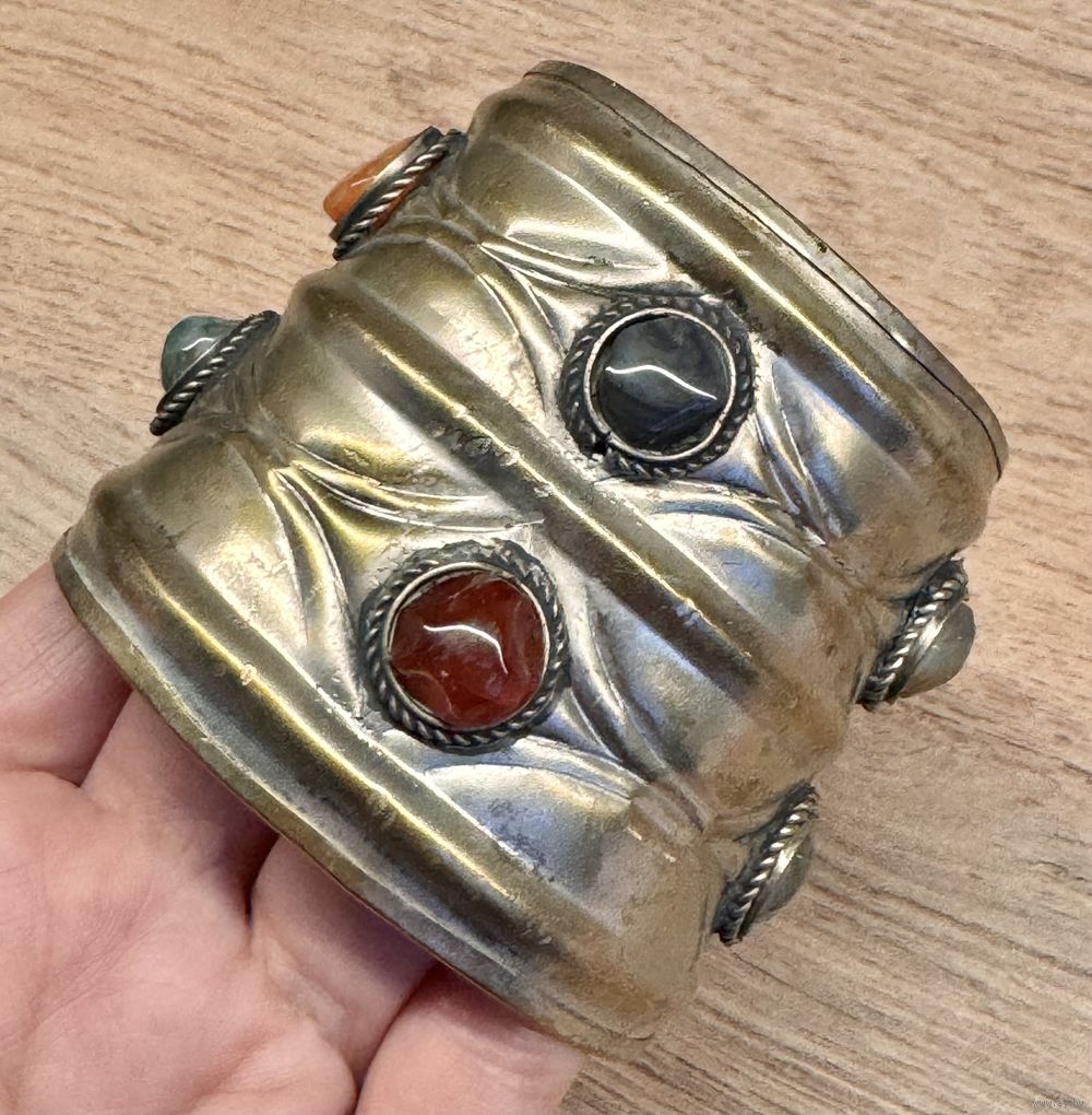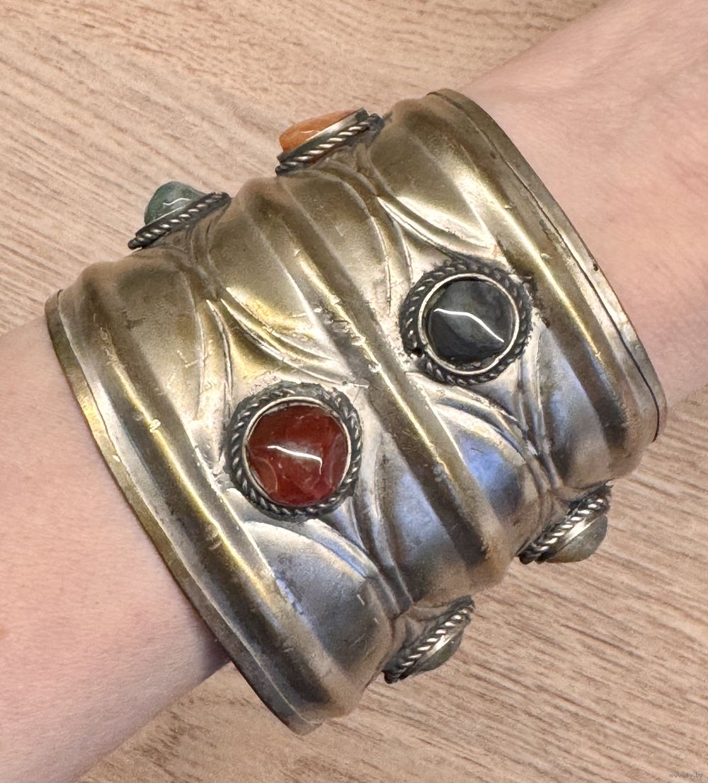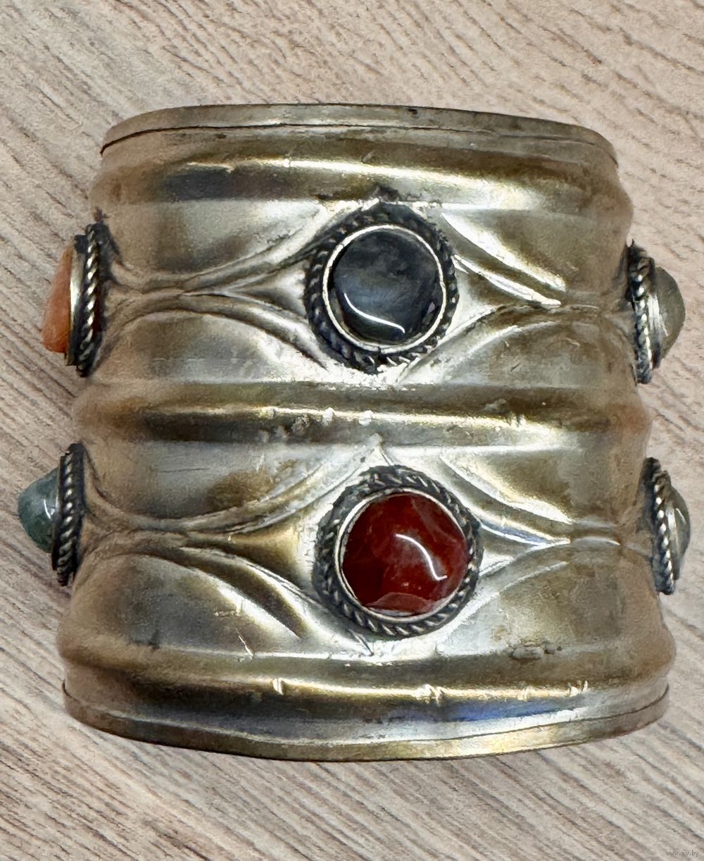 Винтажный высокий браслет в этническом стиле. Основа из латуни с серебрением, вставки из камней. На металле имеются потертости серебрения. Высота браслета 6,5см.
