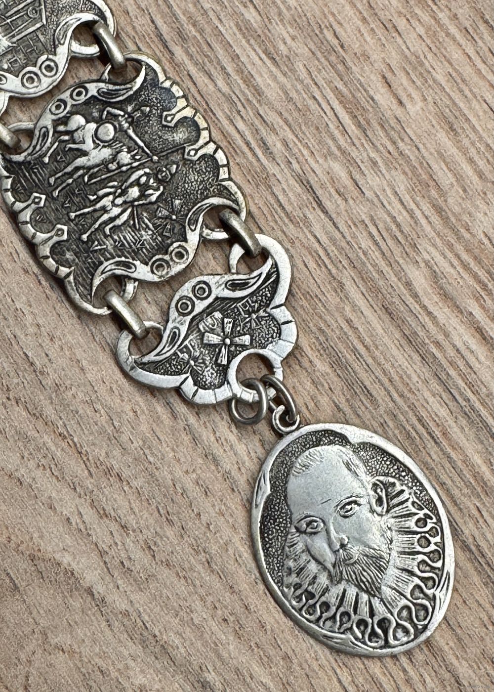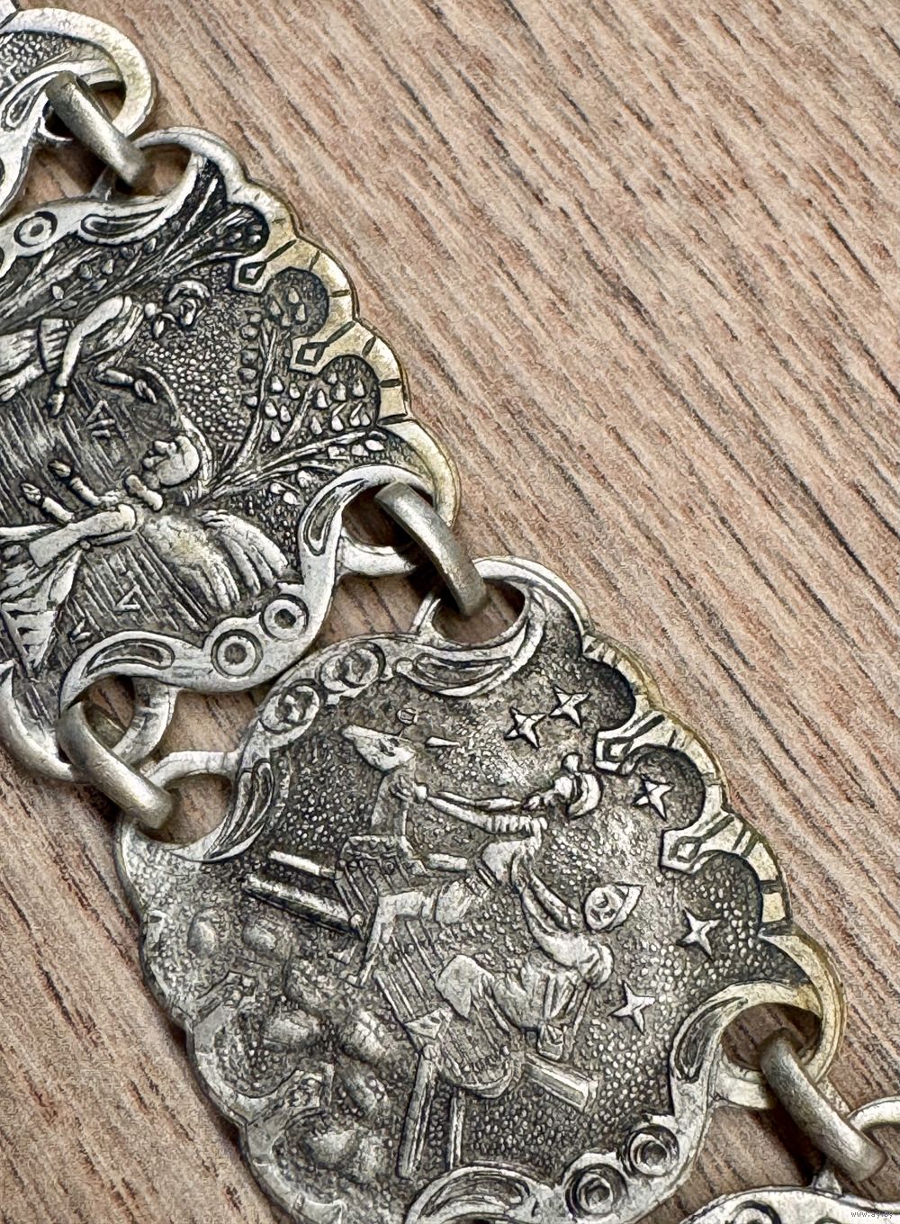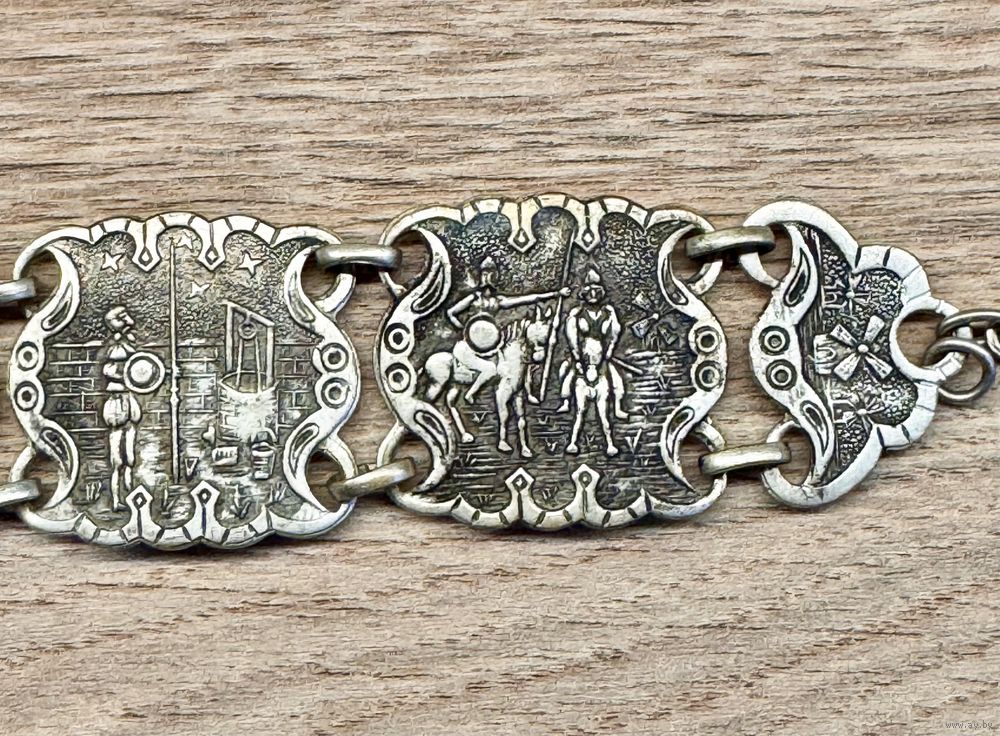 Винтажный крупный браслет с основой из латуни с серебрением. Браслет сделан по мотивам произведения испанского писателя Сервантеса «Дон Кихот из Ла-Манчи». Высота браслета 3см., длина 18,5см. На нескольких звеньях с лицевой стороны есть пожелтения на металле (этот момент учтён в цене). Сделан в Испании.