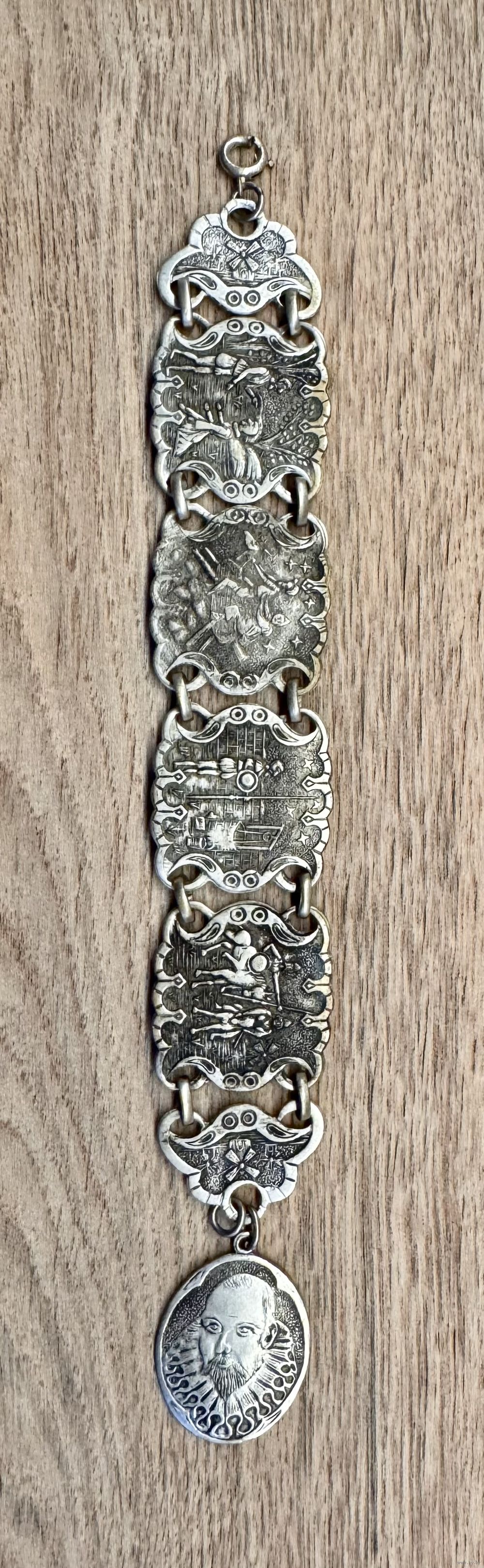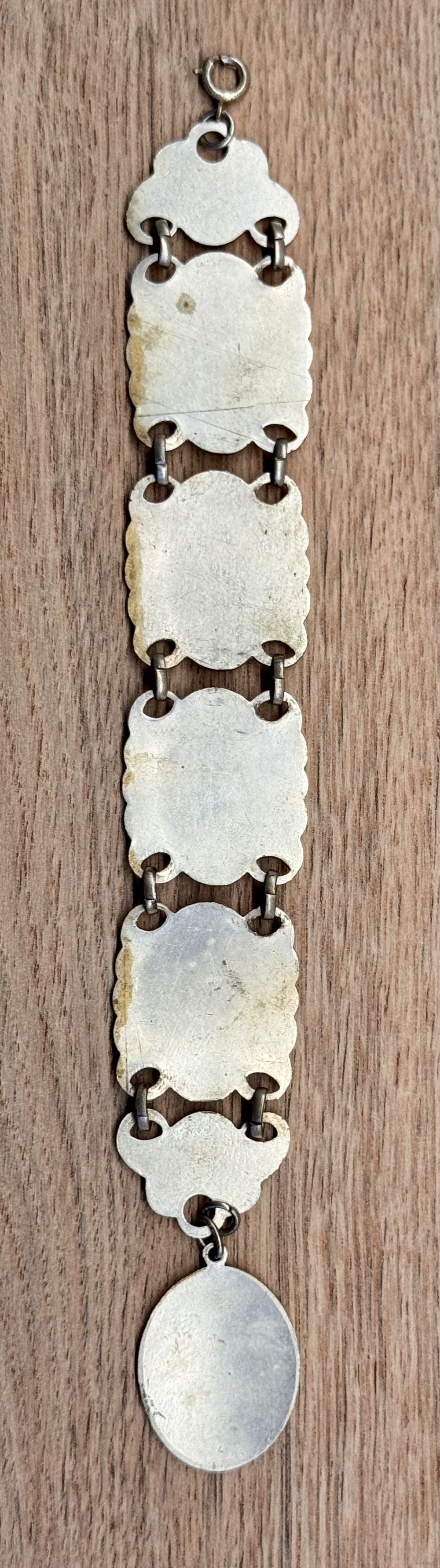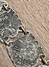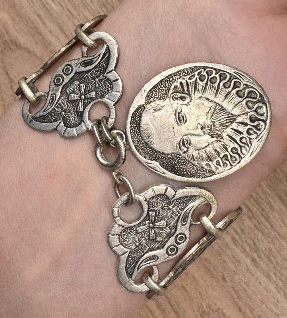 Винтажный крупный браслет с основой из латуни с серебрением. Браслет сделан по мотивам произведения испанского писателя Сервантеса «Дон Кихот из Ла-Манчи». Высота браслета 3см., длина 18,5см. На нескольких звеньях с лицевой стороны есть пожелтения на металле (этот момент учтён в цене). Сделан в Испании.