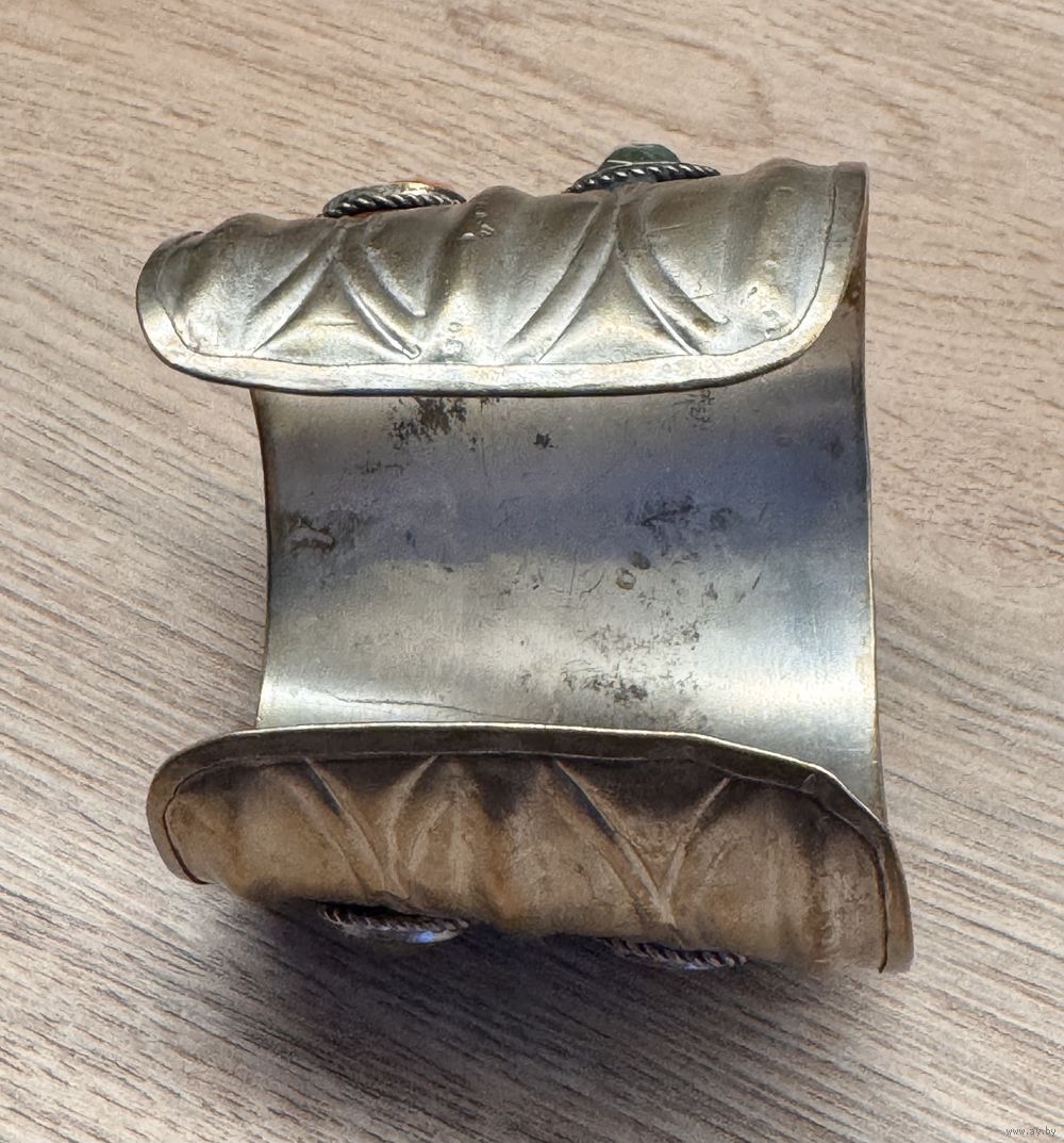 Винтажный высокий браслет в этническом стиле. Основа из латуни с серебрением, вставки из камней. На металле имеются потертости серебрения. Высота браслета 6,5см.
