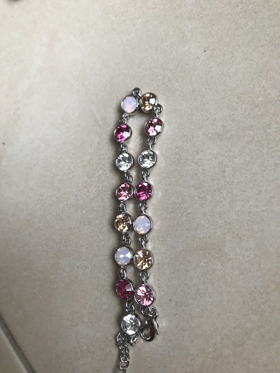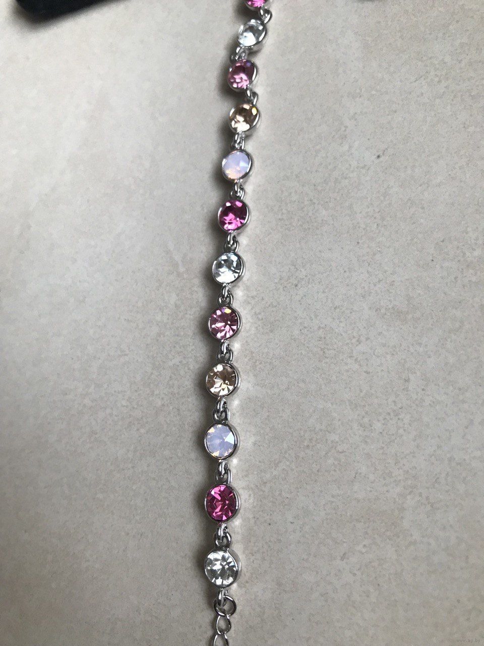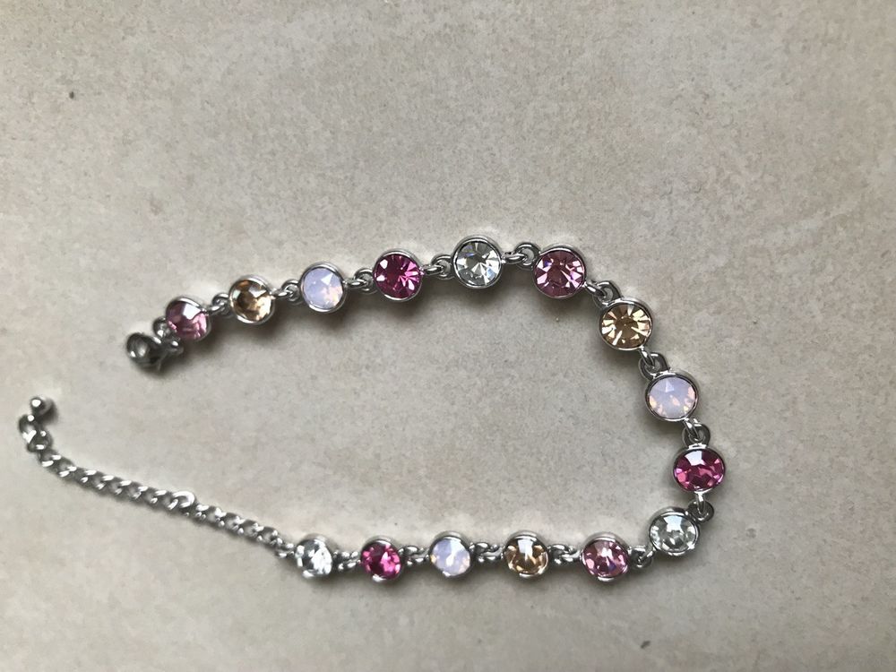 Дизайн: Классическая «дорожка» из сверкающих кристаллов круглой огранки. Цветовая гамма: нежная палитра из розового, золотистого, белого опала и чистого прозрачного кристалла.