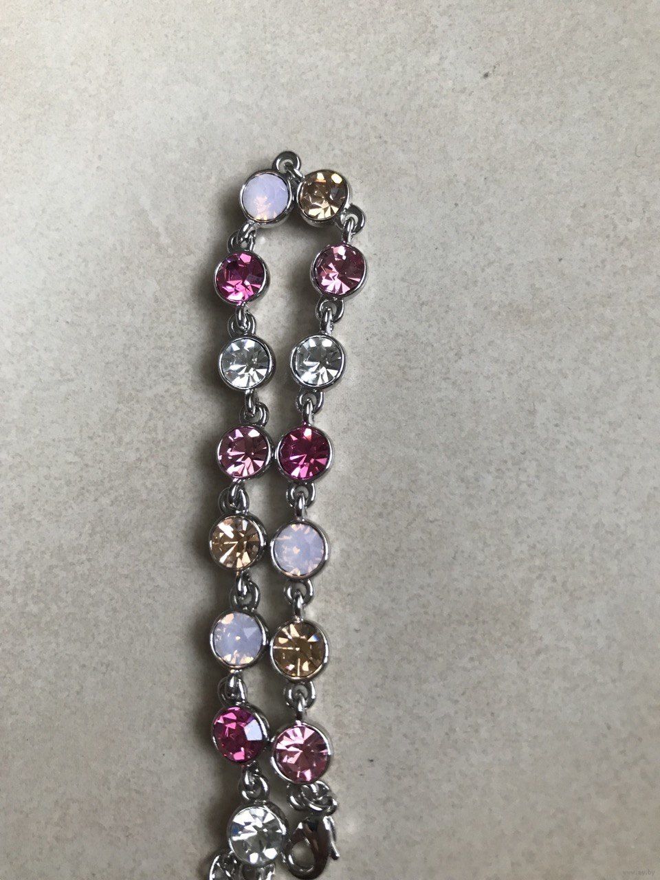 Дизайн: Классическая «дорожка» из сверкающих кристаллов круглой огранки. Цветовая гамма: нежная палитра из розового, золотистого, белого опала и чистого прозрачного кристалла.