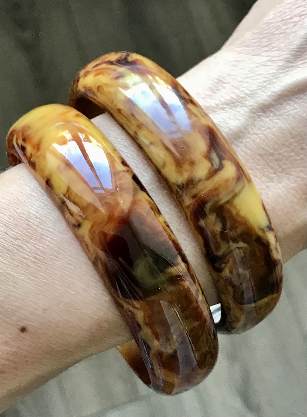 Винтажные браслеты из бакелита (тестированы). Вн.диаметр одного 6,5см., высота 1,7см., вес 32гр., вн. диамнтр второго 6,7см., высота 1,7см. Состояние хорошее.